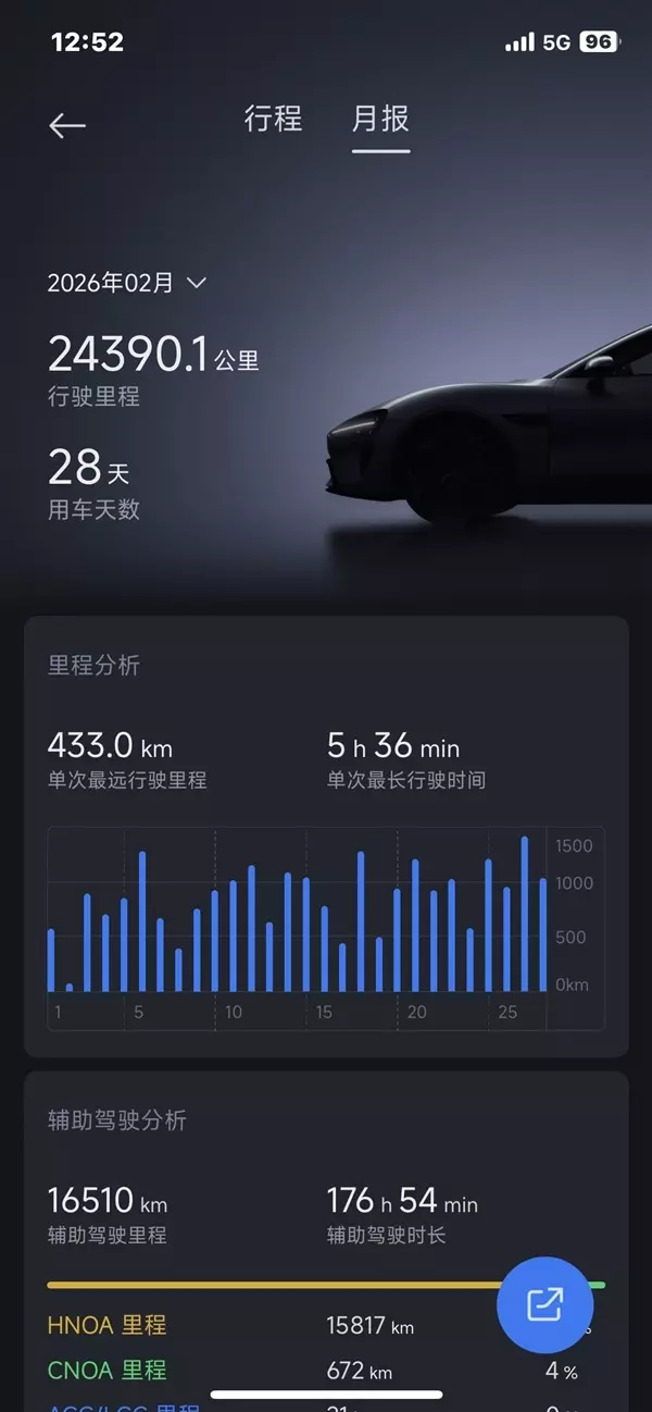 他晒出的2026年2月行车里程记录显示, 28天行驶里程高达24390公里,平均每天871公里!