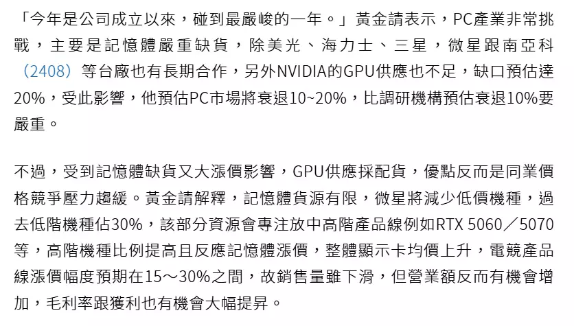 对于许多玩家来说,组装或购买一台PC已经变得难以承受。台湾《经济日报》报道了来自另一家制造商的更多坏消息。为应对内存短缺,微星计划将其游戏笔记本电脑和显卡价格上调15-30%。该公司将优先保障高端产品,并增加AI服务器的产量。