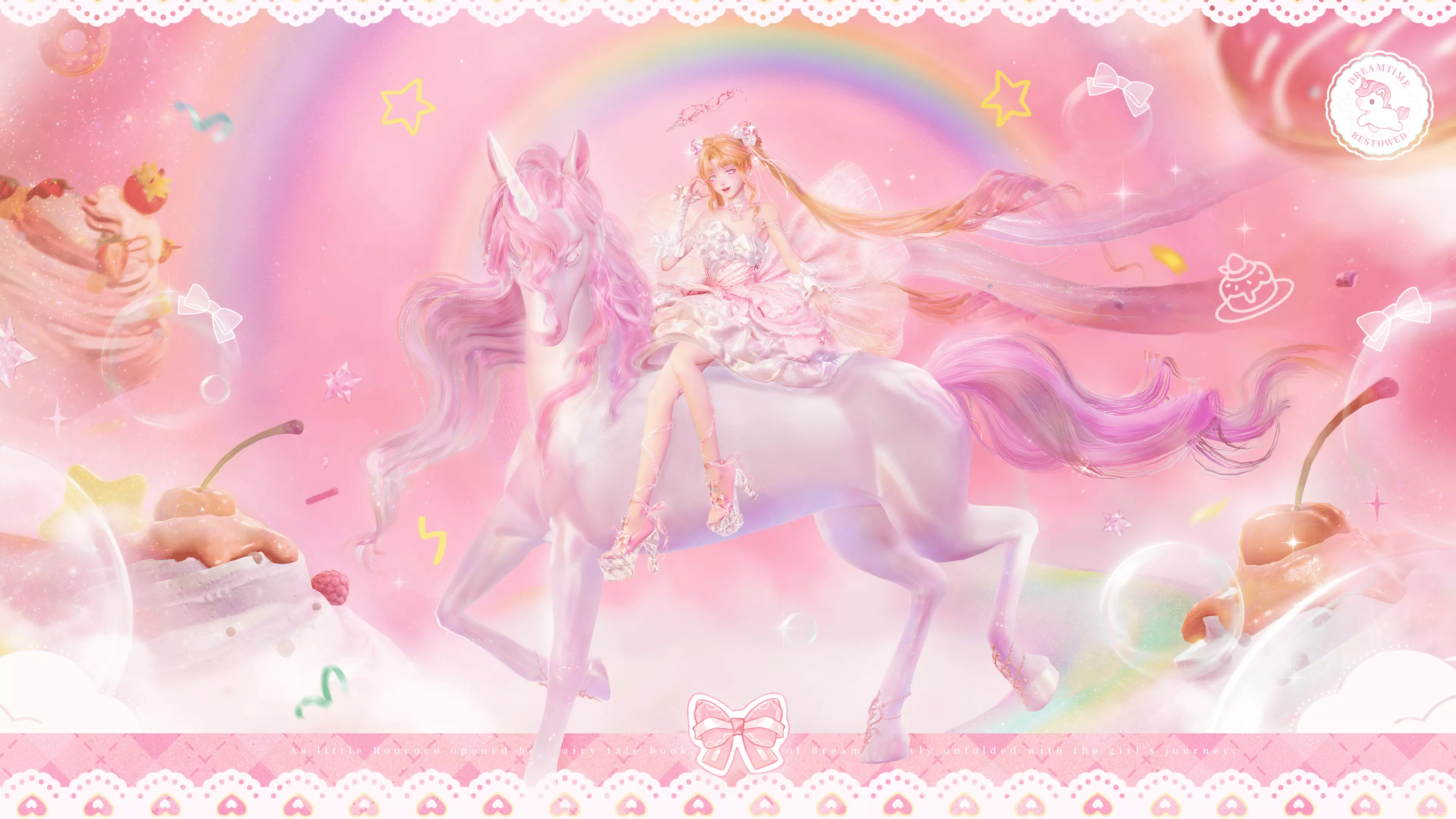 能力设计理念 一位甜美童话风偶像会拥有怎样的坐骑呢?那一定是独角兽——梦想与奇幻的化身! 它不仅是旅途的伙伴,更拥有与偶像相匹配的魅力。它天生热爱装扮:纤长颤动的睫毛勾勒出温柔的目光,额间糖果般光滑的独角闪耀着光芒,鬃毛如糖丝般卷曲。就连它的皮毛也闪烁着彩虹般的光泽,散发着诱人的甜蜜气息。这只迷人的独角兽迈着优雅轻盈的步伐向她走来。它们以屈膝礼相互问候,踏着完美的节奏共舞,当它们并肩出发时,身后留下一串彩虹糖果般的闪光轨迹。