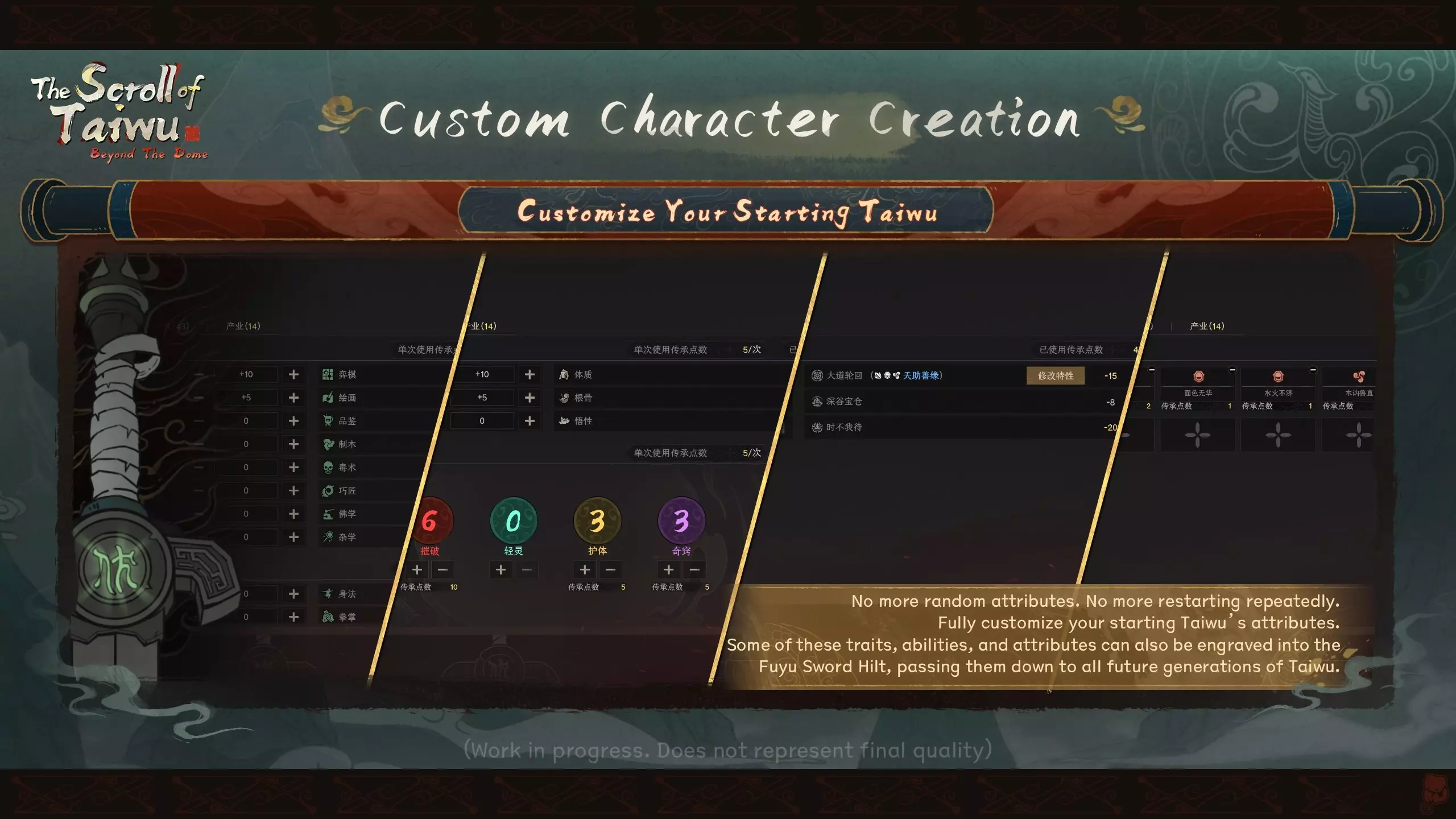 七、自定义角色创建 自定义初始太吾 告别随机属性,无需反复重开。 可完全自定义初始太吾的各项属性。 部分特质、能力与属性还可铭刻于浮玉剑柄,传承给后世所有太吾。