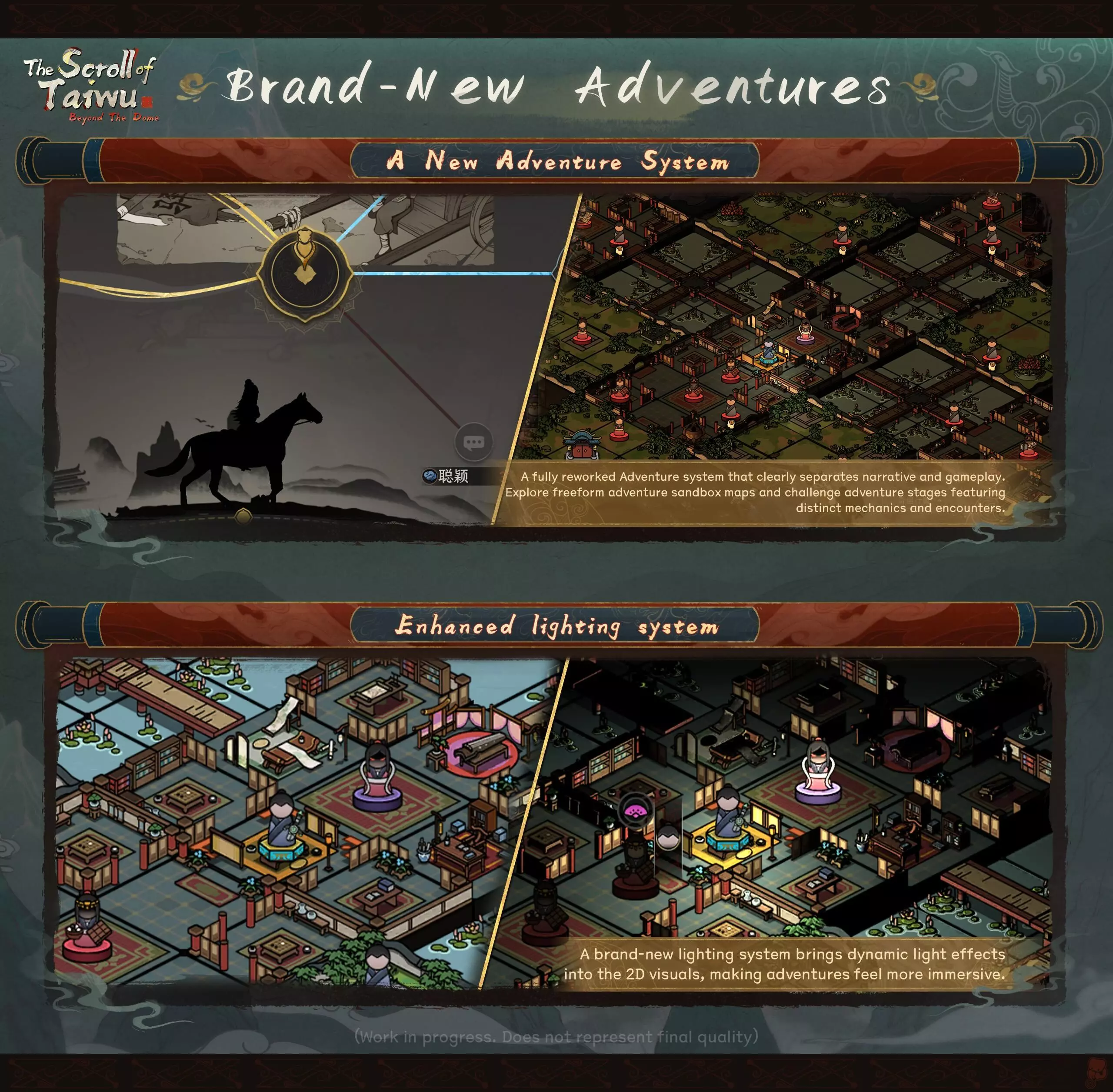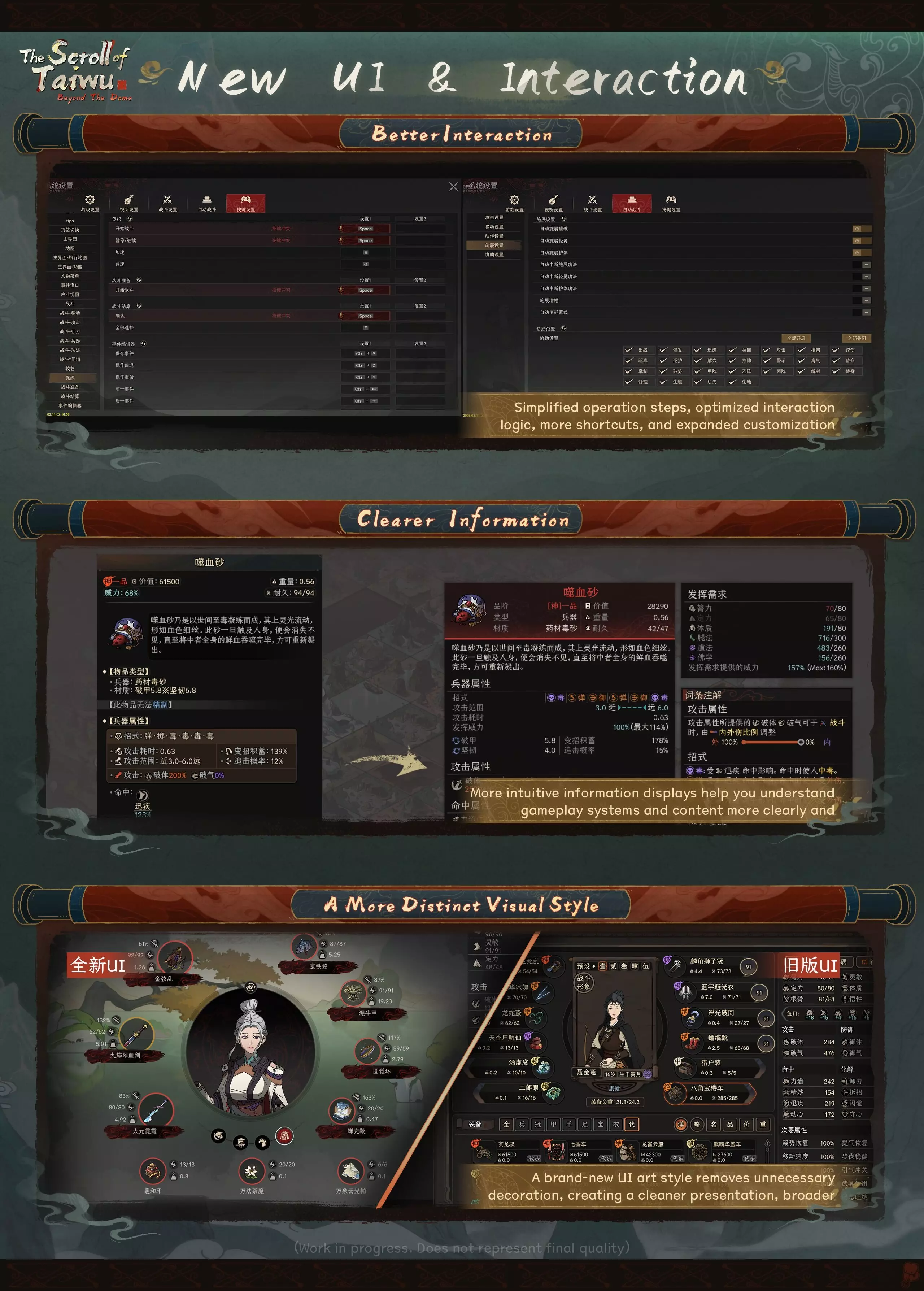 致各位玩家的一封信 大家好, 我是茄子——很高兴能通过这封信与大家再次见面。 距离我们上次详细向大家介绍《太吾绘卷》正式版的游戏内容规划,已经过去三个月了。在这三个月里,团队的每一位成员都在各自的岗位上不懈努力,投入了大量时间。毕竟,将我们与各位一同构建的太吾世界圆满完成,一直是我们共同的心愿。 回首过去八年的开发历程(对于那些从最初就参与其中的成员而言,已是十一个年头),我们始终专注于同一件事:与各位一同不断创作和完善太吾世界。我们始终将玩家的游戏体验和游戏质量置于首位。 为坚守这一原则,在此我必须向各位致以最诚挚的歉意:我们将把《太吾绘卷》完整版的发布时间推迟至6月17日。 在过去的三个月里,我们此前向大家预告的所有内容均按原计划推进。但随着完整版内容量的大幅增加,以及开发环境的变化,《太吾绘卷》的测试难度呈指数级上升。太吾世界广阔且高度开放,仅完成一次完整的测试周期就需要整整一周时间。此完整版的发布承载着我们与玩家共同八年的心血,以及我们十多年的人生。经过慎重考虑,我们认为坚守原则是唯一负责任的选择。我们需要额外时间来排查潜在问题,并进一步完善游戏体验的细节。 再次为让大家多等待两个月致以诚挚的歉意。为弥补这份失望,当完整版推出时,我们将为大家准备一份额外的纪念性免费DLC。 以下是我们特别兴奋与大家分享的内容:过去三个月的部分开发成果! 一、主线剧情 更多动画过场 更多关键剧情时刻将通过动画CG序列呈现,增强故事叙述,带来更具沉浸感的游戏体验。 新挑战 神秘的穹顶追随者、因相枢污染而生的三途魔以及十二位独特的新对手正等待着你。 直面并击败他们,吸收其真气,将其转化为全新的魔功武学。