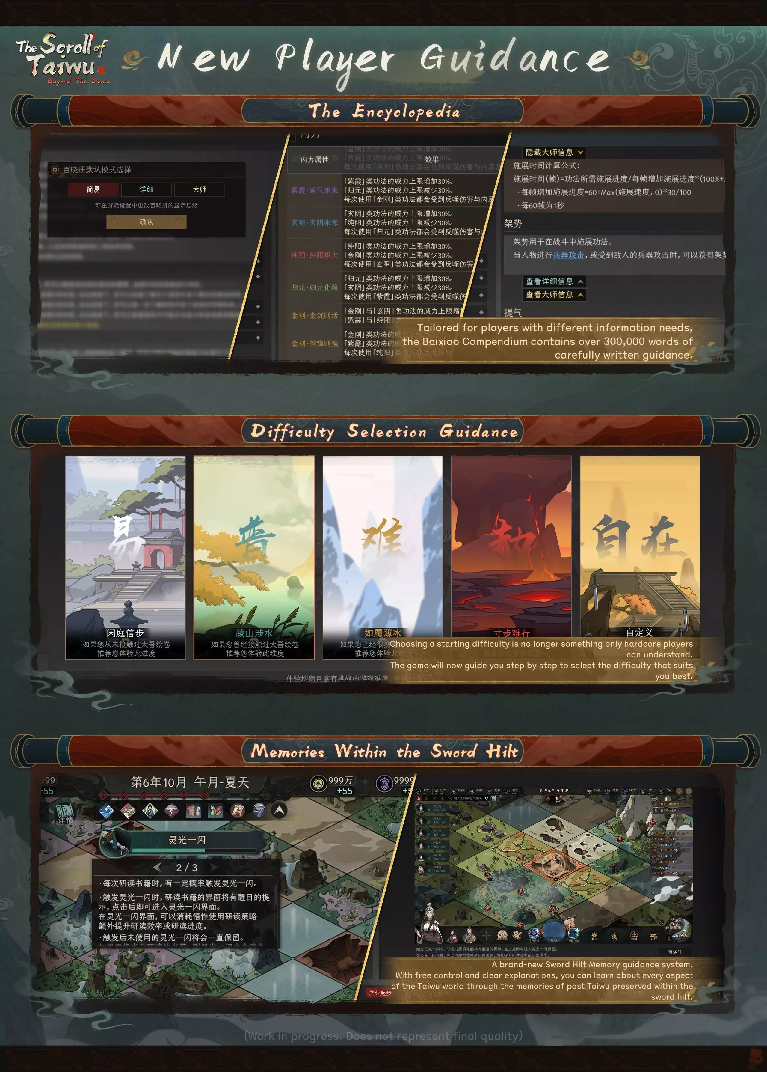 V. 新玩家引导 【百科全书】 为满足不同信息需求的玩家,【百晓全书】包含超过30万字的精心撰写引导内容。它是各个阶段玩家的太吾综合百科。 【难度选择引导】 选择初始难度不再是只有核心玩家才能理解的事。游戏现在会逐步引导你选择最适合自己的难度。 【剑柄中的记忆】 全新的【剑柄记忆】引导系统。通过保存在剑柄中的历代太吾记忆,你可以自由掌控并清晰了解太吾世界的各个方面。