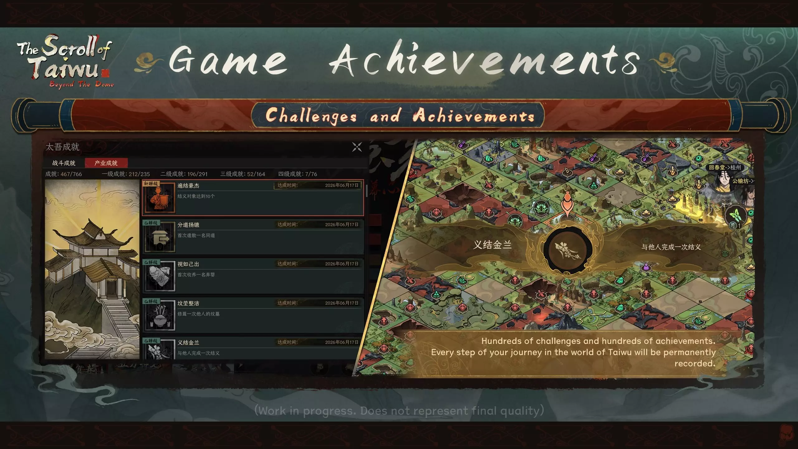 VIII. 游戏成就 挑战与成就 数百项挑战与数百个成就。 您在太吾世界中的每一步旅程都将被永久记录。