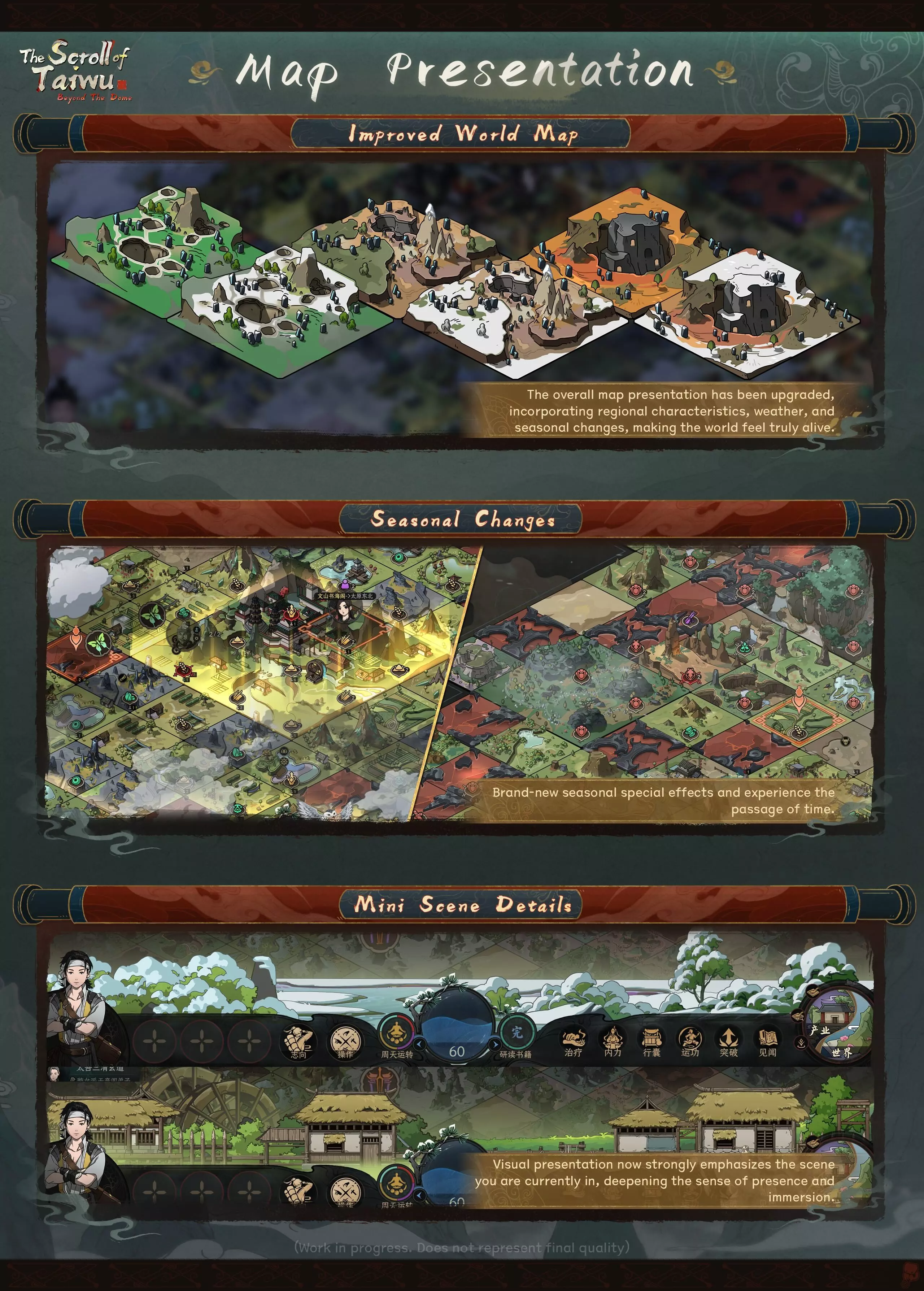IV. 地图呈现 改进的世界地图 整体地图呈现已升级,融入了地区特色、天气和季节变化,让世界更具真实感。 迷你场景细节 视觉呈现现在着重强调当前所在场景,增强了存在感和沉浸感。