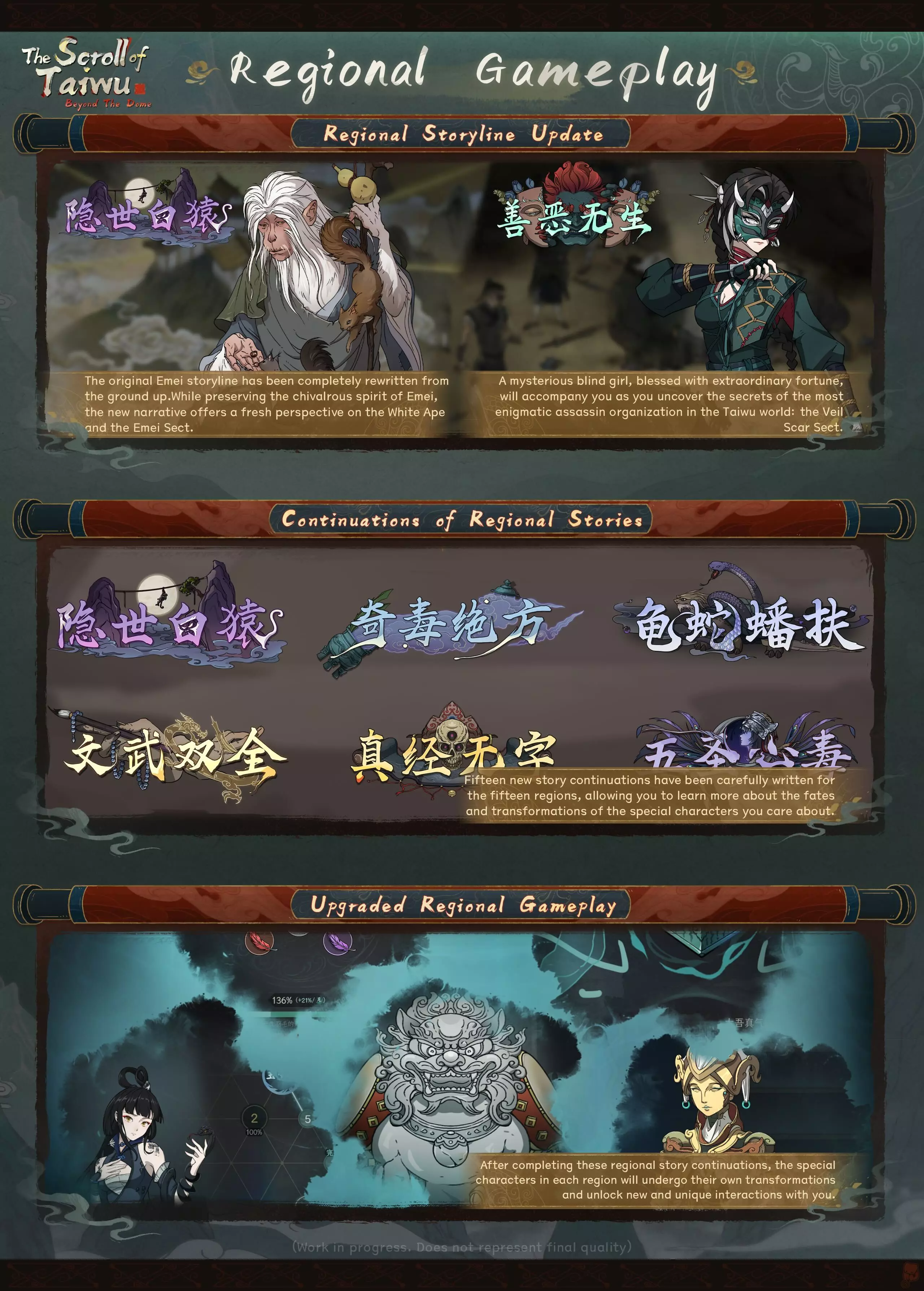 II. 地区玩法 峨眉派剧情 峨眉派原有剧情已彻底重写。在保留峨眉侠义精神的基础上,新剧情将以全新视角展现白猿与峨眉派的故事。 面痕宗剧情 一位身负异禀的神秘盲女将与你同行,一同揭开太吾世界中最神秘的杀手组织——面痕宗的秘密。 地区剧情延续 为十五个地区精心撰写了十五个全新的剧情延续,让你能进一步了解所关注的特殊角色的命运与转变。《太吾绘卷》区域玩法升级 完成这些区域故事的后续内容后,各区域的特殊角色将发生各自的转变,并解锁与你之间全新且独特的互动方式。