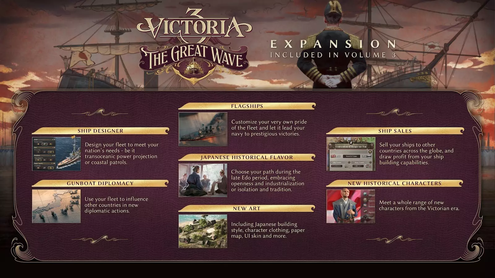 欢迎来到《巨浪》,各位玩家,这是《维多利亚3》即将推出的扩展包。 本扩展包聚焦于探索海军机制扩展后的全新海洋世界,其中核心内容是【舰船设计器】,它将提供丰富的海军战略选择!此外,你还将在江户时代末期的动荡中驾驭日本的危险局势,体验因时代变迁引发的政治与社会动荡。 利用你的海军力量压制地区对手,抵御外来威胁。 引领日本走过幕府时代的最后岁月,将其打造成足以挑战当时世界列强的现代化强国。 那么,《巨浪》中都包含哪些内容呢? 舰船设计器:根据本国的战略需求设计并建造舰队。建造强大但造价高昂的远洋战舰以影响他国,或打造一支高效舰队来保卫本国海岸。 旗舰:定制专属于你的舰队荣耀,让其引领海军赢得辉煌胜利。 舰船购买条约:向全球其他国家出售舰船,凭借造船能力获取利润。 炮舰外交选项:在全新外交行动中利用舰队影响他国。 叙事内容: 引领日本度过江户时代末期的社会与政治动荡,这一时期的特点是对德川武士统治的挑战日益加剧。适应或反抗不断变化的国内外形势,通过改革国家来实现你的愿景。应对日本登上世界舞台,在西方列强擅长的领域击败他们。用你的海军将日本的影响力扩展到本土岛屿之外,与强大的邻国争夺土地和影响力。 新增历史人物。 美术:新增服装素材、日式建筑风格、用户界面皮肤、地图及桌面素材。 音乐:新增符合时代背景的音轨,展现日本丰富的文化。