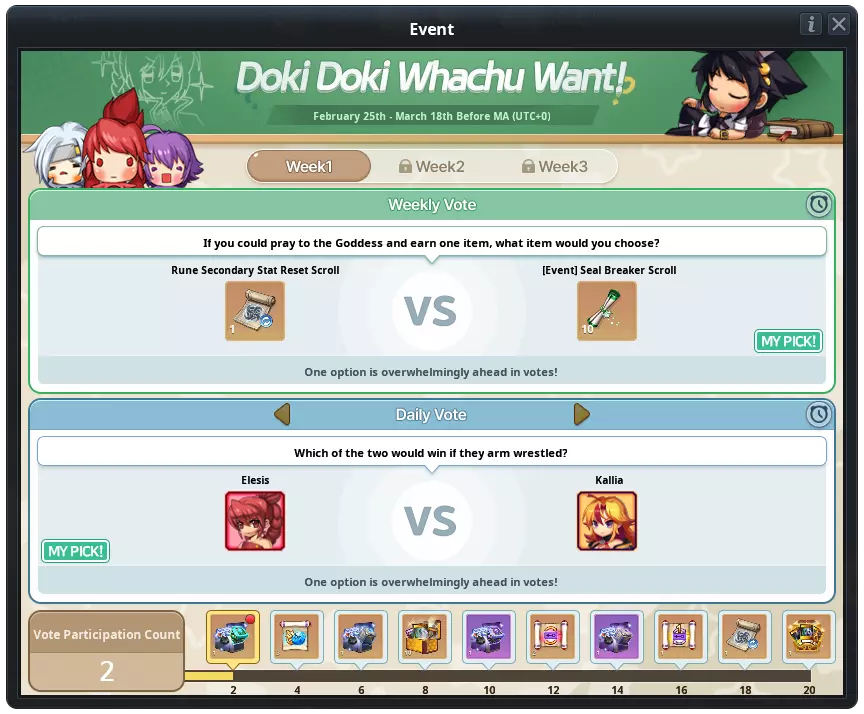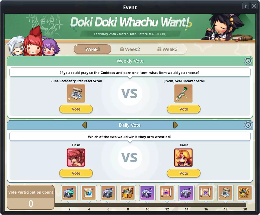 |投票类型|宝箱获取数量| |---|---| |每周投票|5| |每日投票|1| (4)投票结果奖励 - 投票期结束后,得票率最高的选项将获得额外奖励。 - 得票率较高的物品将发送至玩家邮箱,或为投票选项中包含的角色施加1天EXP+10%、GP+10%的增益效果。 - 即使未参与投票,只要在活动期间登录的所有用户都将获得投票结果奖励。 (5)投票参与次数奖励 - 玩家将根据活动界面底部显示的投票参与次数获得奖励。玩家累计参与20次投票后,将获得所有奖励。投票参与次数奖励 投票参与次数 物品名称 数量 2 【活动】高级属性符文支援箱 1 4 特殊强化解除卷轴 3 6 【活动】高级技能符文支援箱 1 8 新克里克特里亚怪物卡片箱 10 10 【活动】特级属性符文支援箱 1 12 GP道具属性卷轴 2 14 【活动】特级技能符文支援箱 1 16 单一属性卷轴 1 18 符文副属性重置卷轴1 20 [活动]高级克里克特里亚礼盒 1