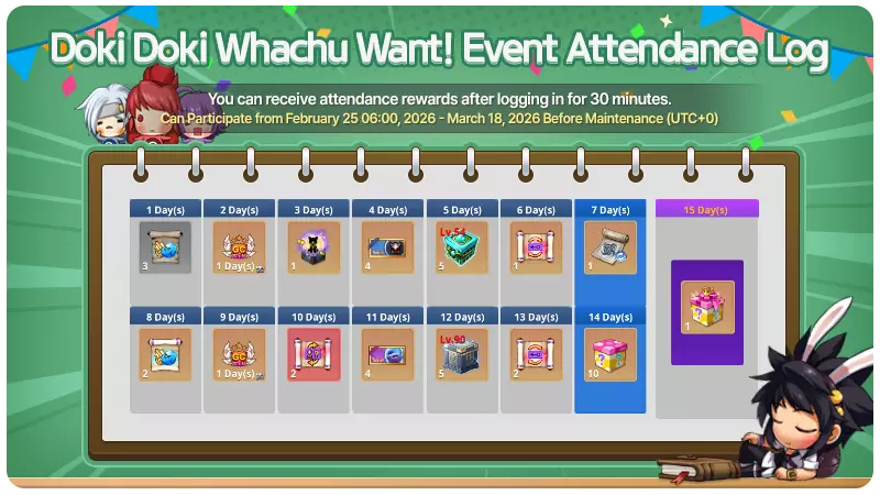 《GrandChase》新增内容 1. 活动期间将新增【神兽圣域】副本的大师难度 ① 大师难度 - 大师难度是玩家检验自己对【神兽圣域】副本掌握程度的地方。 - 大师难度要求的总战斗力高于【神兽圣域】普通难度,且需要研究 Boss 的攻击模式。 - 通关大师难度后,玩家可通过活动任务领取一次性奖励。 - 在大师难度中击败怪物获得奖励的概率与普通难度相同,但无法获得普通难度专属奖励。 ② 大师挑战任务 - 活动期间,玩家将接取挑战任务,完成后可获得特殊奖励。- 挑战任务每个账号可完成一次。 - 【大师挑战】神兽圣域生态调查任务为可按顺序通关的连锁任务。 ① 【大师挑战】通关1次神兽圣域大师难度(单人):【活动】破印卷轴x10 ① 【大师挑战】通关1次神兽圣域大师难度(组队):破印卷轴x10 ③ 【大师挑战】神兽圣域生态调查任务1:神兽圣域怪物卡片盒x5 ③ 【大师挑战】神兽圣域生态调查任务2:神兽圣域怪物卡片盒x10 - 玩家可通过【活动】破印卷轴获取第2-7季破印系列时装。- 玩家可通过【破印卷轴】获取所有季节的破印协调道具。 - 玩家可从【神兽圣域怪物卡盒】中,以设定概率随机获得以下卡片中的1张: 神兽圣域怪物卡盒内容 守护安息之灵 液态安息之灵 孢子安息之灵 沼泽尖牙 幼生尖牙 沼泽守护者 火焰之鸡 烈焰苏尔塔克 致深夜的星光 8. 心跳选择!活动 1) 活动签到日志(2026年2月25日(周三)维护后 - 2026年3月18日(周三)维护前(UTC+0))