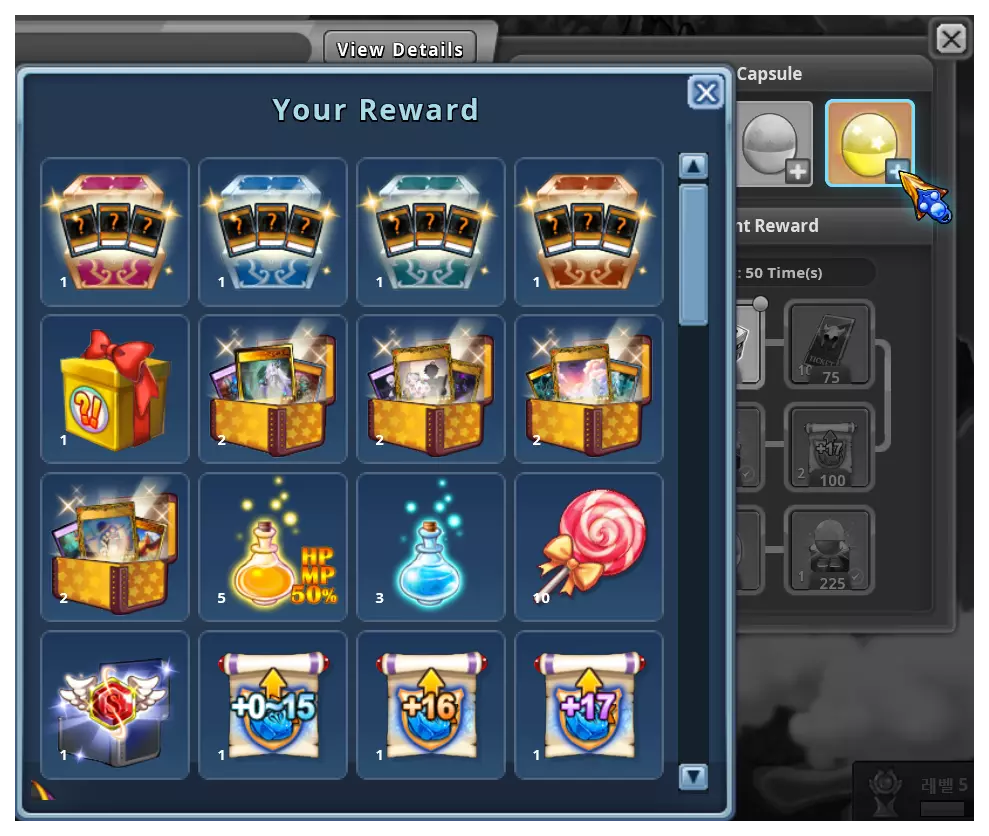 玩家累计召唤达到25、50、75、100、125、150、175、200或225次时,可领取累计召唤奖励。奖励将发放至邮箱。| 召唤次数 | 累计召唤奖励 | | --- | --- | | 25 | 【活动】怪物卡片融合箱 x3 | | 50 | 高级符文召唤箱 x5 | | 75 | 英雄地下城扫荡券 x10 | | 100 | 强化保护卷轴(+17)x2 | | 125 | 【活动】胶囊套装服装自选箱 x1 | | 150 | 【活动】晨星之旅怪物卡片箱 x1 | | 175 | 单属性变更卷轴 x2 | | 200 | 黄金胶囊 x1 | | 225 | 【活动】胶囊套装服装自选箱 x1 | 玩家在召唤次数超过225次后仍可继续召唤胶囊。不过,将不会有额外的累积召唤奖励。 6) 新增道具