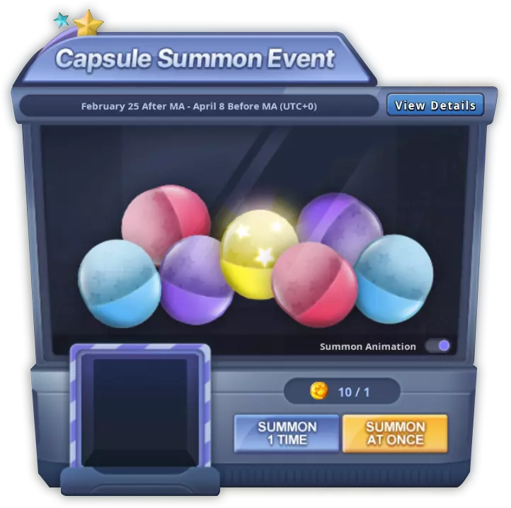 - 点击【单次召唤】或【十连召唤】按钮进行召唤。 ① 单次召唤:消耗1个硬币召唤1个胶囊。 ① 十连召唤:消耗10个硬币召唤10个胶囊。 - 玩家可通过设置召唤动画开关按钮来跳过召唤动画。 4) 胶囊召唤奖励