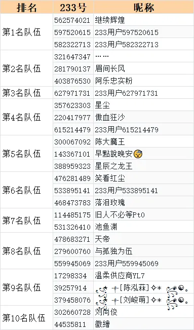 恭喜以下玩家在排行榜中取得前十名,可以直接联系耶耶(233号:378635650)领取礼包奖励哦