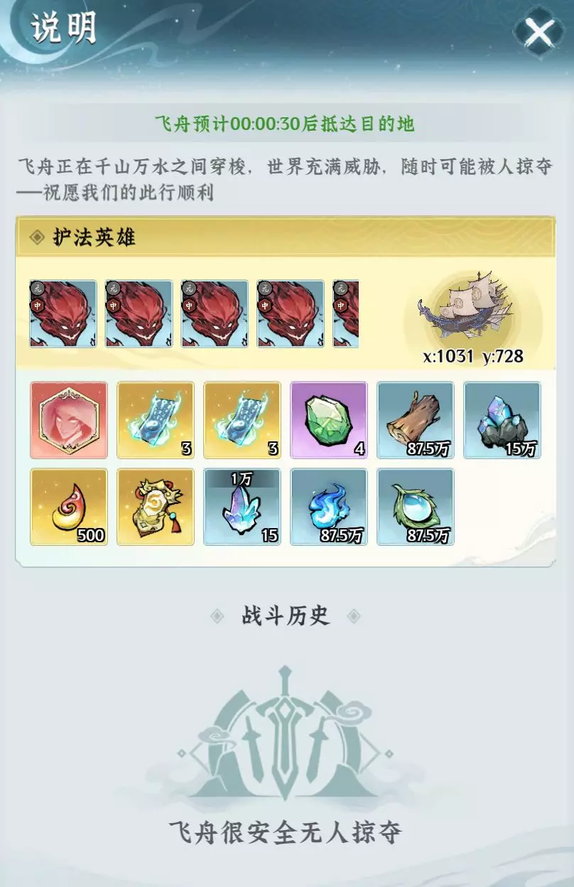 发起掠夺时需要战胜飞舟守卫,成功时会获得敌方飞舟中数种随机物资,失败则无任何收益,并且战斗后会正常产生战损。