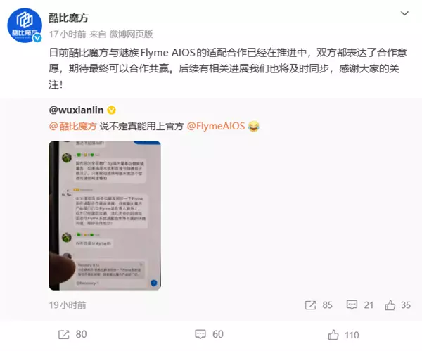 快科技3月1日消息,日前,酷比魔方官微发文称, 与魅族Flyme AIOS的适配合作已经在推进中,双方都表达了合作意愿, 期待最终可以合作共赢。 据了解,2月27日,魅族科技发布官方公告,宣布公司将进行战略转型,暂停国内手机新产品自研硬件项目,并积极接洽第三方硬件合作伙伴,原有业务不受影响。