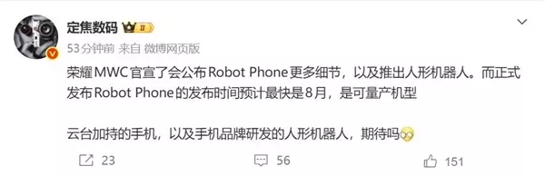 荣耀产品线总裁方飞对此强调,这款新品并非为了博取眼球而设计的概念机。它是荣耀对手机形态边界的一次严肃探索,所有的相关技术都将实实在在地落地到量产环节。 除了备受关注的机器人手机,荣耀还准备在MWC2026上祭出另一项重磅武器,即旗下首款人形机器人。 这一动作标志着荣耀将成为全球首家正式入局消费级人形机器人领域的手机企业。从智能手机到人形机器人的跨越,展现了荣耀在AI与机器人自动化领域深厚的技术储备。 业内人士认为,荣耀这一系列前瞻性的布局,预示着移动通信行业正在向更高维度的智能形态演进。大家都在期待,这款机器人手机究竟能为传统的用机体验带来怎样翻天覆地的变化。