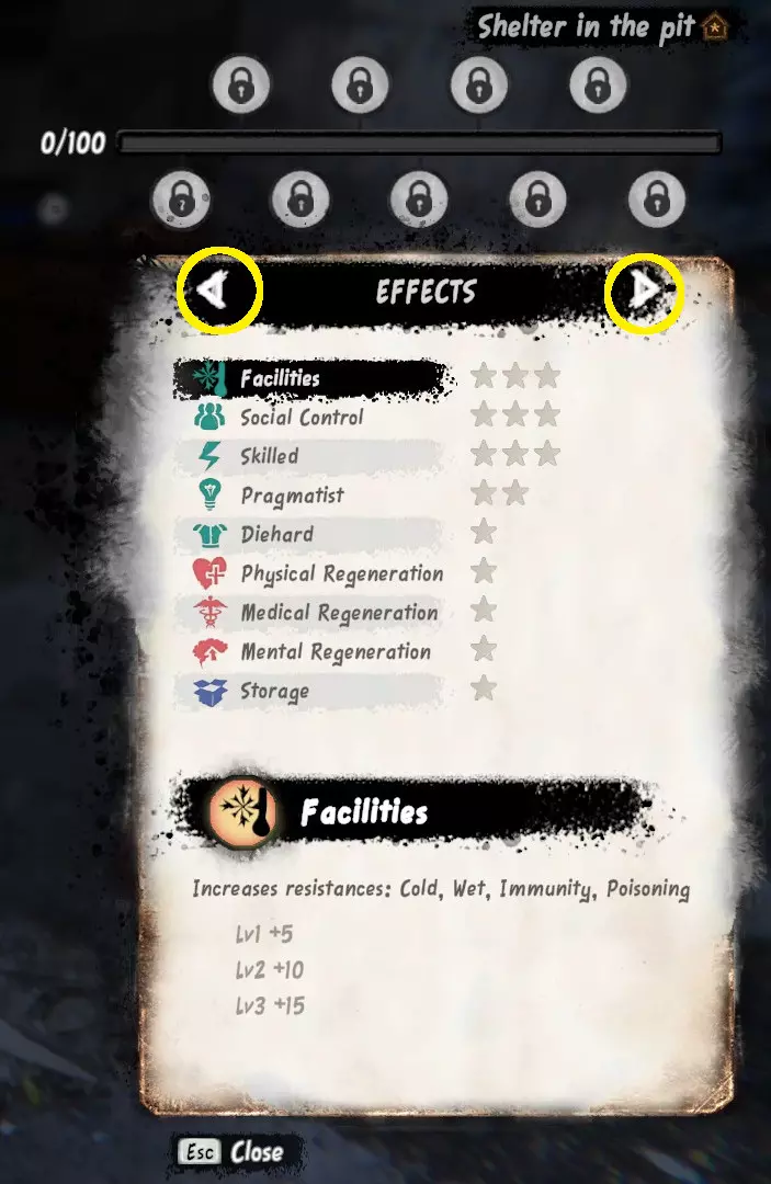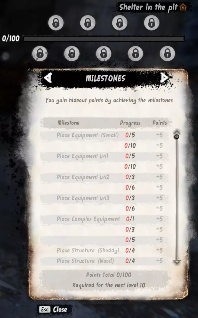 在第二页中,你可以看到达成不同里程碑的要求。在可放置于藏身处的物品描述中,你能看到它们所属的类别。部分物品可以通过消耗材料升级至2级和3级。 死亡机制: 每次死亡后,你的最大属性值会永久降低(例如,初始生命值为100,死亡后可能无法超过90),且需要使用昂贵的消耗品才能恢复。你会保留所有技能等级、任务进度、藏身处储物箱内的物品以及金钱,但背包中的物品会被迈斯纳(Maisner)拿走,你必须花钱赎回。 你可以选择继续游戏或重新开始。在游戏初期,当你还在熟悉机制时,重新开始可能会更简单,但这取决于个人偏好。乞讨 游戏初期,乞讨是快速获取金钱以购买物资和装备的方式。 翻找垃圾桶 打开垃圾桶时,留意其中包含的碎片数量。你的翻找垃圾桶等级等同于遇到碎片时会收到的警告次数。例如,1级时只会收到第一个碎片的警告。若碰到碎片,衣物的异味值会增加或衣物会受损。异味会显示“呃”,衣物损坏会显示“撕裂”。碰到两个碎片后,要注意异味和衣物损坏情况。 衣物损坏会使你更难抵御寒冷天气,而有异味的衣物也会慢慢让你身上产生异味(即你的【气味值】会上升,而且你身上的气味越重,人们就越不愿意和你交谈。