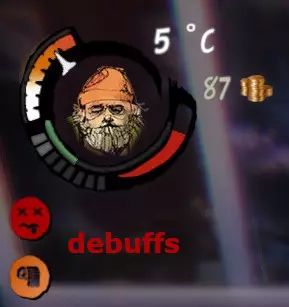 根据衣物和抗性,当环境温度达到特定值时,你的体温会开始下降。睡觉时体温也会降低。橙色区域表示正常,白色区域表示体温过低,若箭头到达底部,你将开始冻伤并失去生命值。你需要在火桶等地方取暖。 当你在雨雪天气中没有遮蔽时,湿度计量表会上升。若湿度计量表完全充满,你会进入“湿透”状态,体温下降速度变为正常的两倍。同样,你可以在火桶处烘干。