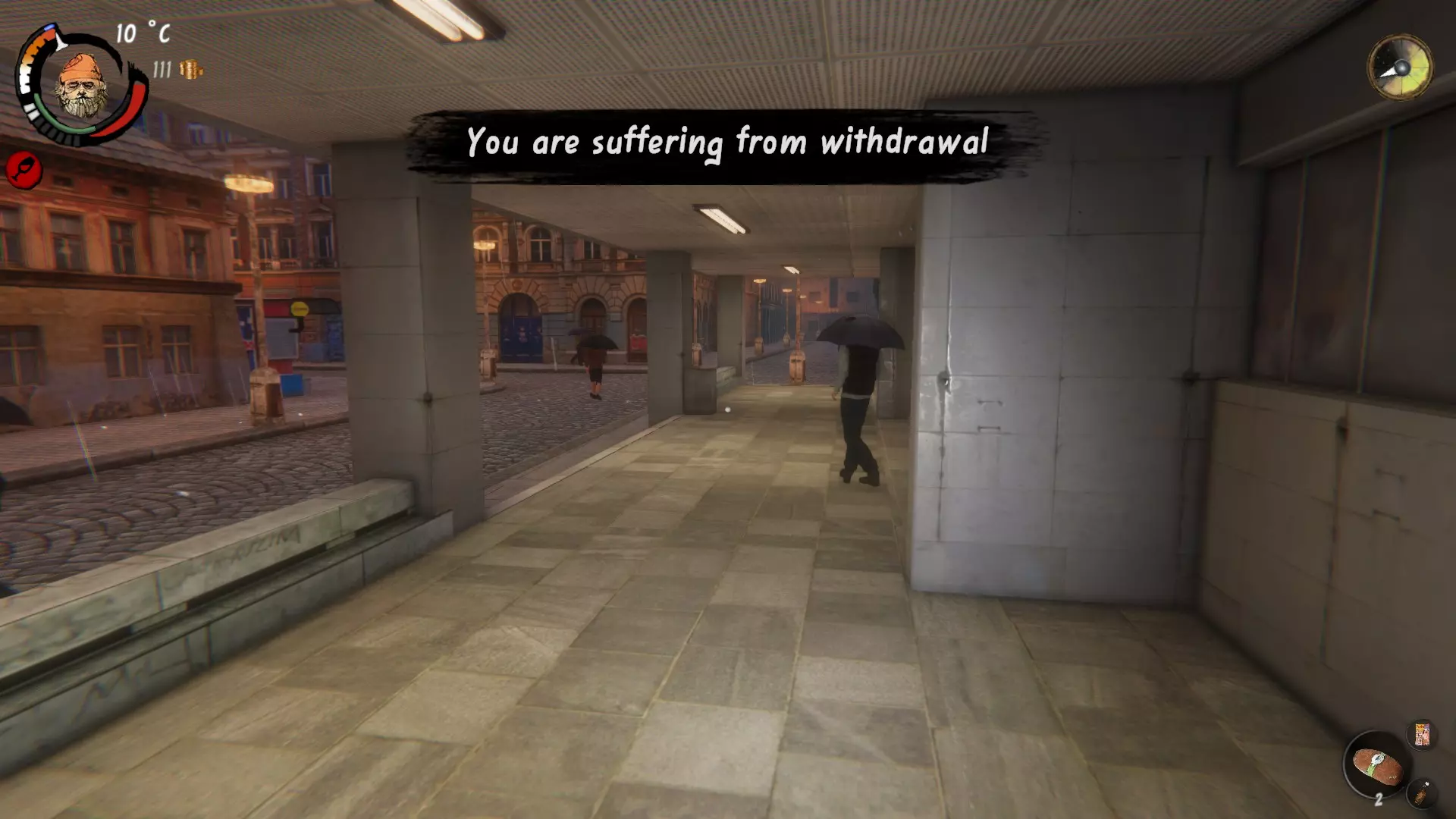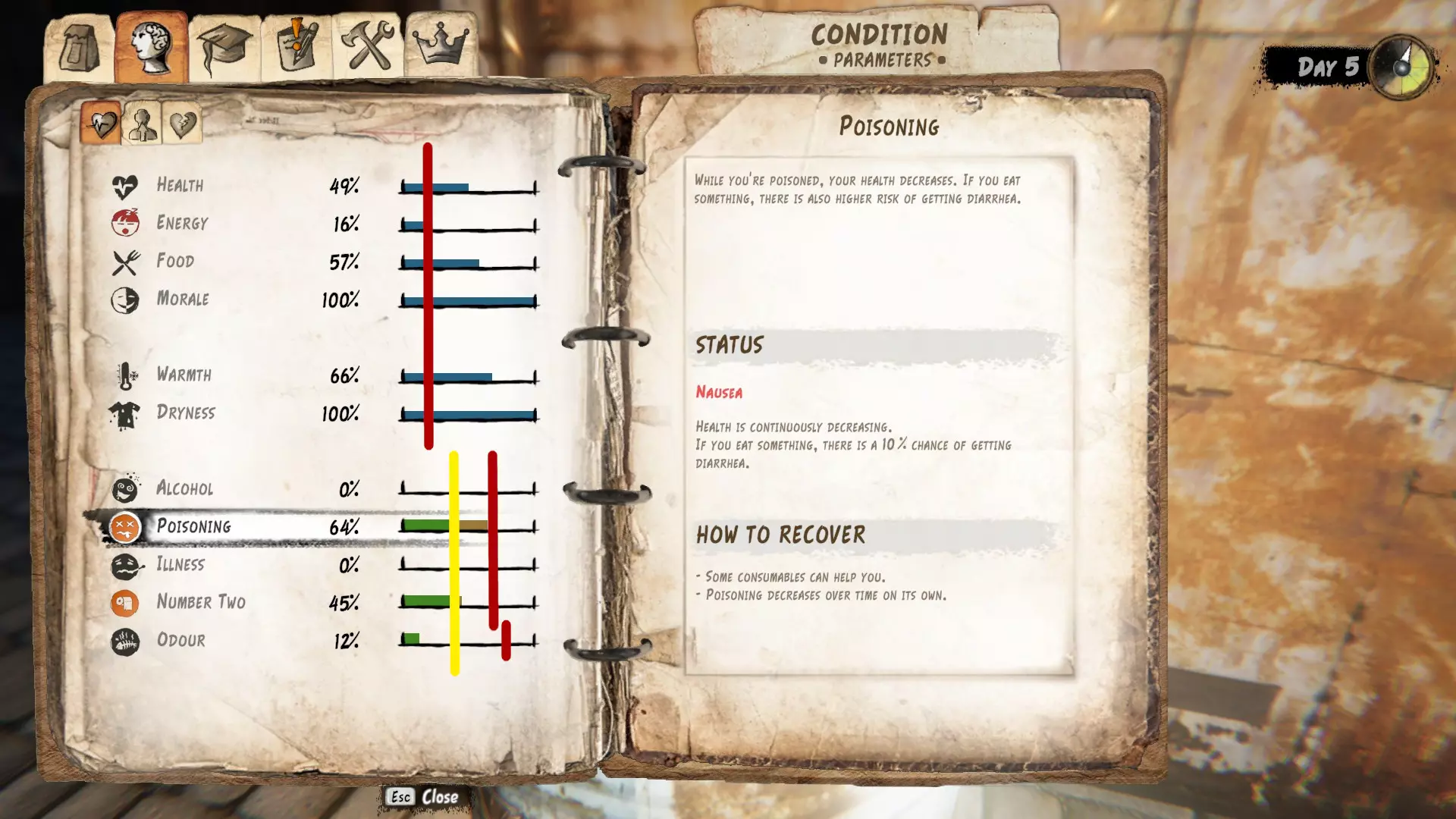 第一类属性包括精力、食物和士气。无论你做什么,这些属性值都会缓慢下降。进行制作或执行某些任务相关动作时,精力会进一步减少;偷窃则会降低士气。如果你被送进监狱,士气也会受到打击。你需要每天合理规划来维持这些属性。 其余属性会受到各种事件的影响,当这些情况发生时,屏幕右侧会弹出提示通知你。需要注意的是,菜单中的第三类属性值过高时会产生负面影响,因此你需要将它们保持在较低水平。这些属性包括酒精、中毒、疾病、便意和体味。图片中的红线表示临界边界,黄线表示警告边界。当越过这些边界时,角色会受到不同的负面效果。你可以点击属性查看状态说明以及恢复建议。大多数属性在警告或临界阶段会导致生命值下降。例外情况包括干燥度、酒精值、排泄需求(警告阶段会降低士气)、气味以及生命值本身,但它们会带来其他严重后果,因此不应被低估。同时要注意,临界阶段的生命值流失速度更快。 查看属性的三种方式: 打开背包并点击“状态”标签来查看属性值并不总是最便捷的方法。第二种方式是屏幕左侧角色头像下方弹出的负面状态。橙色图标表示警告阶段,红色则表示危急阶段。在达到危急阶段前不会产生负面影响的属性,在数值低至危险水平前不会显示在这里。这就引出了第三种方式:打开你的物品栏,查看右侧。