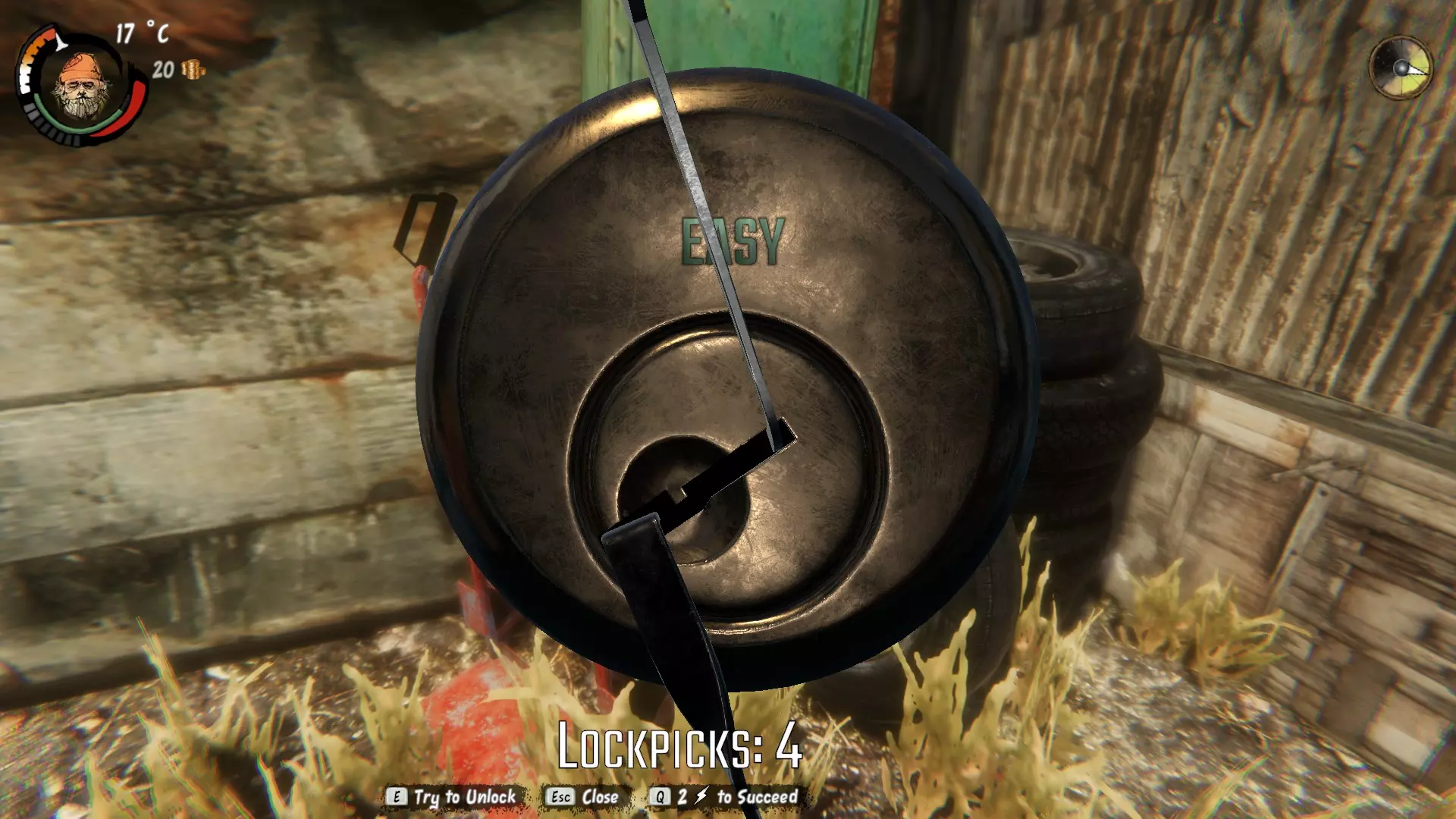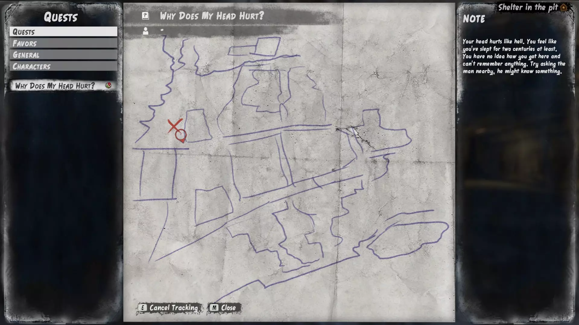 撬锁的目标是将锁向右旋转90度。截图显示的是锁正在转动的状态。你需要按下【E】键并调整鼠标,使锁持续转动。如果锁卡住太久,你的开锁器就会损坏。如果发现情况不妙,可以快速按下【Esc】键在开锁器损坏前重置。 偷窃每件物品都会消耗你的士气。你也可能被抓住并陷入麻烦,所以要时刻留意是否有人注意到你并对你的偷窃行为提出指责。你可以按【Esc】键取消偷窃尝试,如果此时你还没有偷到任何东西,他们很可能不会报警或逮捕你。 任务系统 任务很重要,因为它能解锁游戏中的多种进度提升方式。不过,尽量不要为了完成任务而牺牲生存。有时候,适可而止、重新规划会更好。 从迈斯纳开始探索吧。做事没有绝对的对错顺序。这就是迈斯纳避难所的样子。