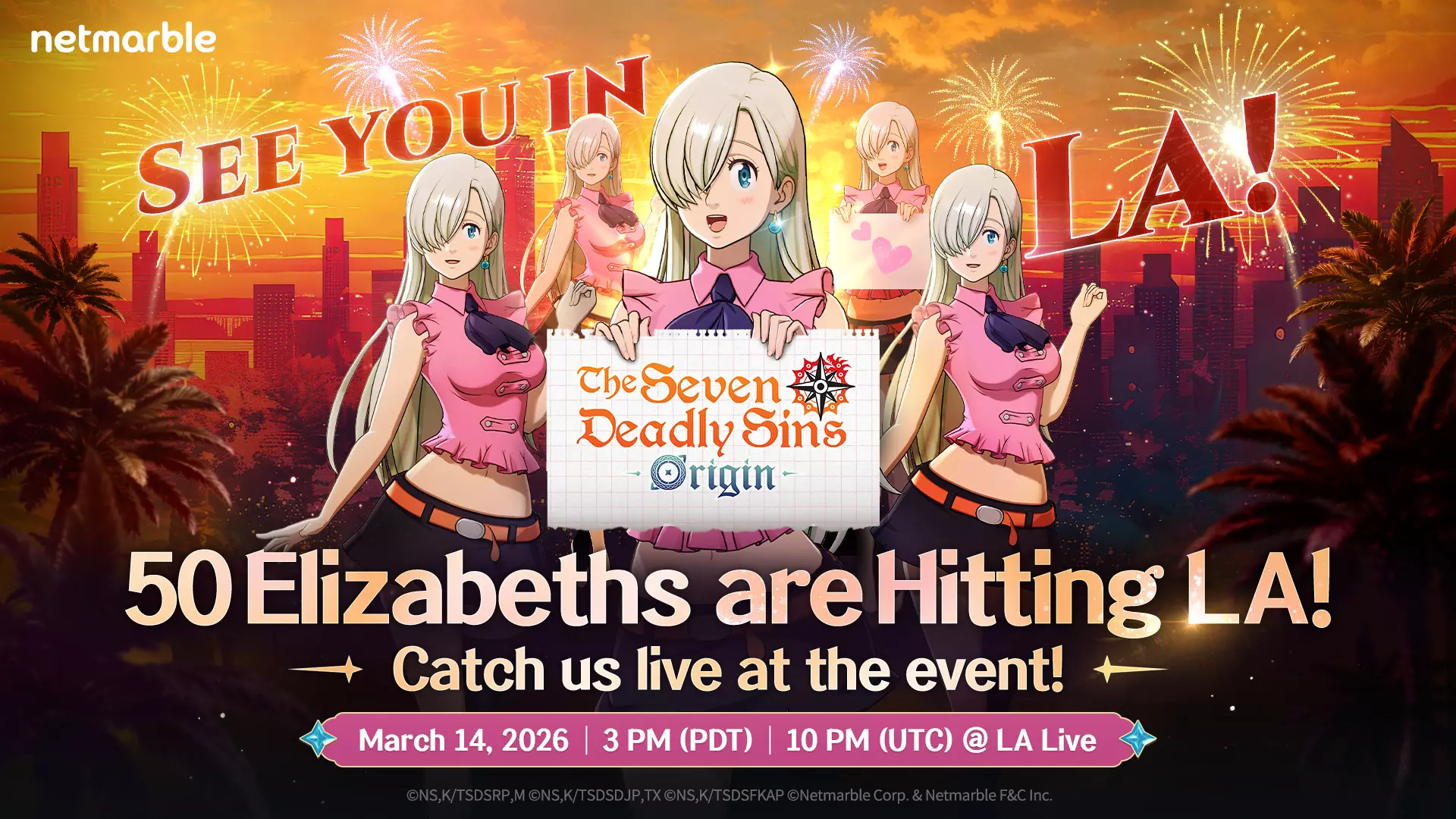 命运交织,携手同行 各位星之守护者,大家好。 这里是《七大罪:起源》项目组。 为庆祝《七大罪:起源》官方上线日期公布,我们将于3月14日(周六)在洛杉矶孔雀广场举办“50 ELIZABETHS IN LA”活动! 更多详情请参考以下信息。