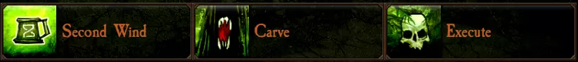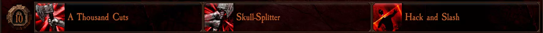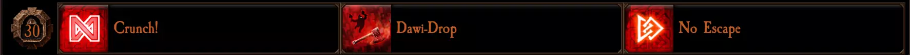 【千刀万剐】:若装备两把单手武器,永久提升10%攻击速度。单手武器包括:锤子、斧子、双持锤子、双持斧子和投掷斧。 【碎颅者】:若装备两把双手武器,永久提升15%威力。双手武器包括:巨锤、巨斧、齿轮锤和战镐。 【劈砍乱击】:永久提升10%暴击几率。