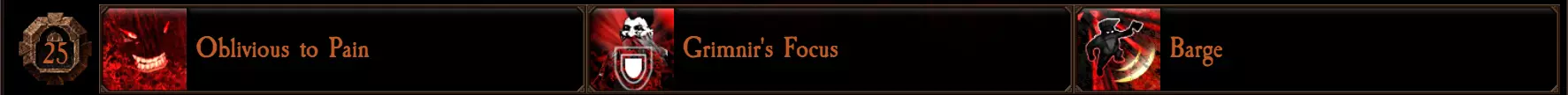 “无视痛苦”能将受到精英和怪物的伤害降低一半(或降至10点,取较高值)。此减伤效果在所有修正(如树皮术)之后生效。如果你不打算使用重攻击,这是个不错的选择,因为它始终处于激活状态。 “格里姆尼尔的专注”在你每次用充能攻击命中敌人时,会提供持续5秒的40%伤害减免 buff。触发非常简单可靠,比“无视痛苦”更具通用性。除非你不常使用重攻击,否则这是最稳妥的选择。 “冲撞”能让你的【有效闪避】将附近的小型敌人推开。这个天赋非常特别,值得专门写一篇文章来详细解释。我个人不推荐它,因为另外两个更容易利用。