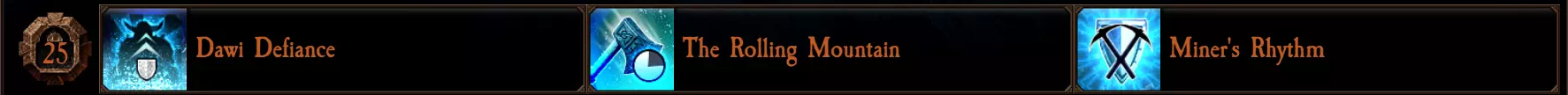 【矮人不屈】是一个不错的防御加成,当你的格挡被打破时,有50%的几率恢复耐力。对于那些非常依赖耐力进行推击的武器(如战锤和双手武器)来说很有用。 【滚动山峦】是一个不错的冷却时间减少增益,只需击杀敌人就能获得,尤其适用于那些更依赖【坚不可摧】来提高生存能力的无盾武器。不过,对于像战锤这类依赖推击的武器来说,它不会生效,因为该效果只有在你耐力全满时才会触发。 【矿工节奏】在你每次用重攻击击中敌人时,会使你的耐力恢复速度提高40%,持续2秒。这对于像巨锤、巨斧和带盾武器这类依赖重攻击的武器来说非常棒。