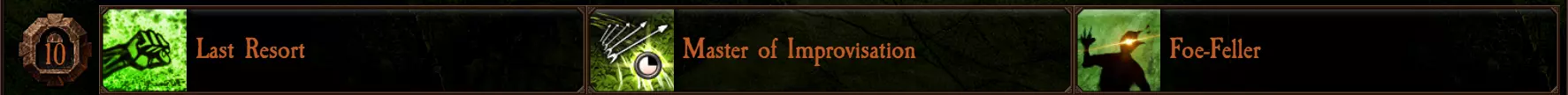 “最后手段”在弹药耗尽时能大幅增强你的近战能力。但遗憾的是,由于这一限制,它仅适用于投掷斧流派。注意:该增益实际上会在最后一发子弹/投射物时生效,除非你通过该次射击(如【保守射手】或【拾荒者】特性)重新获得弹药。 “即兴大师”是这一排三个天赋中目前最稳定且最实用的,它能为除杰作手枪外的所有远程武器提供大量冷却缩减。 “斩敌者”对近战战斗有不错的增益效果。对于巨锤、巨斧和战镐这类慢速武器而言,其提供的攻击速度提升相当可观。