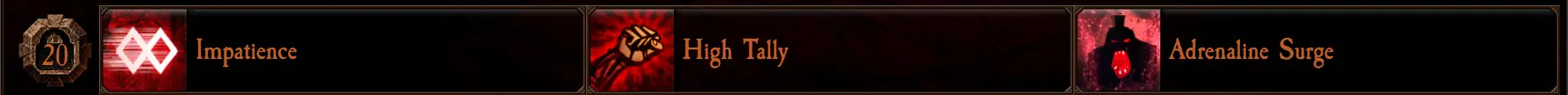 “急躁”永久提升10%移动速度。对于专注近战的职业来说,这是个不错的增益,能帮助你风筝敌人和重新调整位置,而不必完全依赖“飞跃”技能。 “高额计数”将“猎获者”的最大堆叠层数增加1层(最多4层)。如果你需要额外伤害来达到特定的伤害阈值,这个技能会很有用。否则,其他两个选项要优秀得多。在“大灾变”难度下,+10%对混沌敌人伤害和+10%对步兵伤害已经能让你在大多数武器上达到伤害阈值(前提是拥有“重击者”特性和3层“猎获者”堆叠)。 “肾上腺素激增”在你拥有3层“猎获者”堆叠时,使“飞跃”的冷却时间恢复速度提升三倍。这会影响随时间、击中敌人以及受到伤害时获得的冷却缩减。“飞跃”对于巴丁的生存能力和实用性至关重要,因此尽可能频繁地使用它是非常有益的。