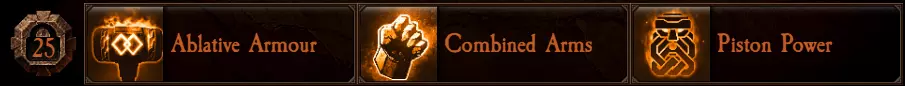 【烧蚀护甲】每5秒获得5%伤害减免(最多叠加5层)。受到伤害会移除1层。这是一个强大且稳定的防御增益,适用于任何构筑。 【联合火力】对近战和远程战斗都有出色的增益效果:它能使近战威力持续提升10%;同时,每进行5次近战命中,你的下一次远程武器或转轮机枪射击将获得增益,使远程威力在10秒内提升15%。 【活塞之力】冷却时间15秒,可强化你的下一次重攻击。强化后的重攻击拥有极高的击退强度,并能恢复全部耐力,这对于使用几乎任何武器坚守前线都大有帮助。由于冷却时间较长,使用后注意不要过度推进。