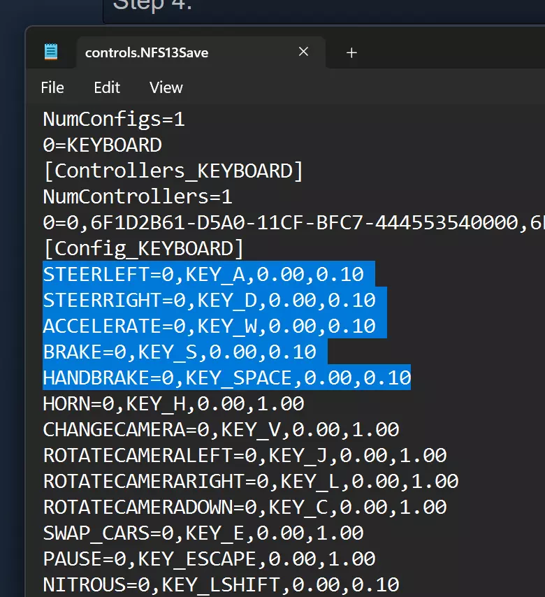 第四步: 为防万一,请先备份controls.NFS13Save文件,然后: 将STEERLEFT、STEERRIGHT、ACCELERATE、BRAKE、HANDBRAKE、NITROUS这几项最右侧的值从1.00调低至0.10。 例如,修改后在我的文件中显示如下: STEERLEFT=0,KEY_A,0.00,0.10 STEERRIGHT=0,KEY_D,0.00,0.10 ACCELERATE=0,KEY_W,0.00,0.10 BRAKE=0,KEY_S,0.00,0.10 HANDBRAKE=0,KEY_SPACE,0.00,0.10