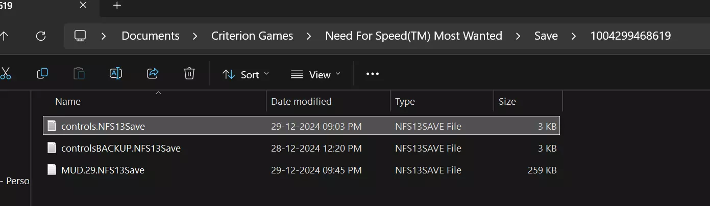 步骤3:文档 > Criterion Games > 极品飞车:最高通缉 > 保存 > 1004299468619(你的文件夹名称可能不同),然后用记事本打开controls.NFS13Save.ini文件(你可能需要先打开游戏并更改一些设置,该文件才会显示)