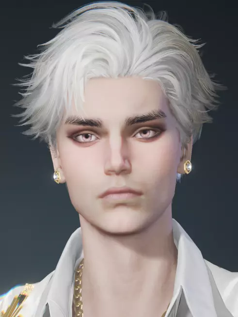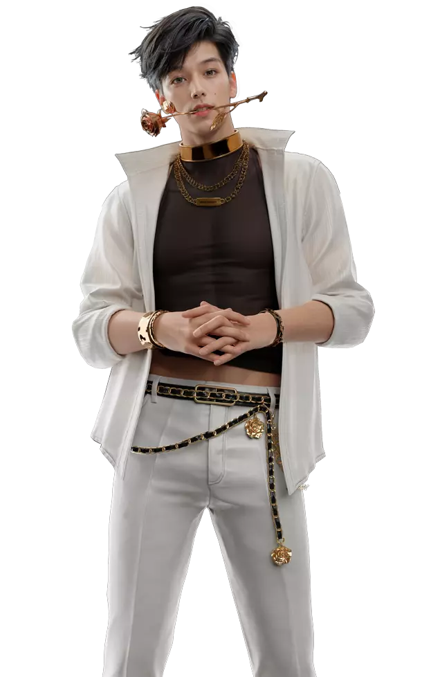 腰间悬挂黑金链条,优雅又性感。金色项圈彰显华丽,纯白衬衣微张领口,黑色薄衣下的肌肉线条若隐若现。