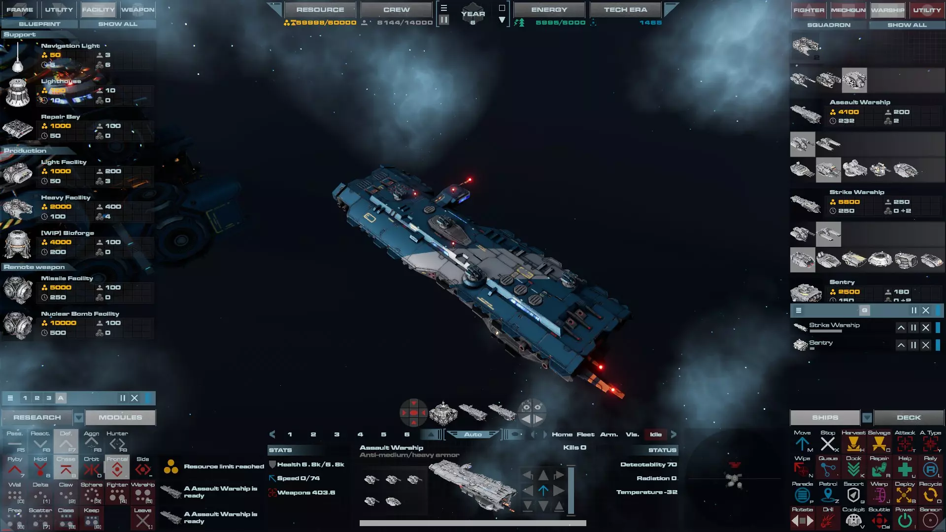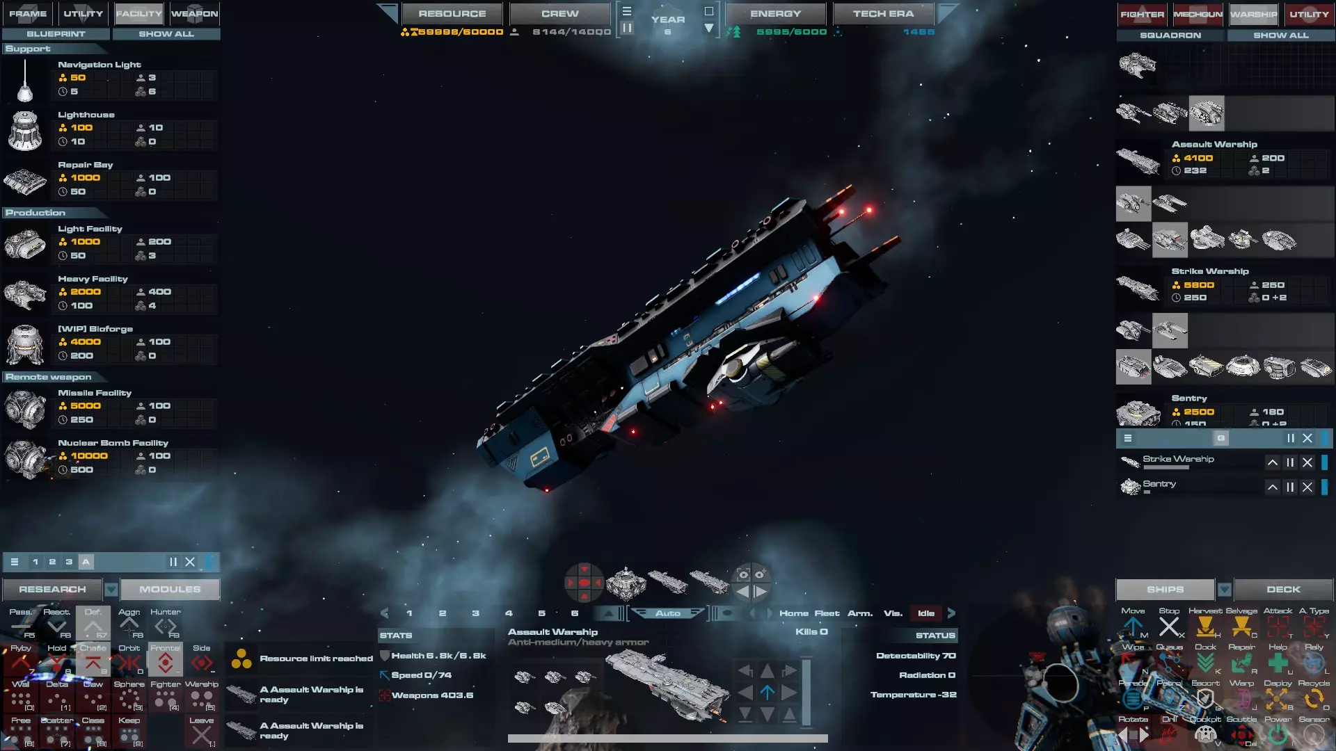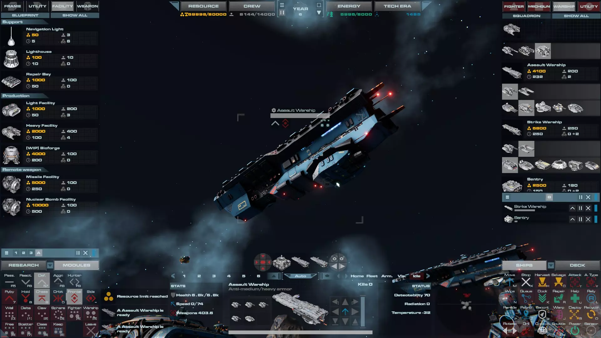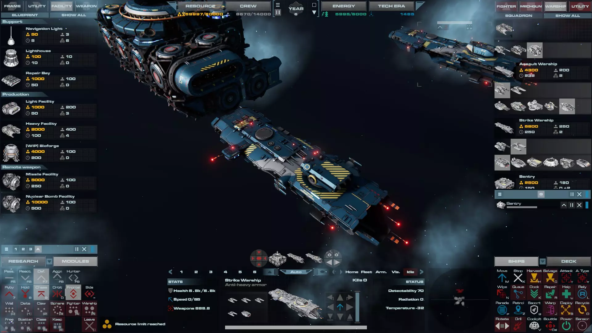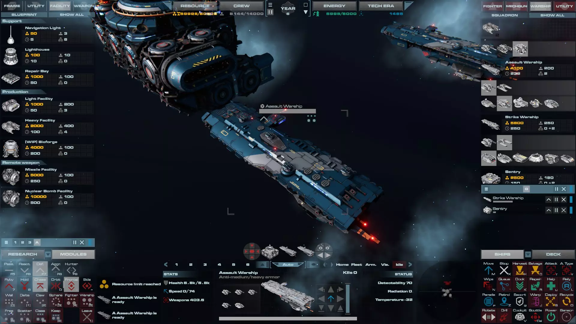 RU值:19000 船员:1748 建造时间:1625秒 指挥核心生命值:48000 速度:27 已装备:超光速引擎和抑制器、6门转管炮 基于加宽的重型巡洋舰船体建造,航母是生产型主力舰的基准型号。配备有1个轻型设施、1个重型设施、2个资源投放点及仓库、1个维修舱、6座用于防御或攻击的专用炮塔,以及舰桥旁2个用于安装模块的自由插槽——其中一个特别推荐安装超光速引擎(没错,我确认过,它能装进去)。这是一艘适合专门进行辅助舰队生产或战斗中生产的舰船。由于其高昂的成本和维护费用,建议建造1艘,最多2艘,这已足以满足其功能需求。超级主力舰 这些是大型主力舰,设计定位为指挥中心的辅助旗舰,也是主力舰级别中的顶尖存在。它们拥有更厚重的装甲和更强大的武器系统,包括重型炮塔和导弹设施,是应对任何威胁的终极舰船。虽然在第二阶段就能解锁,但强烈建议在第三阶段再大量建造,此时建造范围足以容纳这种尺寸的舰船,并且你的经济和科技水平也能让它们发挥全部实力。所有超级主力舰都配备了重要的偏转装甲、至少一个维修舱以及至少一个用于舰载机维护的轻型设施。 战列巡洋舰