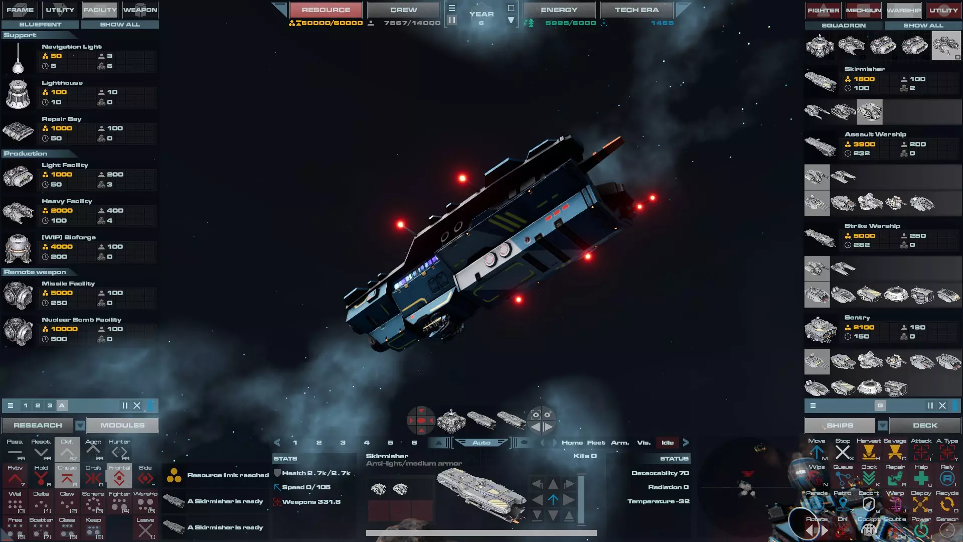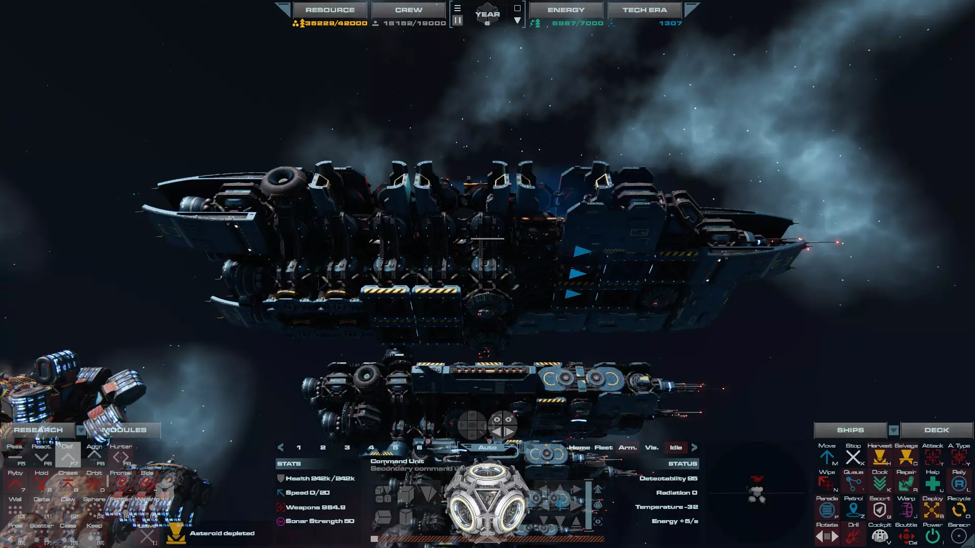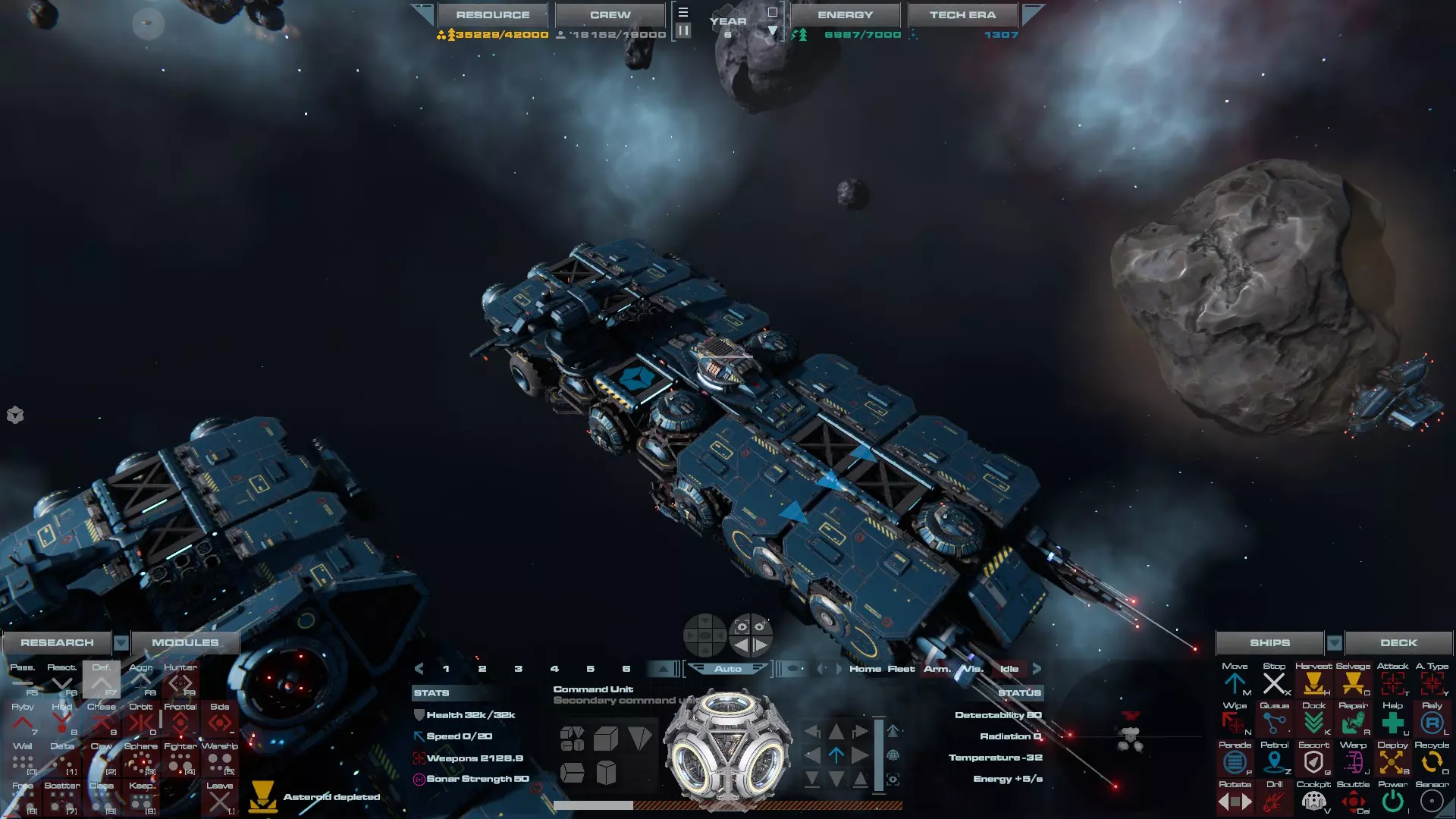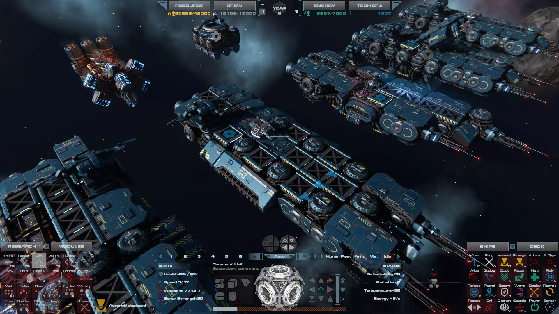 RU值:19000 船员:1748 建造时间:1625秒 指挥核心生命值:48000 速度:27 已装备:超光速引擎和抑制器、6门转管炮 基于加宽的重型巡洋舰船体建造,航母是生产型主力舰的基准型号。配备有1个轻型设施、1个重型设施、2个资源投放点及仓库、1个维修舱、6座用于防御或攻击的专用炮塔,以及舰桥旁2个用于安装模块的自由插槽——其中一个特别推荐安装超光速引擎(没错,我确认过,它能装进去)。这是一艘适合专门进行辅助舰队生产或战斗中生产的舰船。由于其高昂的成本和维护费用,建议建造1艘,最多2艘,这已足以满足其功能需求。超级主力舰 这些是大型主力舰,设计定位为指挥中心的辅助旗舰,也是主力舰级别中的顶尖存在。它们拥有更厚重的装甲和更强大的武器系统,包括重型炮塔和导弹设施,是应对任何威胁的终极舰船。虽然在第二阶段就能解锁,但强烈建议在第三阶段再大量建造,此时建造范围足以容纳这种尺寸的舰船,并且你的经济和科技水平也能让它们发挥全部实力。所有超级主力舰都配备了重要的偏转装甲、至少一个维修舱以及至少一个用于舰载机维护的轻型设施。 战列巡洋舰