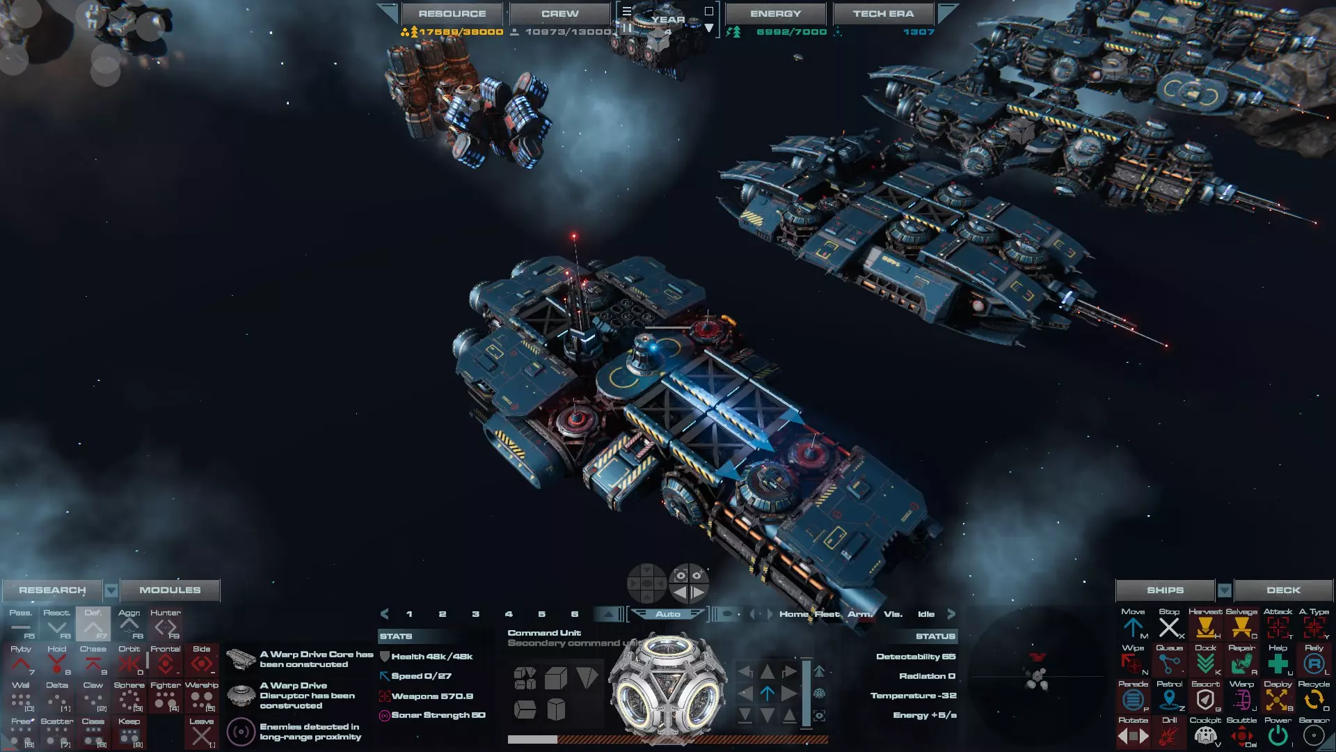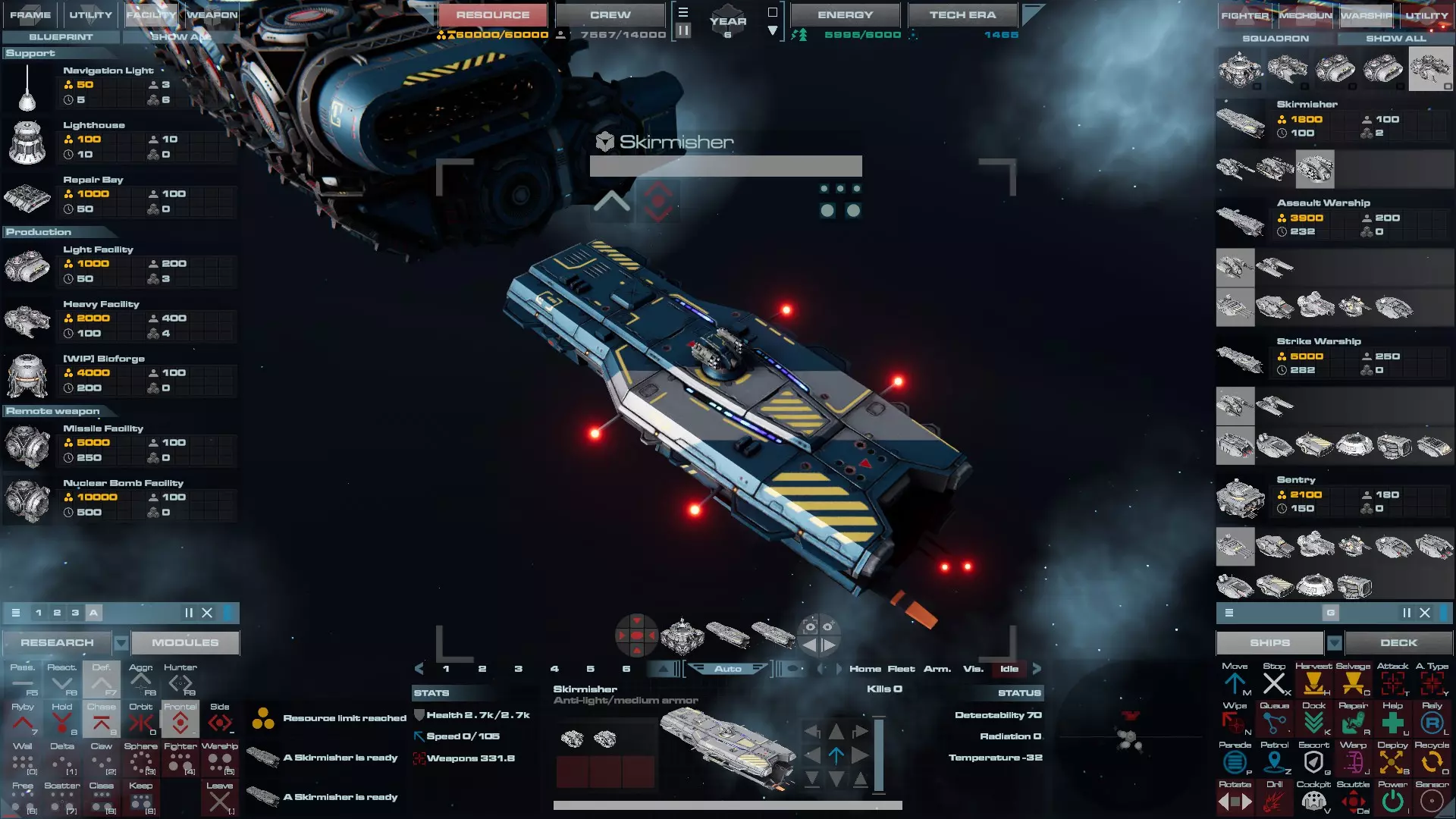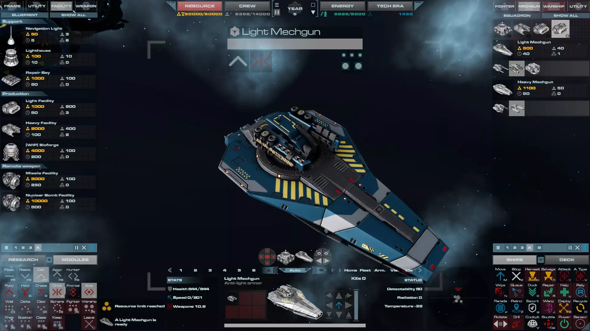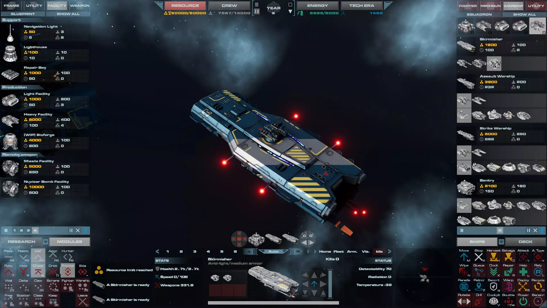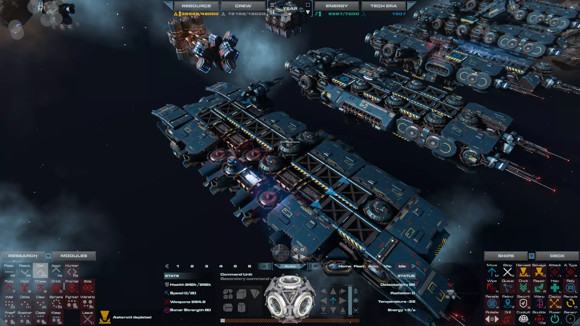 RU值:19000 船员:1748 建造时间:1625秒 指挥核心生命值:48000 速度:27 已装备:超光速引擎和抑制器、6门转管炮 基于加宽的重型巡洋舰船体建造,航母是生产型主力舰的基准型号。配备有1个轻型设施、1个重型设施、2个资源投放点及仓库、1个维修舱、6座用于防御或攻击的专用炮塔,以及舰桥旁2个用于安装模块的自由插槽——其中一个特别推荐安装超光速引擎(没错,我确认过,它能装进去)。这是一艘适合专门进行辅助舰队生产或战斗中生产的舰船。由于其高昂的成本和维护费用,建议建造1艘,最多2艘,这已足以满足其功能需求。超级主力舰 这些是大型主力舰,设计定位为指挥中心的辅助旗舰,也是主力舰级别中的顶尖存在。它们拥有更厚重的装甲和更强大的武器系统,包括重型炮塔和导弹设施,是应对任何威胁的终极舰船。虽然在第二阶段就能解锁,但强烈建议在第三阶段再大量建造,此时建造范围足以容纳这种尺寸的舰船,并且你的经济和科技水平也能让它们发挥全部实力。所有超级主力舰都配备了重要的偏转装甲、至少一个维修舱以及至少一个用于舰载机维护的轻型设施。 战列巡洋舰
