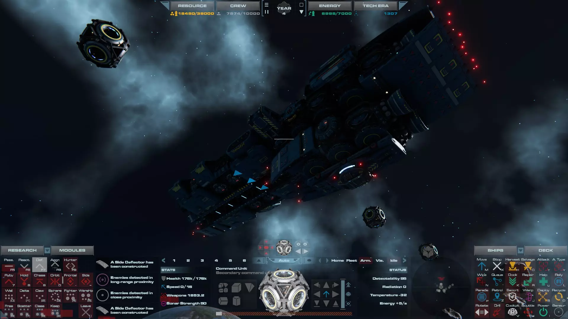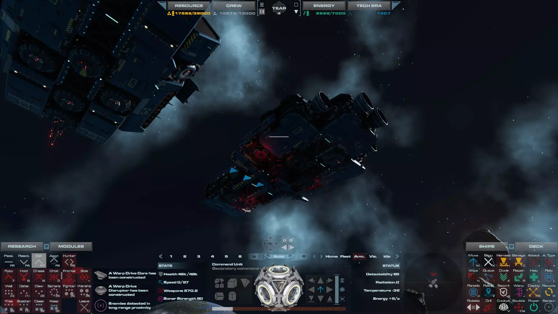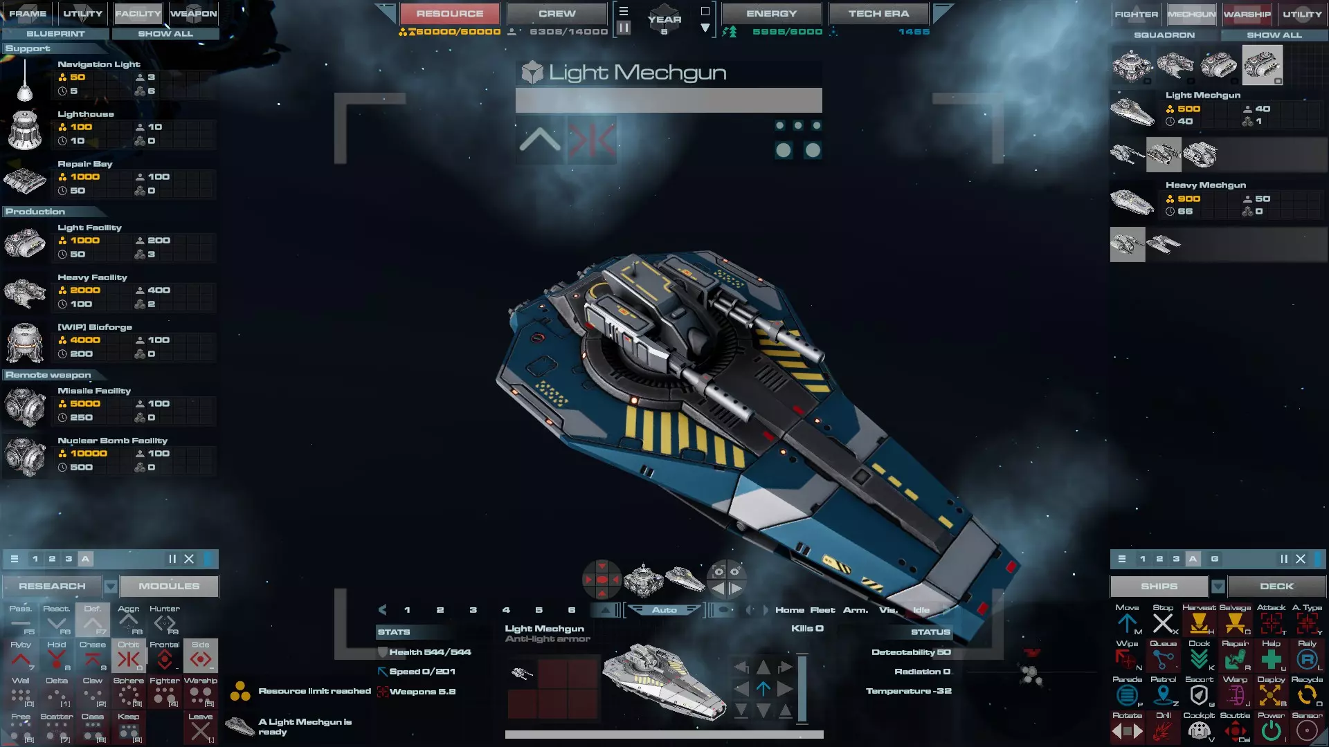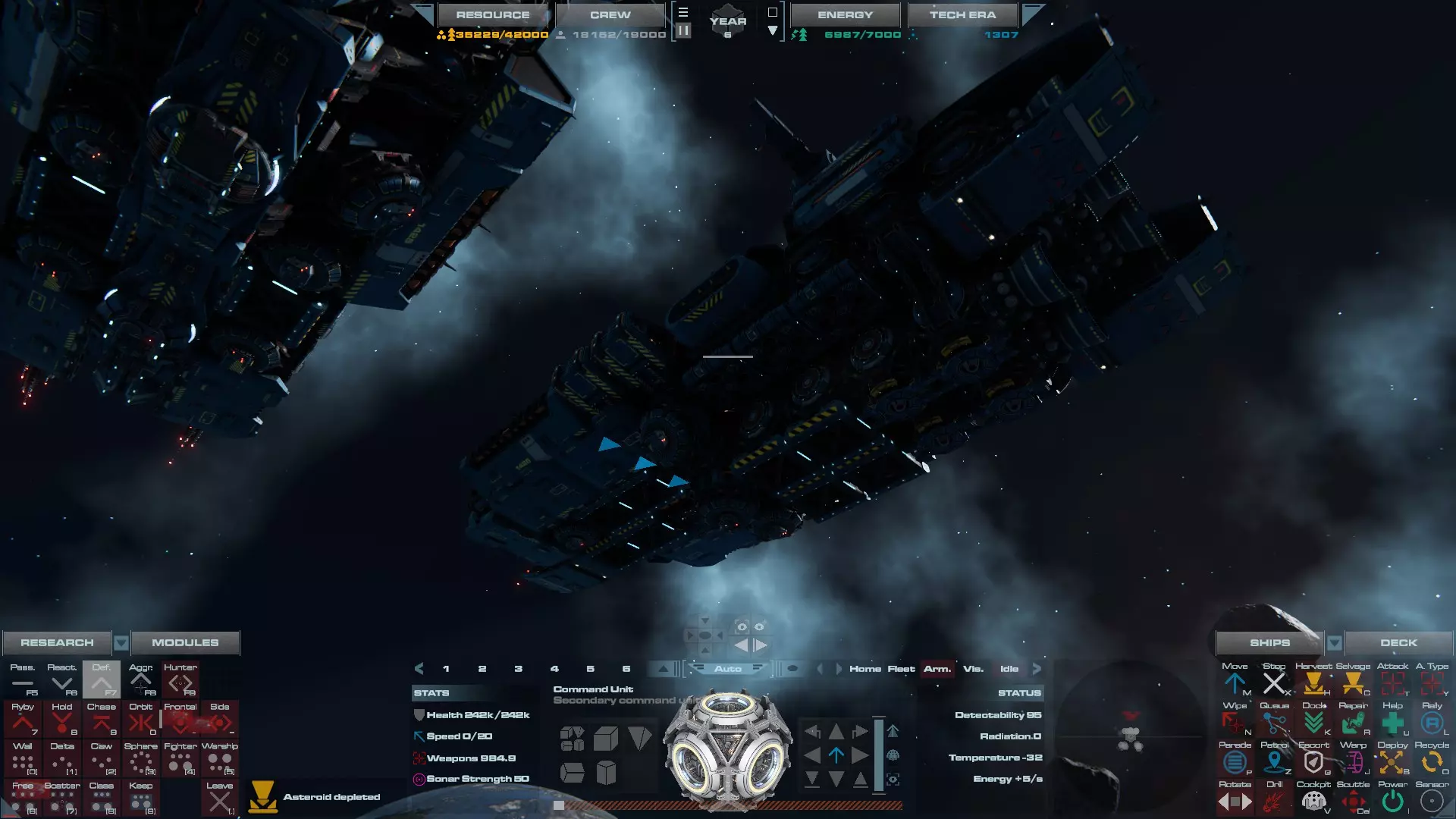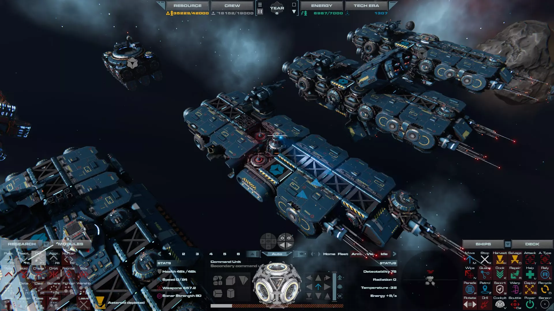 RU值:19000 船员:1748 建造时间:1625秒 指挥核心生命值:48000 速度:27 已装备:超光速引擎和抑制器、6门转管炮 基于加宽的重型巡洋舰船体建造,航母是生产型主力舰的基准型号。配备有1个轻型设施、1个重型设施、2个资源投放点及仓库、1个维修舱、6座用于防御或攻击的专用炮塔,以及舰桥旁2个用于安装模块的自由插槽——其中一个特别推荐安装超光速引擎(没错,我确认过,它能装进去)。这是一艘适合专门进行辅助舰队生产或战斗中生产的舰船。由于其高昂的成本和维护费用,建议建造1艘,最多2艘,这已足以满足其功能需求。超级主力舰 这些是大型主力舰,设计定位为指挥中心的辅助旗舰,也是主力舰级别中的顶尖存在。它们拥有更厚重的装甲和更强大的武器系统,包括重型炮塔和导弹设施,是应对任何威胁的终极舰船。虽然在第二阶段就能解锁,但强烈建议在第三阶段再大量建造,此时建造范围足以容纳这种尺寸的舰船,并且你的经济和科技水平也能让它们发挥全部实力。所有超级主力舰都配备了重要的偏转装甲、至少一个维修舱以及至少一个用于舰载机维护的轻型设施。 战列巡洋舰