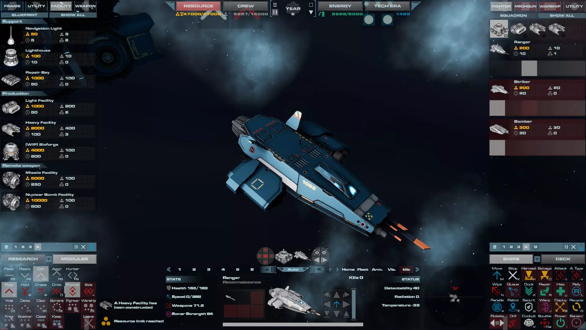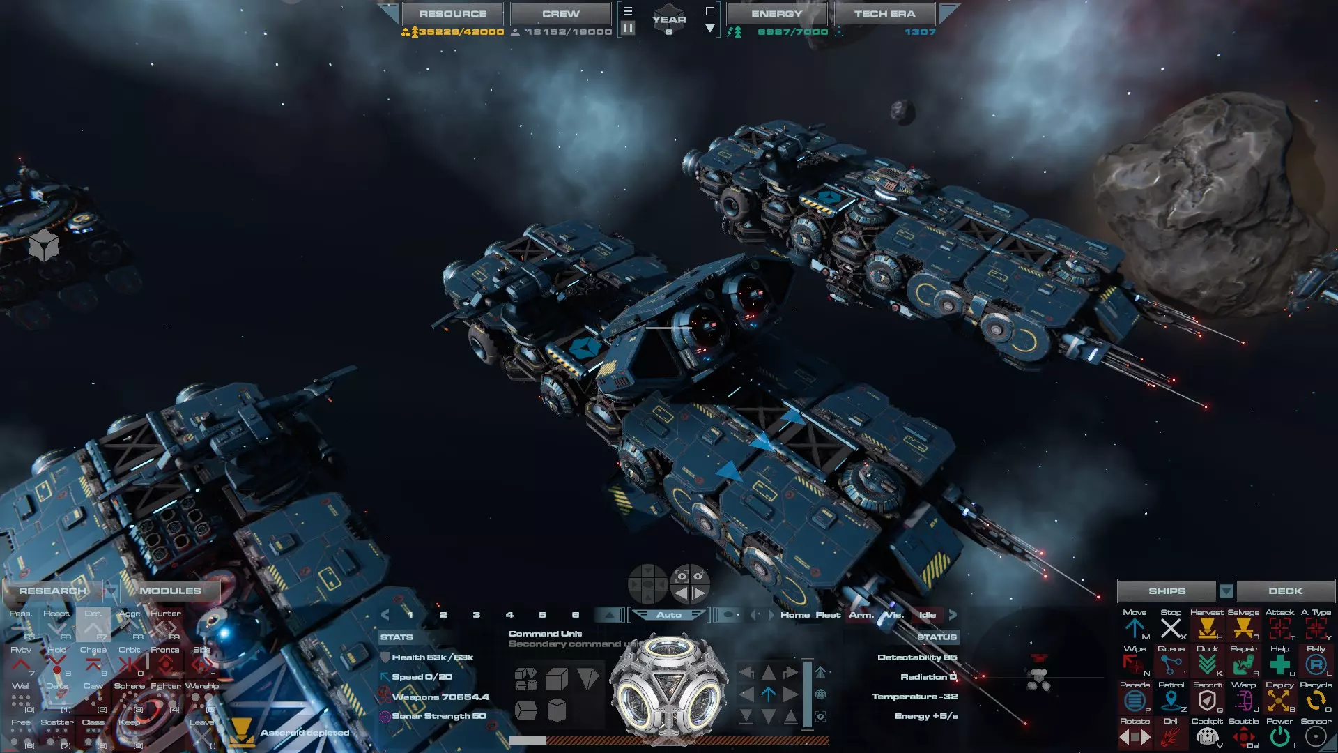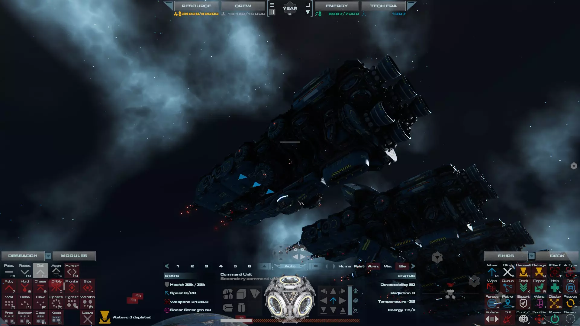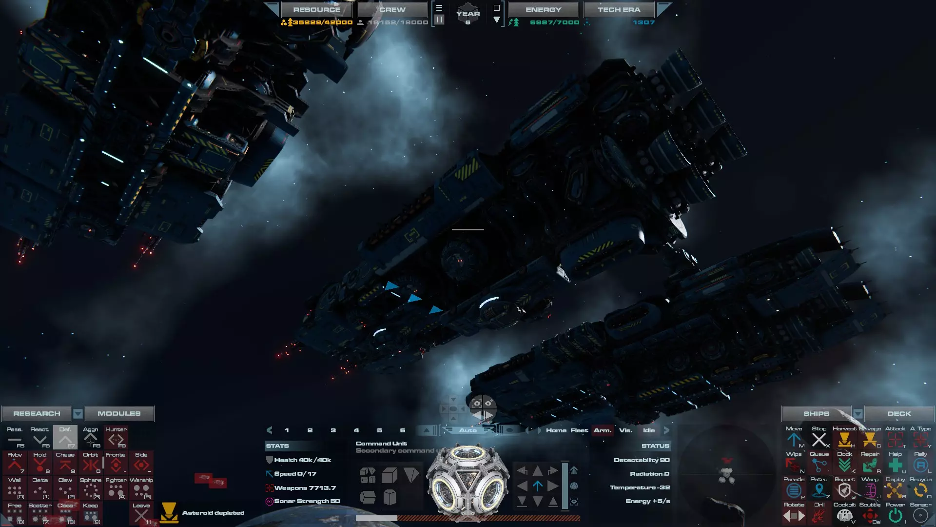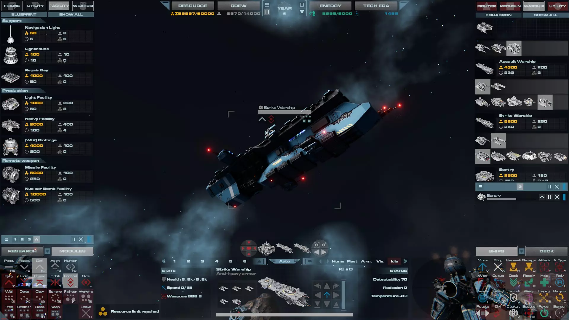 RU值:19000 船员:1748 建造时间:1625秒 指挥核心生命值:48000 速度:27 已装备:超光速引擎和抑制器、6门转管炮 基于加宽的重型巡洋舰船体建造,航母是生产型主力舰的基准型号。配备有1个轻型设施、1个重型设施、2个资源投放点及仓库、1个维修舱、6座用于防御或攻击的专用炮塔,以及舰桥旁2个用于安装模块的自由插槽——其中一个特别推荐安装超光速引擎(没错,我确认过,它能装进去)。这是一艘适合专门进行辅助舰队生产或战斗中生产的舰船。由于其高昂的成本和维护费用,建议建造1艘,最多2艘,这已足以满足其功能需求。超级主力舰 这些是大型主力舰,设计定位为指挥中心的辅助旗舰,也是主力舰级别中的顶尖存在。它们拥有更厚重的装甲和更强大的武器系统,包括重型炮塔和导弹设施,是应对任何威胁的终极舰船。虽然在第二阶段就能解锁,但强烈建议在第三阶段再大量建造,此时建造范围足以容纳这种尺寸的舰船,并且你的经济和科技水平也能让它们发挥全部实力。所有超级主力舰都配备了重要的偏转装甲、至少一个维修舱以及至少一个用于舰载机维护的轻型设施。 战列巡洋舰