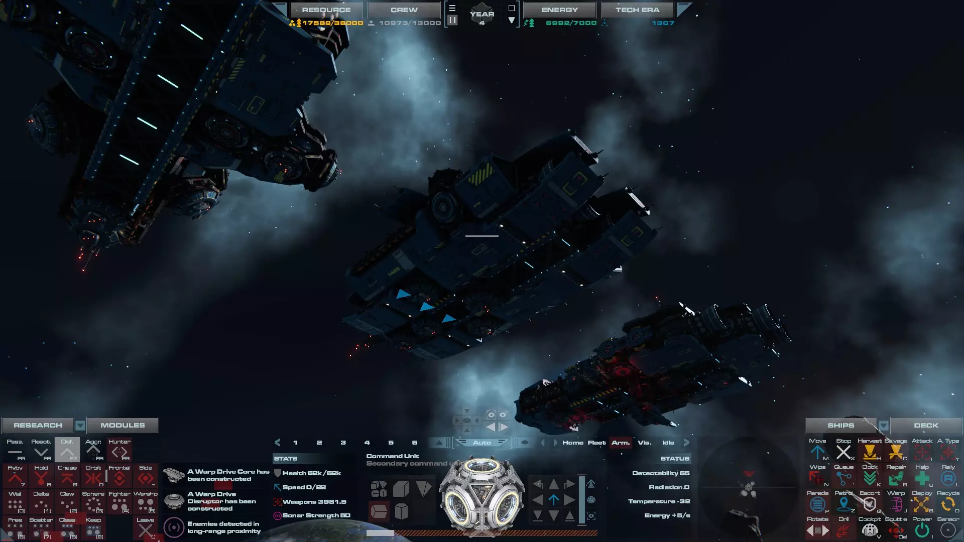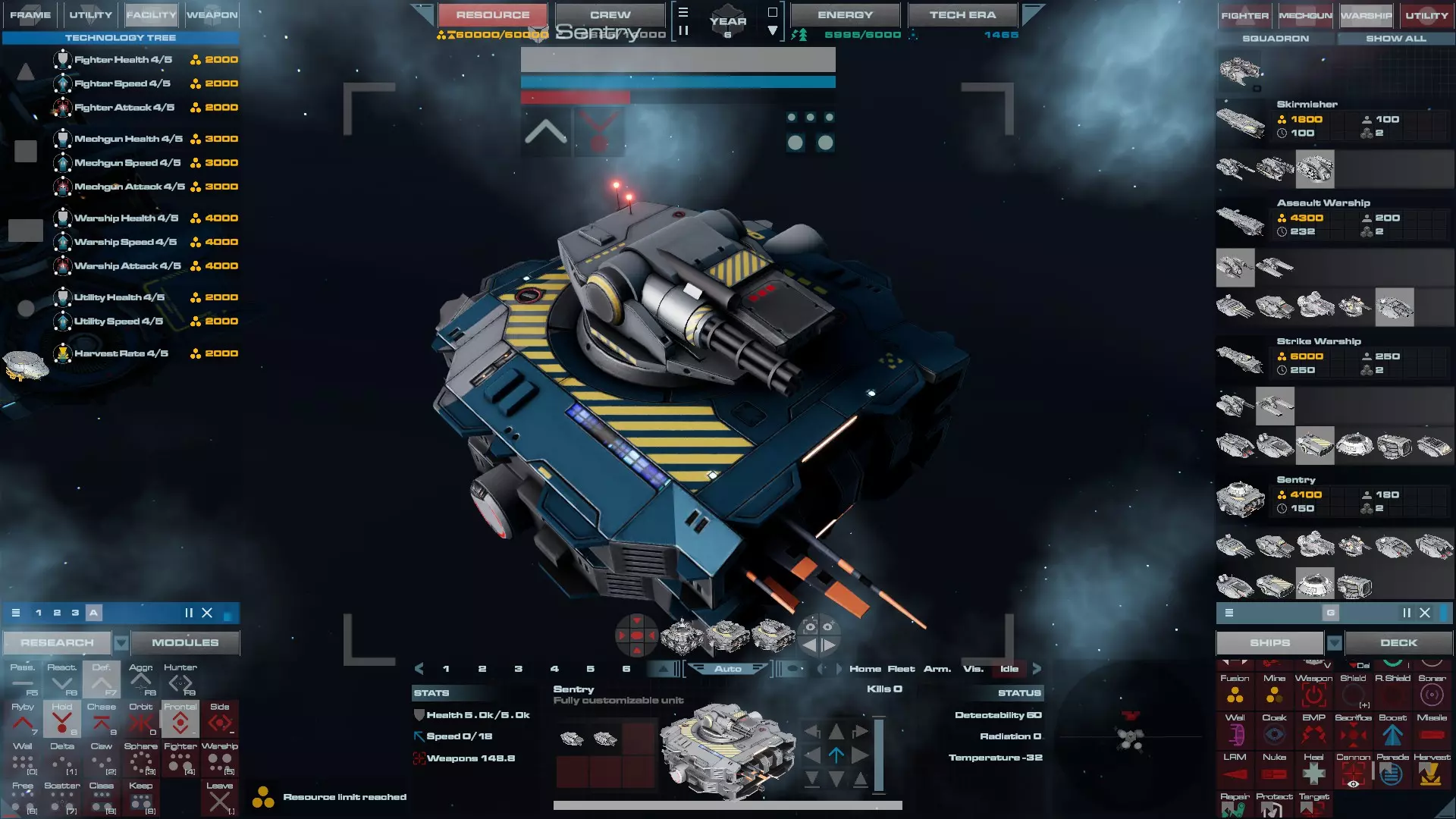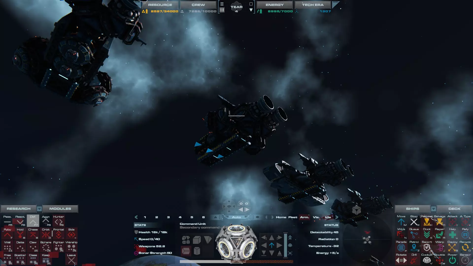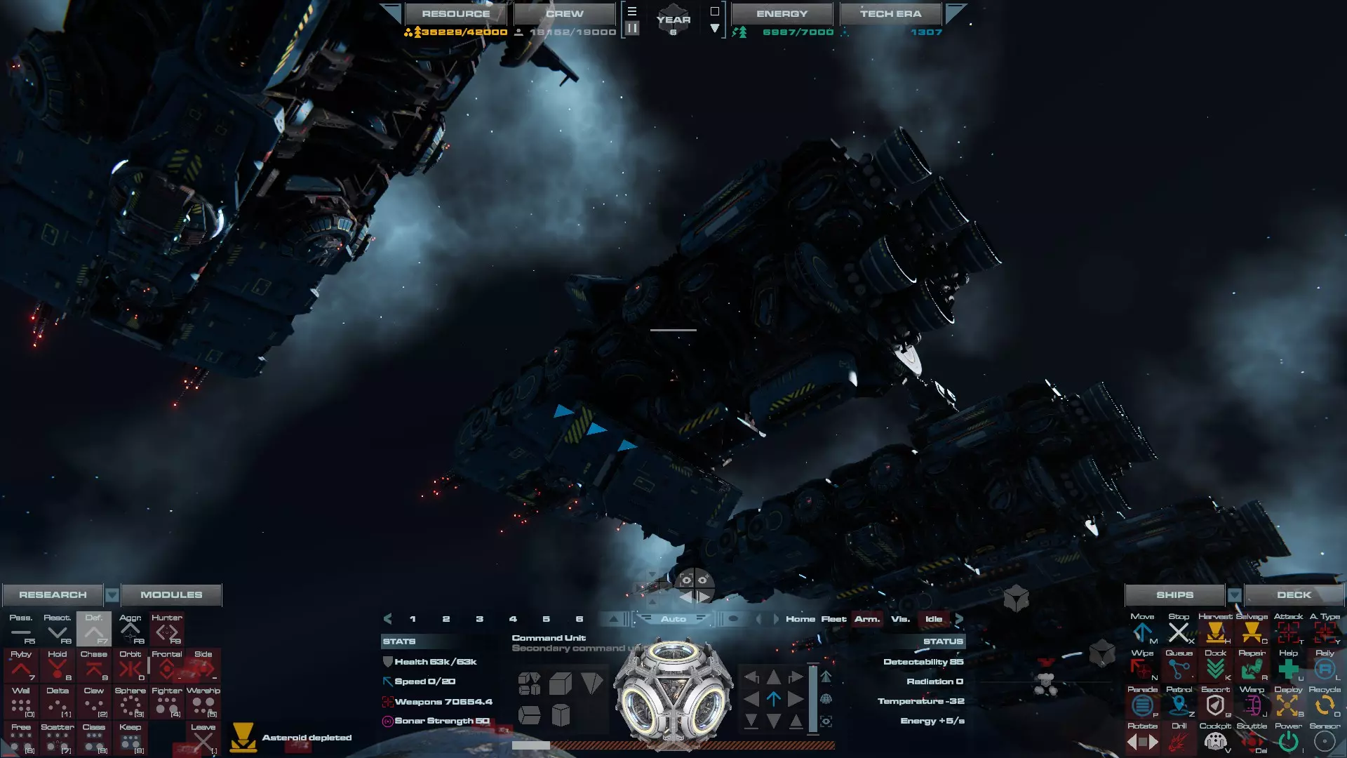 RU值:19000 船员:1748 建造时间:1625秒 指挥核心生命值:48000 速度:27 已装备:超光速引擎和抑制器、6门转管炮 基于加宽的重型巡洋舰船体建造,航母是生产型主力舰的基准型号。配备有1个轻型设施、1个重型设施、2个资源投放点及仓库、1个维修舱、6座用于防御或攻击的专用炮塔,以及舰桥旁2个用于安装模块的自由插槽——其中一个特别推荐安装超光速引擎(没错,我确认过,它能装进去)。这是一艘适合专门进行辅助舰队生产或战斗中生产的舰船。由于其高昂的成本和维护费用,建议建造1艘,最多2艘,这已足以满足其功能需求。超级主力舰 这些是大型主力舰,设计定位为指挥中心的辅助旗舰,也是主力舰级别中的顶尖存在。它们拥有更厚重的装甲和更强大的武器系统,包括重型炮塔和导弹设施,是应对任何威胁的终极舰船。虽然在第二阶段就能解锁,但强烈建议在第三阶段再大量建造,此时建造范围足以容纳这种尺寸的舰船,并且你的经济和科技水平也能让它们发挥全部实力。所有超级主力舰都配备了重要的偏转装甲、至少一个维修舱以及至少一个用于舰载机维护的轻型设施。 战列巡洋舰
