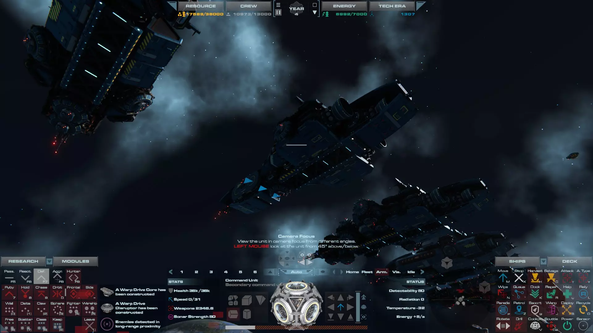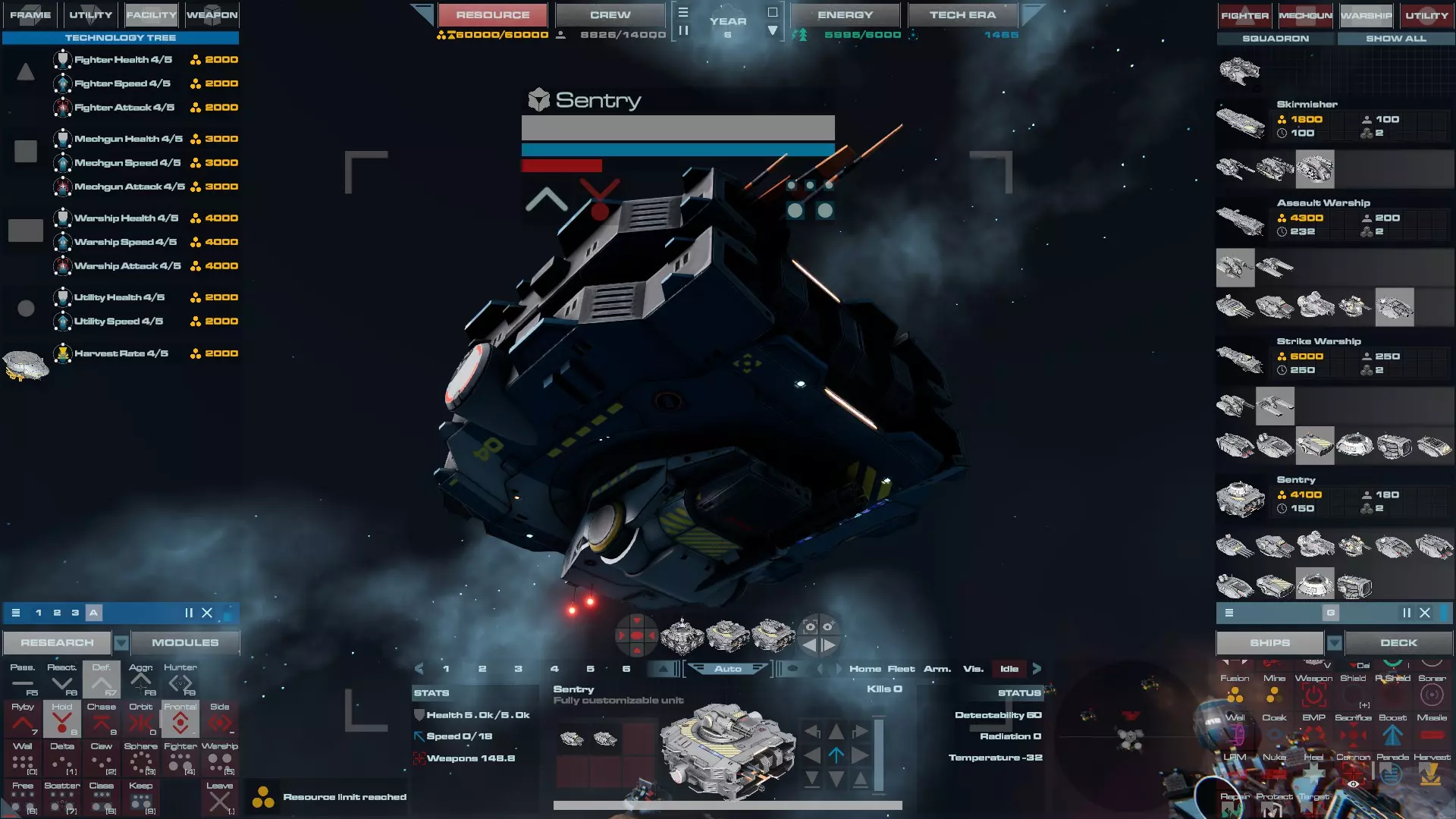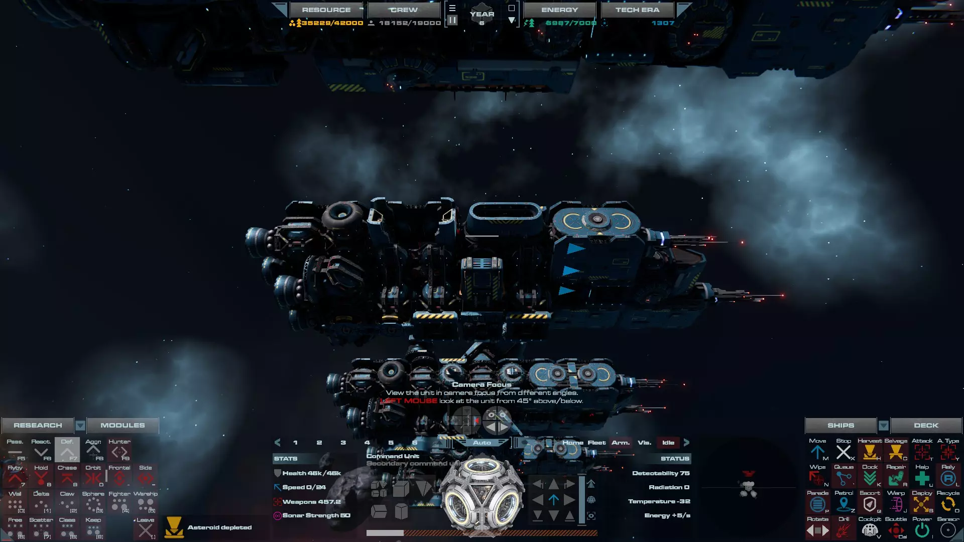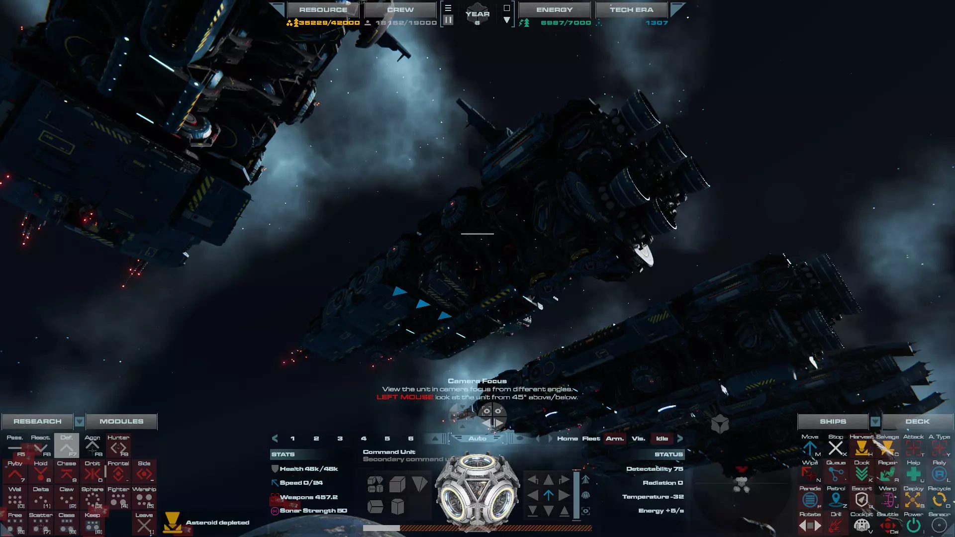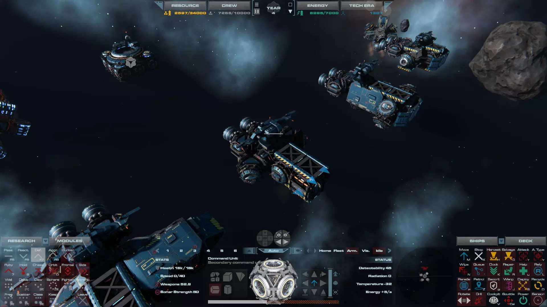 RU值:19000 船员:1748 建造时间:1625秒 指挥核心生命值:48000 速度:27 已装备:超光速引擎和抑制器、6门转管炮 基于加宽的重型巡洋舰船体建造,航母是生产型主力舰的基准型号。配备有1个轻型设施、1个重型设施、2个资源投放点及仓库、1个维修舱、6座用于防御或攻击的专用炮塔,以及舰桥旁2个用于安装模块的自由插槽——其中一个特别推荐安装超光速引擎(没错,我确认过,它能装进去)。这是一艘适合专门进行辅助舰队生产或战斗中生产的舰船。由于其高昂的成本和维护费用,建议建造1艘,最多2艘,这已足以满足其功能需求。超级主力舰 这些是大型主力舰,设计定位为指挥中心的辅助旗舰,也是主力舰级别中的顶尖存在。它们拥有更厚重的装甲和更强大的武器系统,包括重型炮塔和导弹设施,是应对任何威胁的终极舰船。虽然在第二阶段就能解锁,但强烈建议在第三阶段再大量建造,此时建造范围足以容纳这种尺寸的舰船,并且你的经济和科技水平也能让它们发挥全部实力。所有超级主力舰都配备了重要的偏转装甲、至少一个维修舱以及至少一个用于舰载机维护的轻型设施。 战列巡洋舰