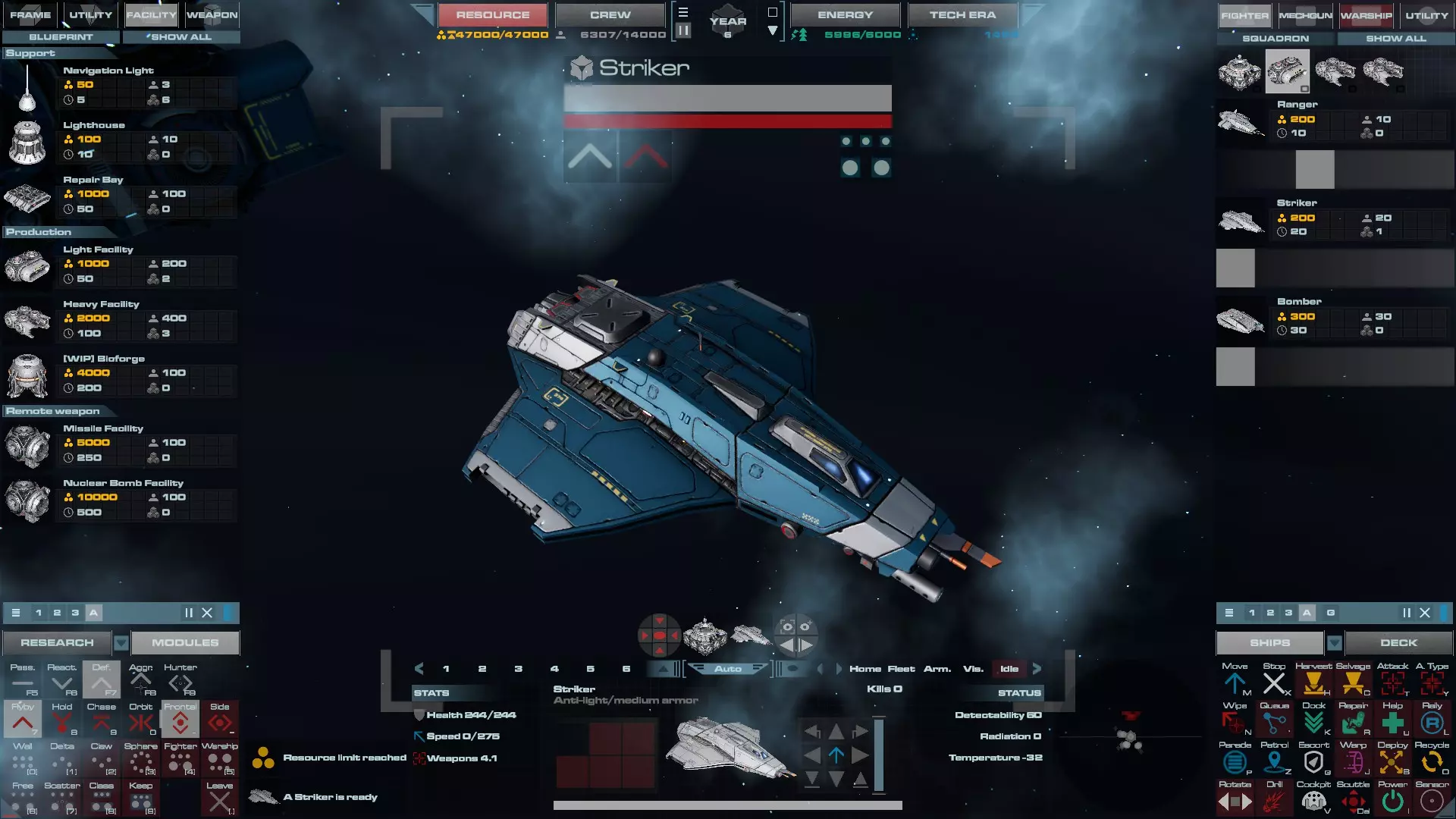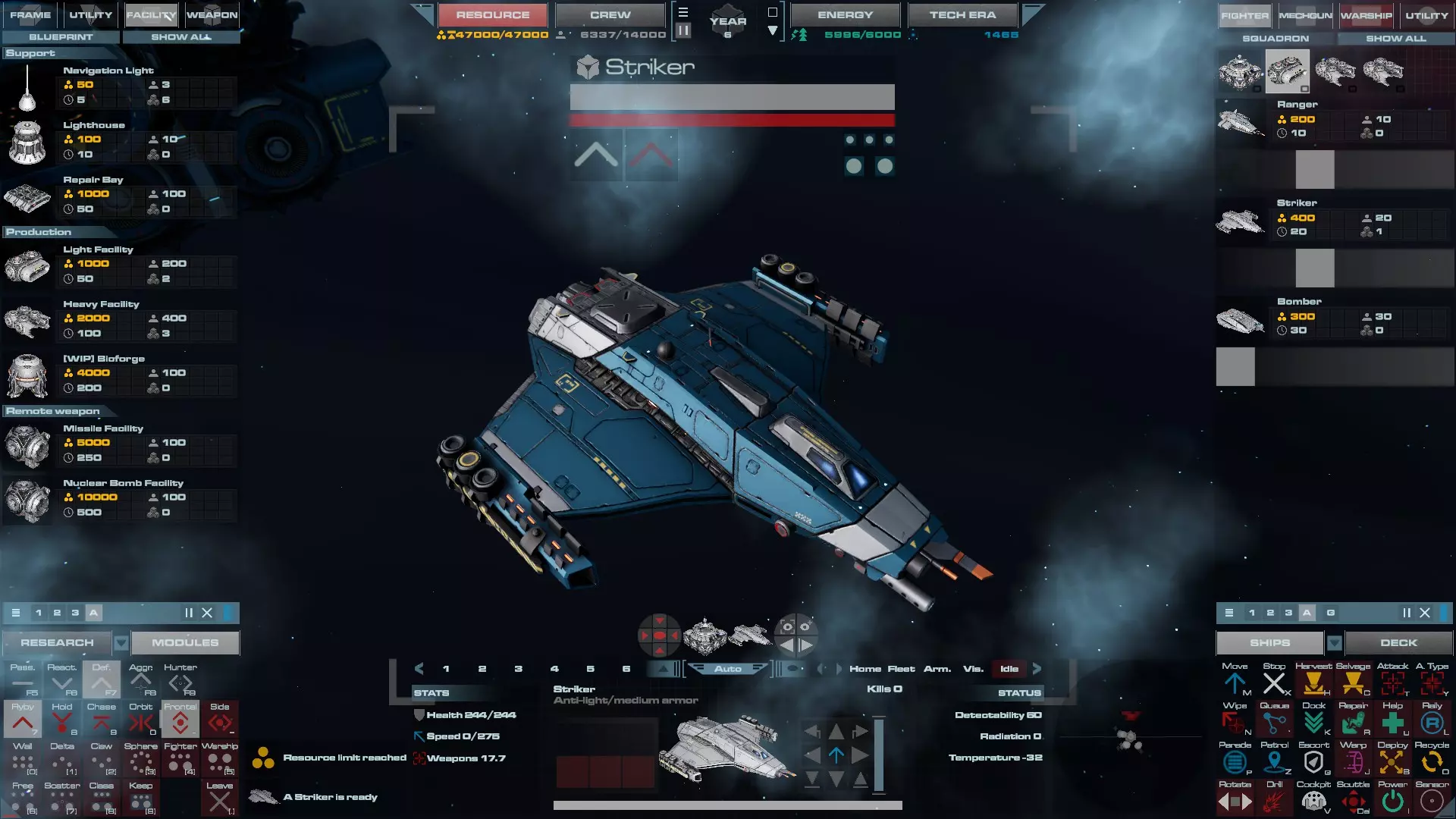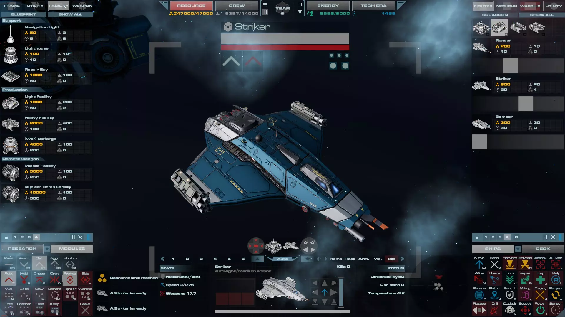 RU值:200-600 乘员:20 建造时间:20秒 生命值:180/201/223/244/266/288/323 速度:202/22250/275/299/330 配备:1门自动炮,2个可定制机翼插槽 打击者是该类别中第二种可用的战斗机,也是你通过轻型设施解锁的第一种战斗机。它比游骑兵拥有更高的生命值、更快的速度和略高的基础伤害。这艘舰船专为对抗轻型和中型装甲目标而设计,是反打击 craft 的战斗机。不过,和其他战斗机一样,它相对其他舰船较弱,因此应用于快速掠过和首次打击。建议将它们编成5-7架的中队,采用快速掠过战术,并使用三角或墙式编队。 它有两个可以解锁的主要技能。速度爆发赋予舰船快速爆发速度的能力,提升其攻击速度。一旦建造轻型设施,即可在1级解锁该能力。机翼武器允许突击舰在机翼上额外加装两件武器,使其伤害至少提升三倍。但这项技术需在速度爆发之后于2级解锁,这使得突击舰在游戏初期相对弱势,因此在获得机翼武器前,我会让突击舰或其他舰船占据该位置。 装备配置 拦截机: