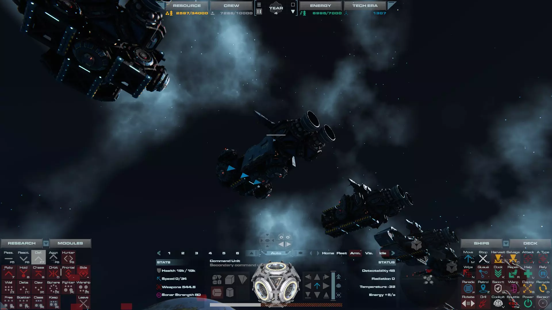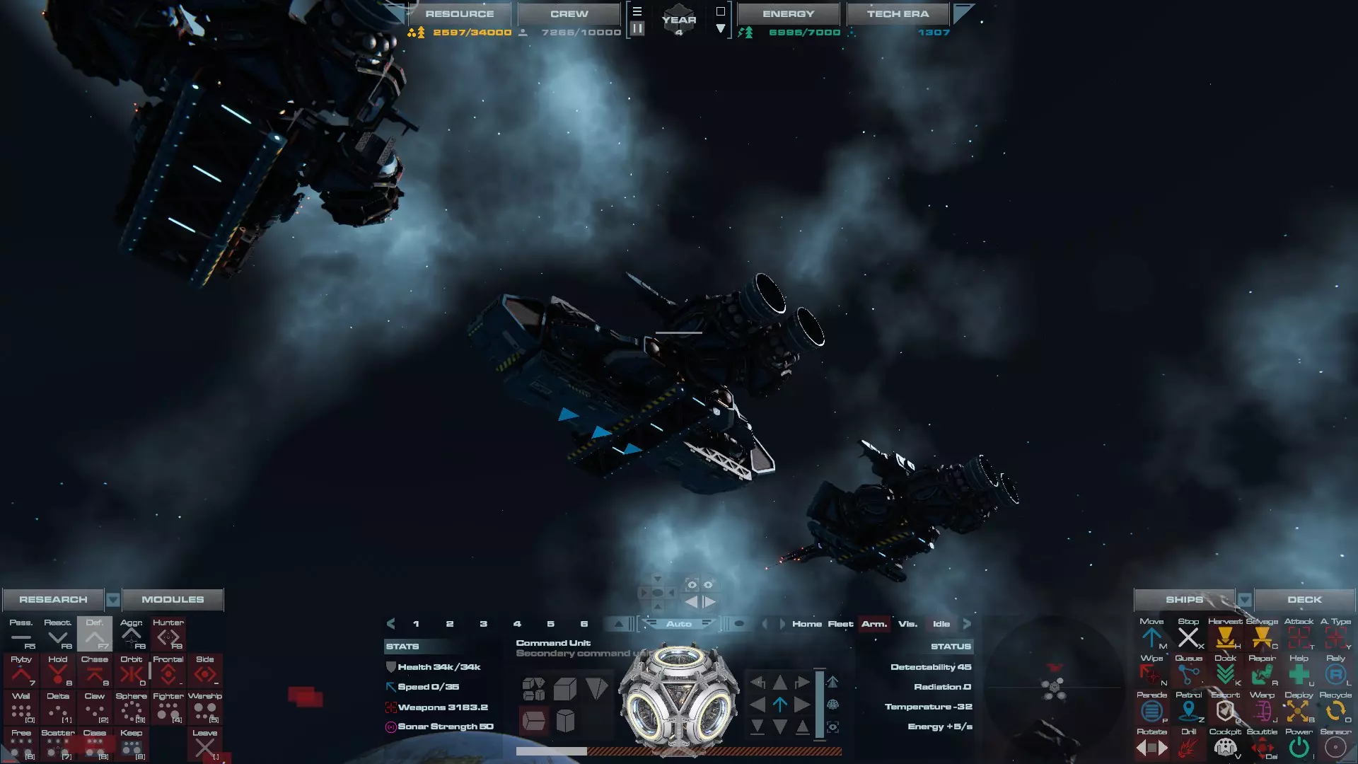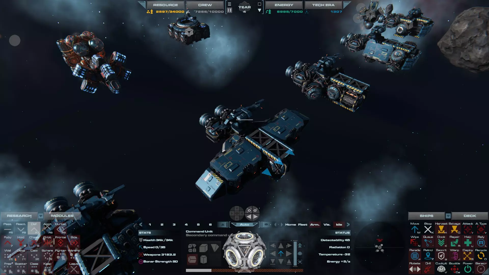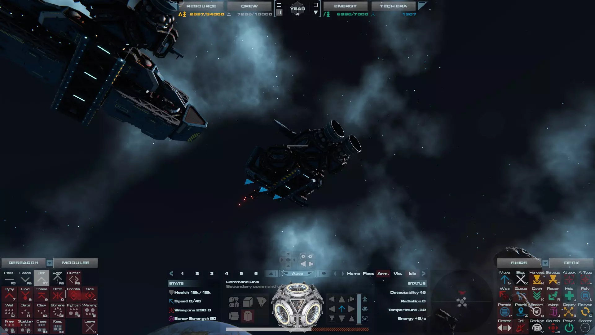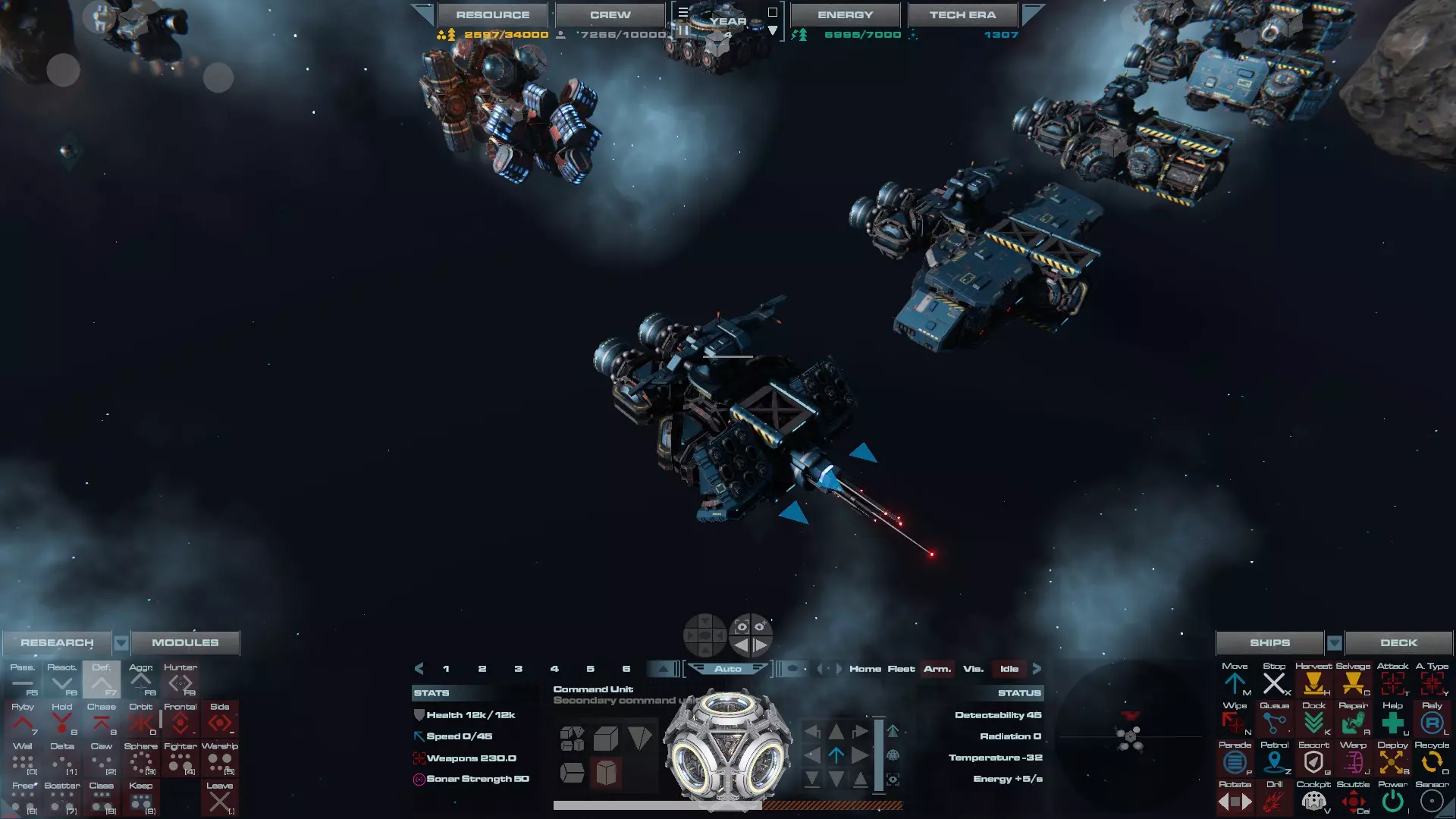 RU值:13300 船员:825 建造时间:935秒 指挥舱生命值:19000 速度:35 配备:4门加特林机炮、2门动能加农炮 基于HW3的重型压制护卫舰设计,这艘重型护卫舰擅长应对突击艇或集群敌人,同时具备足够的装甲和火力来对抗任何轻型战舰。 多光束护卫舰