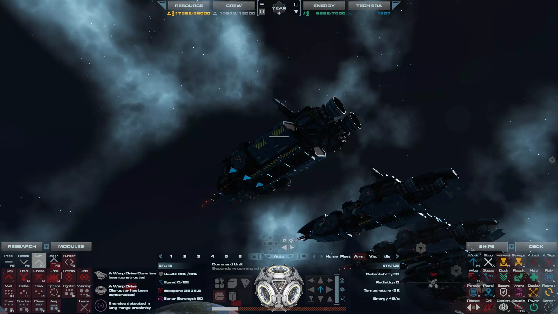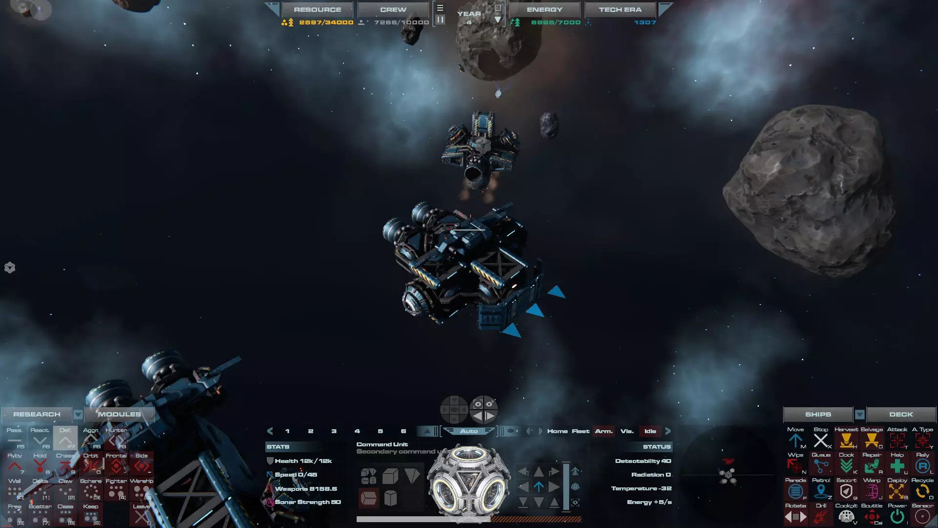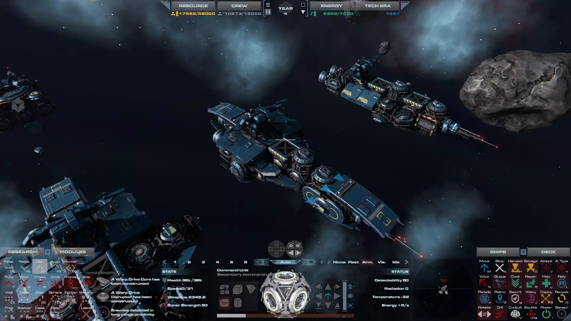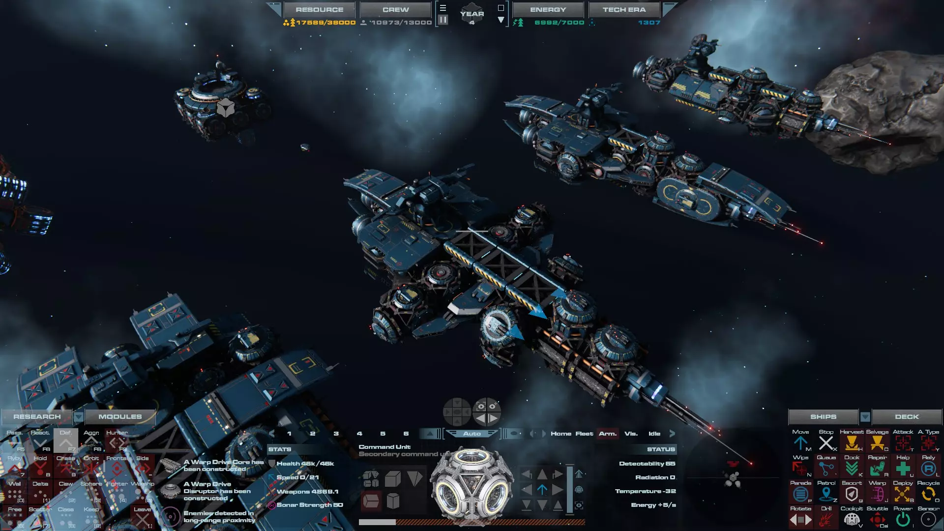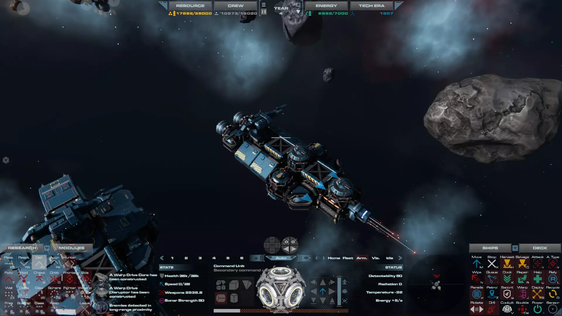 RU值:13300 船员:825 建造时间:935秒 指挥舱生命值:19000 速度:35 配备:4门加特林机炮、2门动能加农炮 基于HW3的重型压制护卫舰设计,这艘重型护卫舰擅长应对突击艇或集群敌人,同时具备足够的装甲和火力来对抗任何轻型战舰。 多光束护卫舰