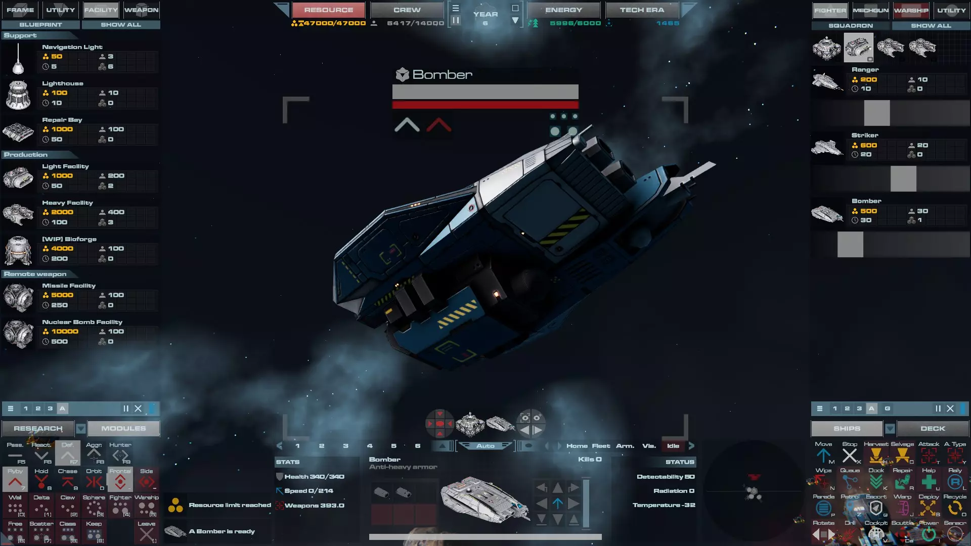 RU值:300-500 乘员:30 建造时间:30秒 生命值:252/280/310/340/370/400 速度:157/176/195/214/232/251 配备:2门等离子发射器,可定制腹部插槽 轰炸机是该级别可使用的第三种战斗机。研究高级战斗机后即可解锁轰炸机。顾名思义,它们是攻击型轰炸机,设计用于对抗重装甲目标,例如护卫舰和主力舰。它比普通战斗机速度慢,因此不适合与战斗机正面交战,需要战斗机护航。建议以5或6架为一个中队,采用“飞越”战术和“爪型”编队,集中火力攻击单个目标。 配置 攻击轰炸机:无导弹舱的轰炸机。这是轰炸机的早期游戏版本,设计用于对抗护卫舰,直到你获得导弹舱,不过你可能在建造这种轰炸机之前就已经获得导弹舱了。它们也可作为更经济的替代选择,因为轰炸机的等离子炮本身仍能造成可观的伤害。 舰队轰炸机: