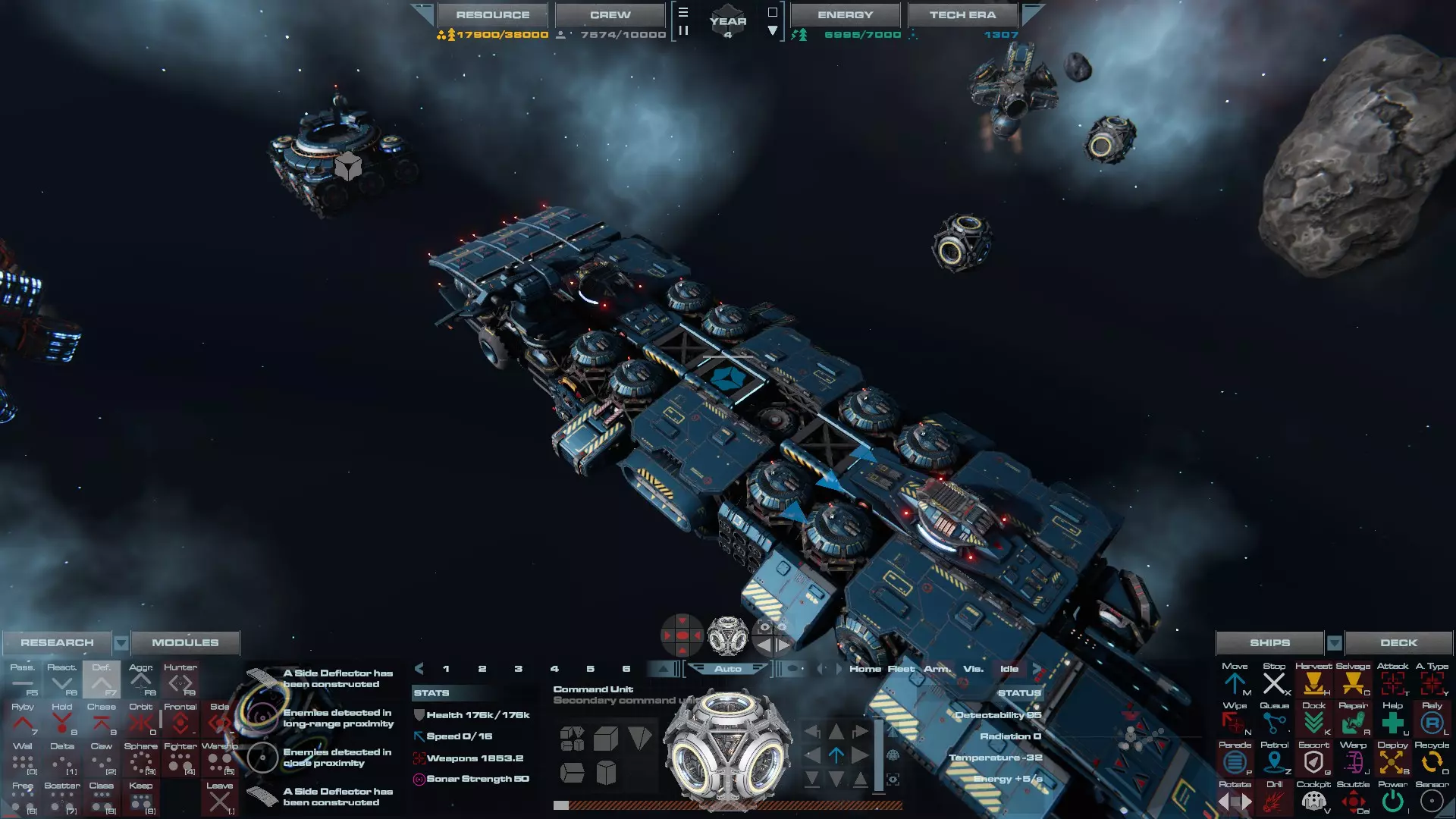 RU值:9800 船员:825 建造时间:705秒 指挥核心生命值:12000 速度:45 配备:4个维修舱 作为专用支援战舰,该舰船因其维修舱而固定为2级,但它能轻松为几乎所有舰船提供强大的舰队支援。一艘可能就已足够,但多几艘也无妨。 主力旗舰 这些旗舰是为【ERA ONE】设计的核心舰船。它们拥有厚重的武装和装甲,是多用途的主力旗舰,既能清扫轻型护卫舰和突击艇,又能对更高级别的舰船造成可观伤害。所有旗舰建造均需钛合金和偏转装甲,大多数配置会搭载1级和2级武器,但也可使用更多武器。注意:虽然舰船在武器和超光速引擎/干扰器方面会显示已建造,但实际上它们的蓝图中并不包含这些模块。原因有二:一是这样可以避免因超光速引擎或任何武器而导致的系统死锁;二是这样能让舰船更轻松地根据其作战角色进行武装,同时减少资源单位的浪费。但正因为如此,资源单位成本、船员数量和建造时间将不会把这些额外模块计算在内。 驱逐舰