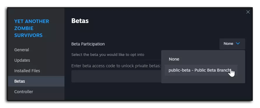 进入【测试版】选项卡,点击右侧的【无】下拉菜单,选择【public-beta】选项。您可以随时通过再次选择【无】来返回游戏的默认版本。