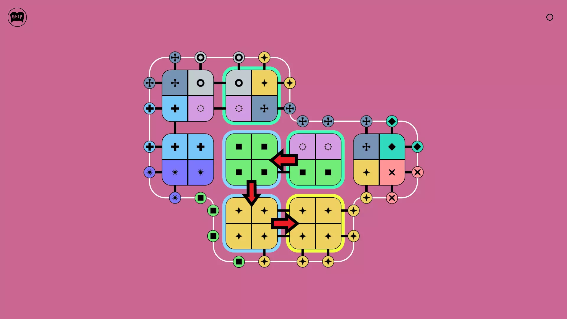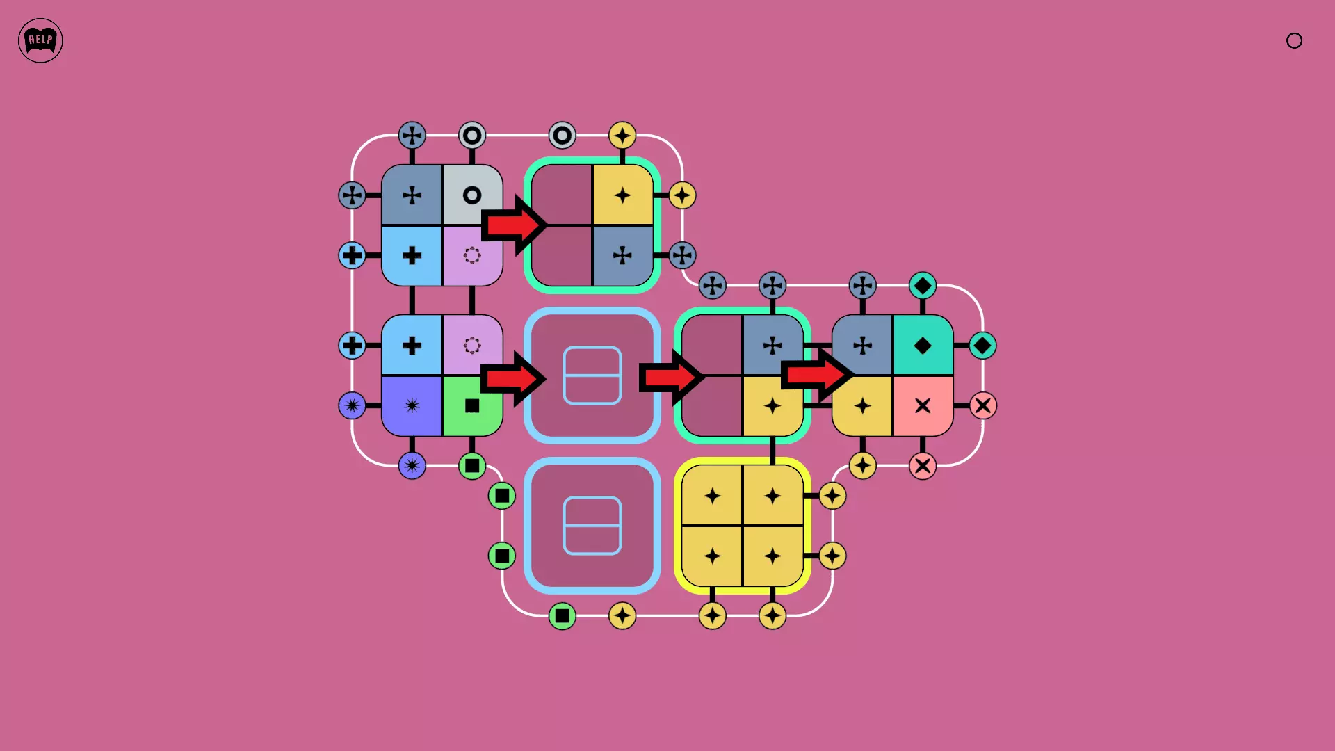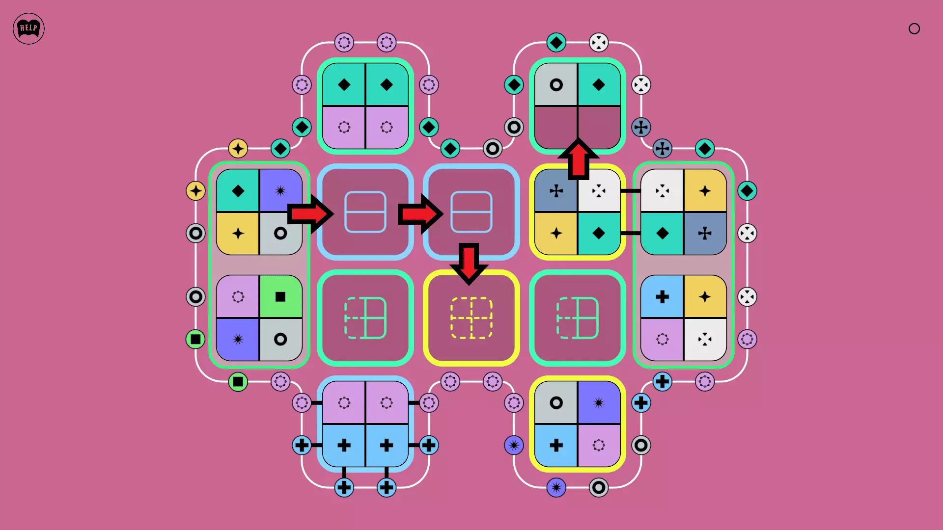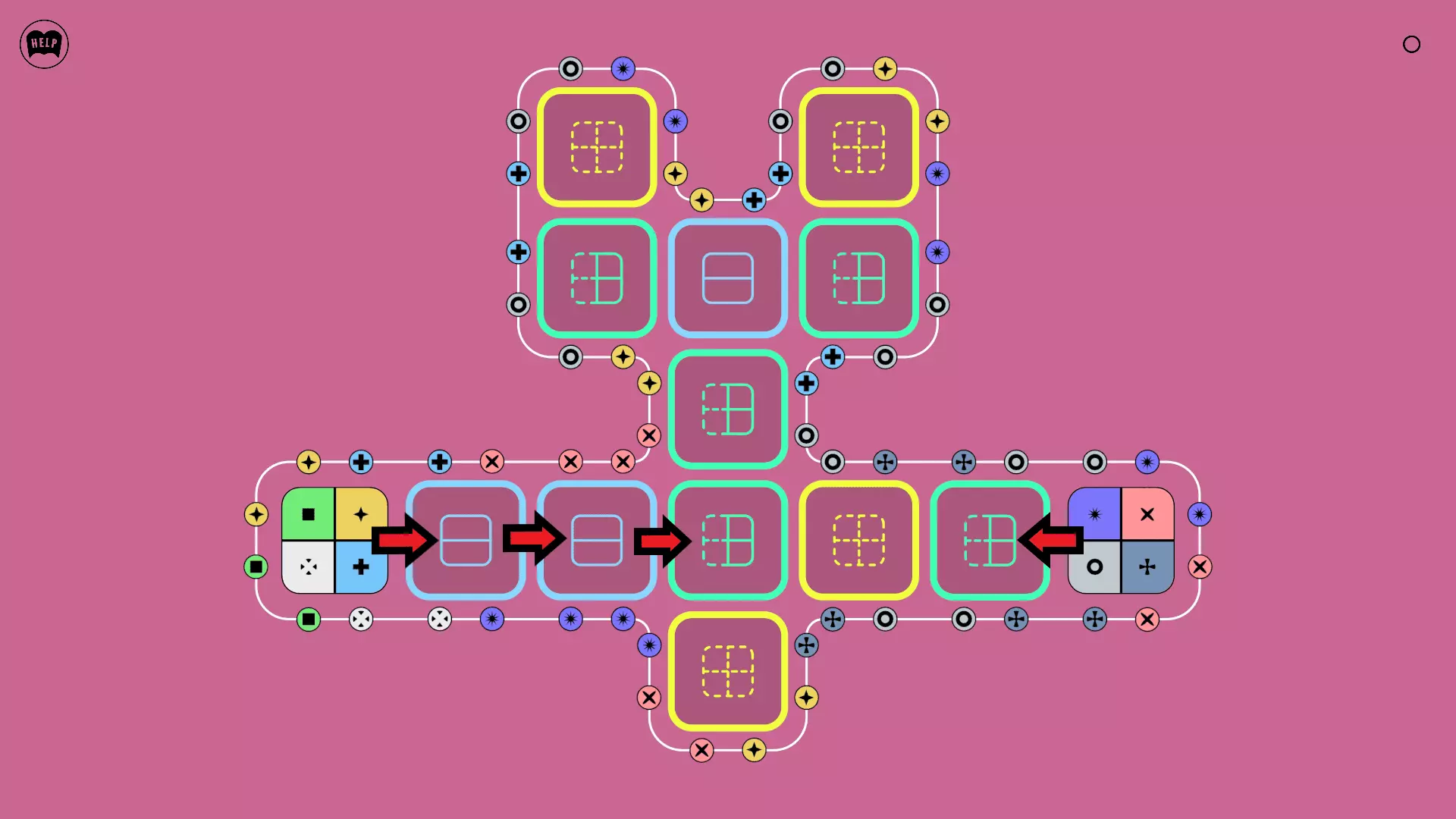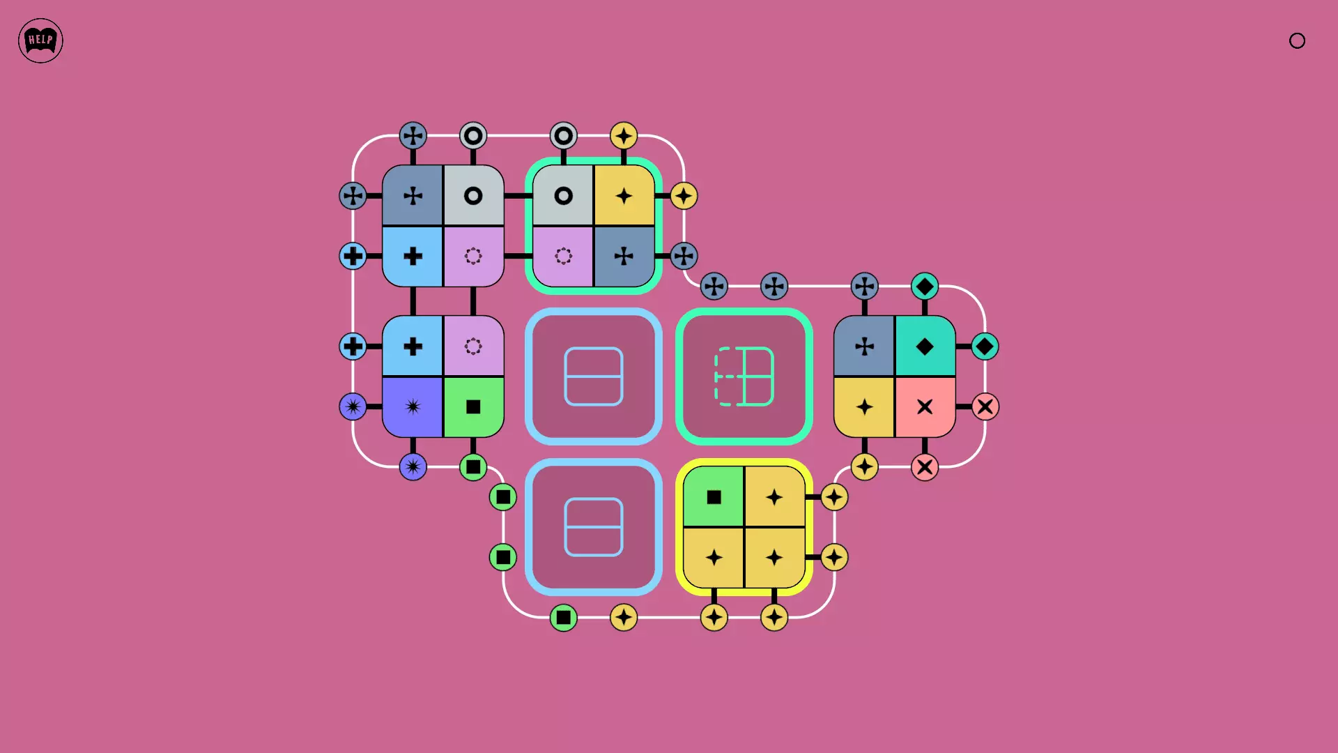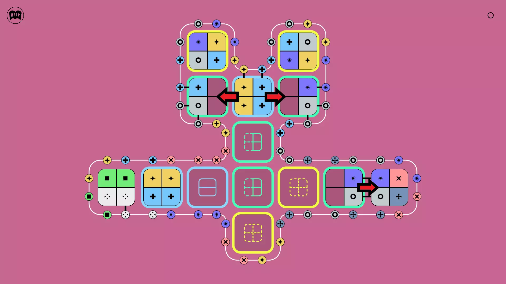 《Lines On Sides》关卡71-84图文攻略 简介 前18个关卡仅提供解决方案,因为解决这些关卡只需旋转或交换方块。 第19关及后续关卡包含步骤说明,解释如何分割、复制和转移方块。 由于Steam的限制,我不得不将本攻略分为两部分。 规则 旋转方块,直到方块上的图标与线条上或相邻方块上的符号匹配。当符号匹配时,它们之间会绘制一条线。 第7关引入了交换被绿线圈住的方块的功能。第14关新增了无法旋转或移动的方块,这类方块外有粗黑线环绕。 第19关新增了分裂平台,该平台外有蓝色线条环绕。此平台可将方块分裂为两个,或将两个方块合并为一个。