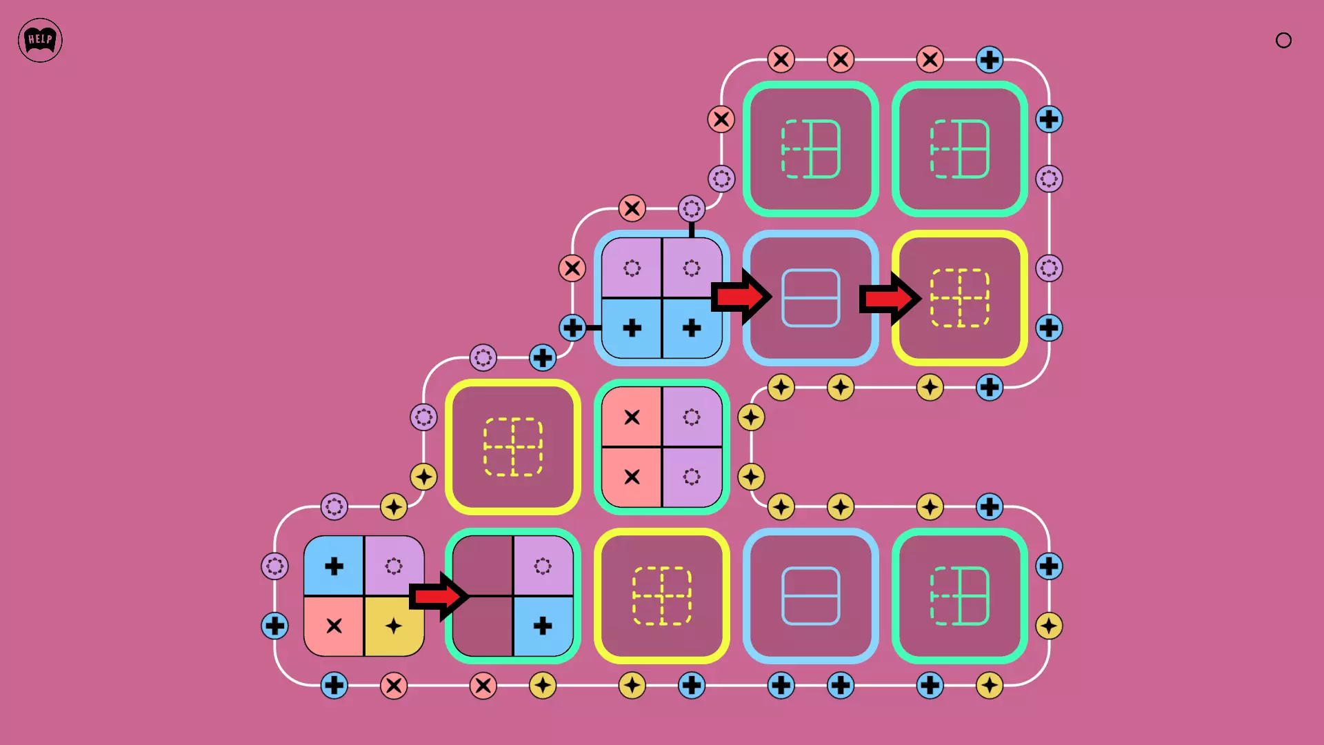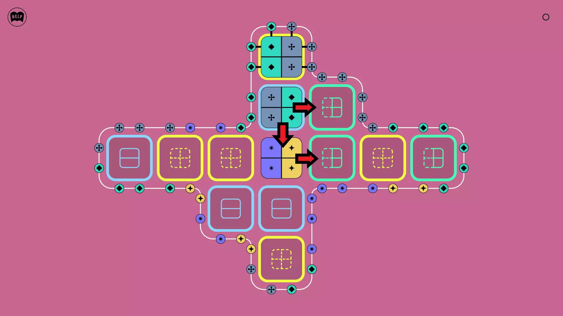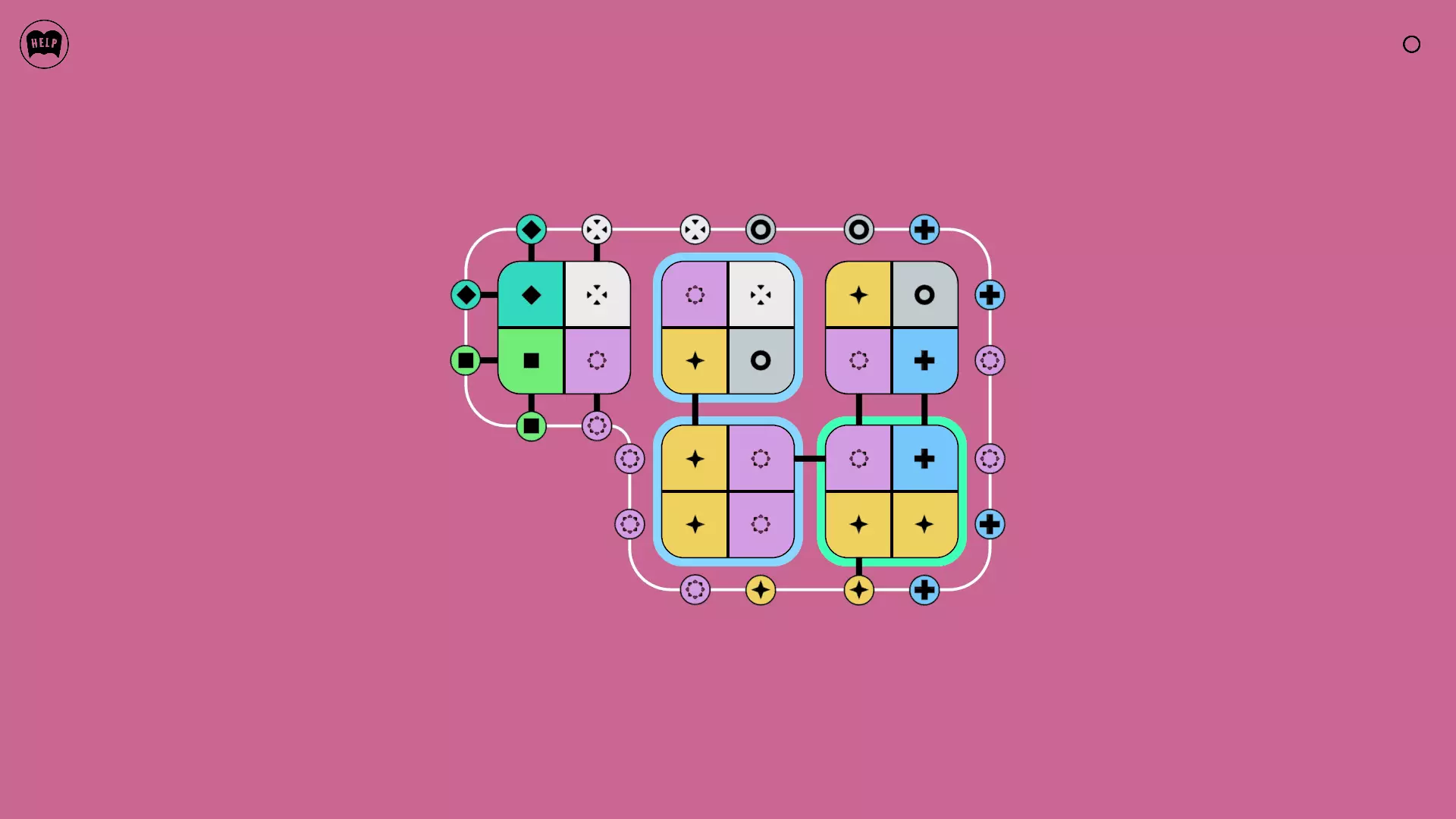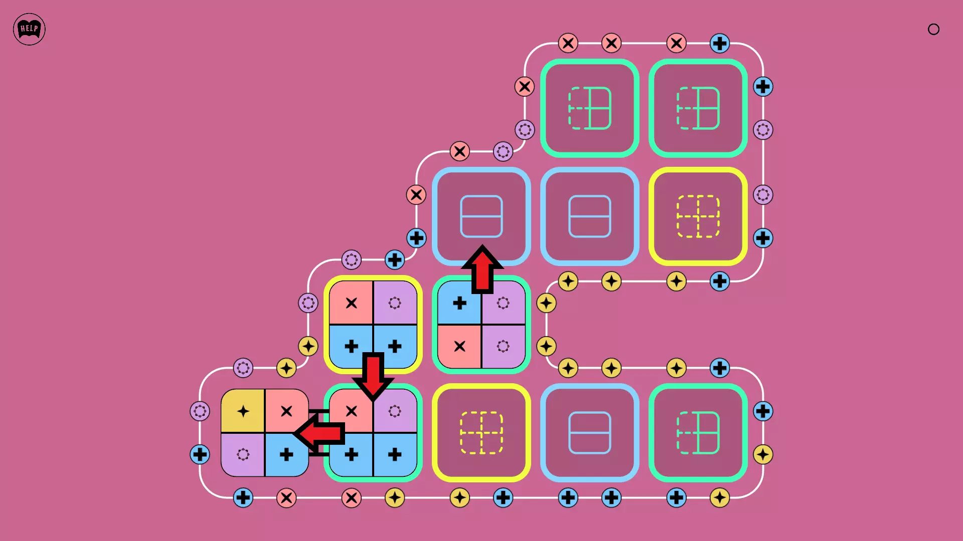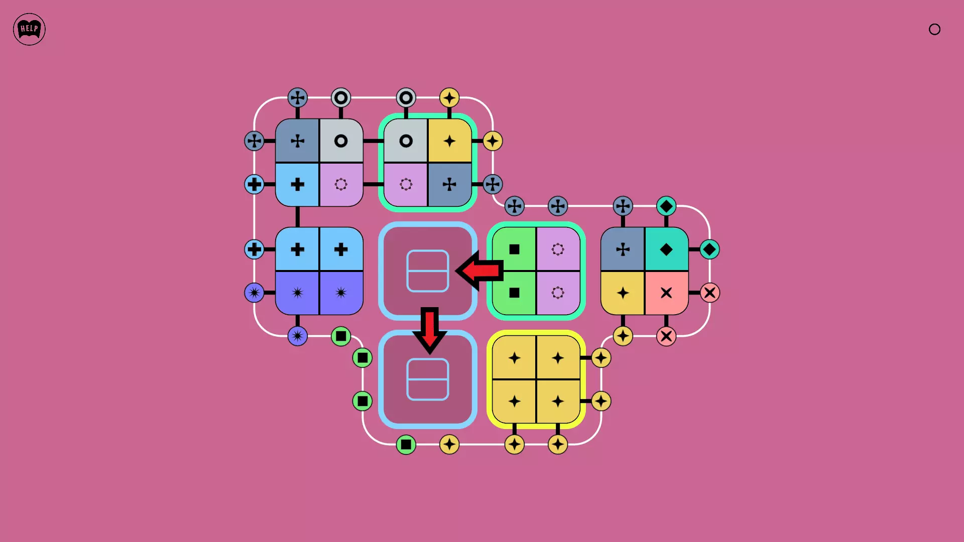 《Lines On Sides》关卡71-84图文攻略 简介 前18个关卡仅提供解决方案,因为解决这些关卡只需旋转或交换方块。 第19关及后续关卡包含步骤说明,解释如何分割、复制和转移方块。 由于Steam的限制,我不得不将本攻略分为两部分。 规则 旋转方块,直到方块上的图标与线条上或相邻方块上的符号匹配。当符号匹配时,它们之间会绘制一条线。 第7关引入了交换被绿线圈住的方块的功能。第14关新增了无法旋转或移动的方块,这类方块外有粗黑线环绕。 第19关新增了分裂平台,该平台外有蓝色线条环绕。此平台可将方块分裂为两个,或将两个方块合并为一个。