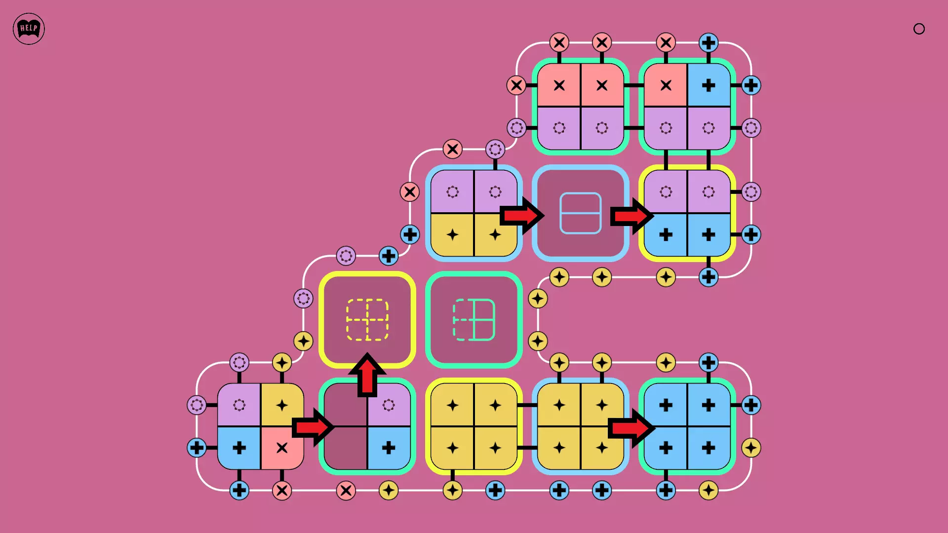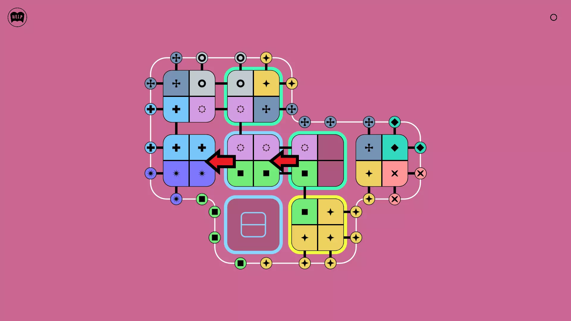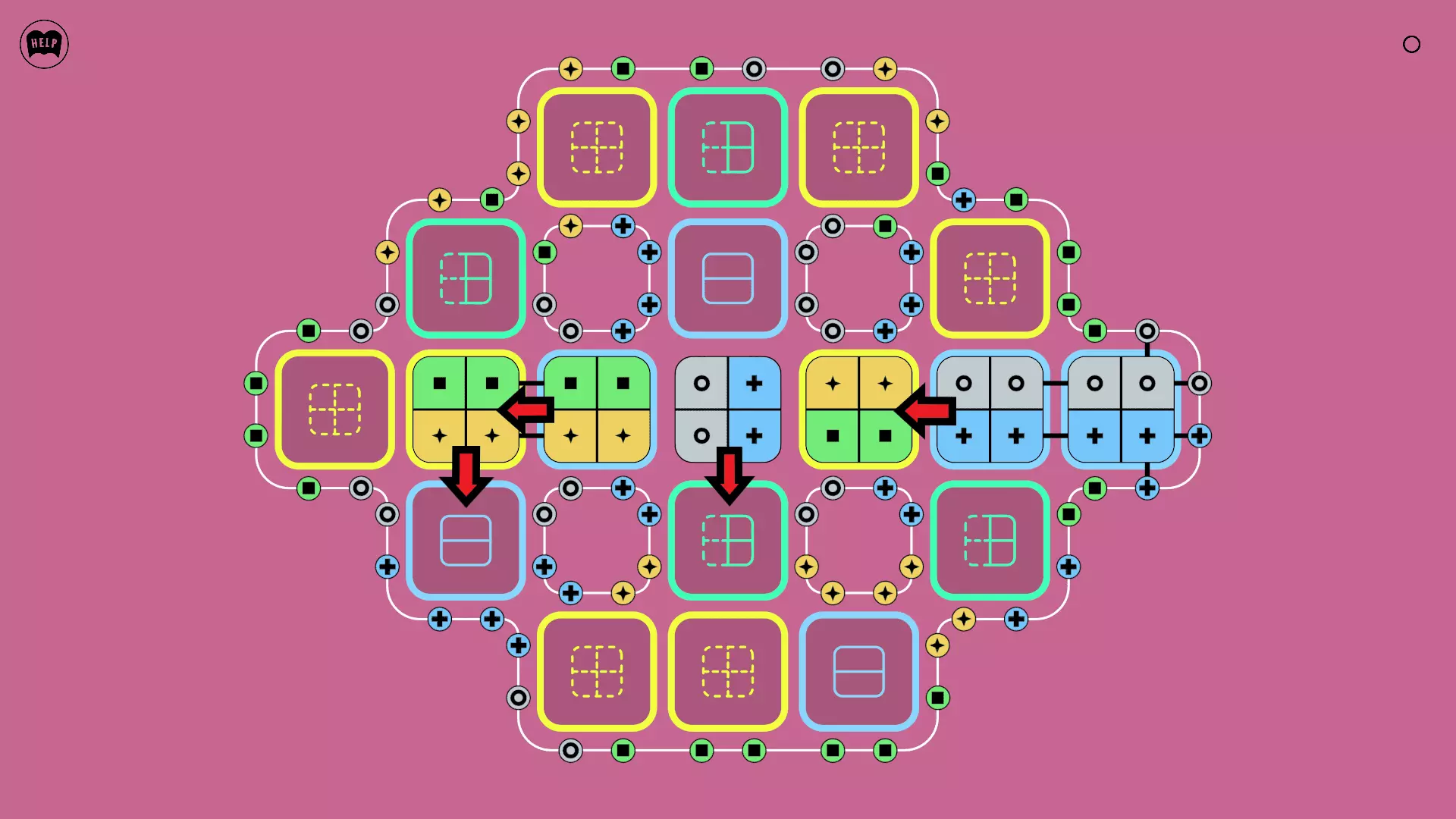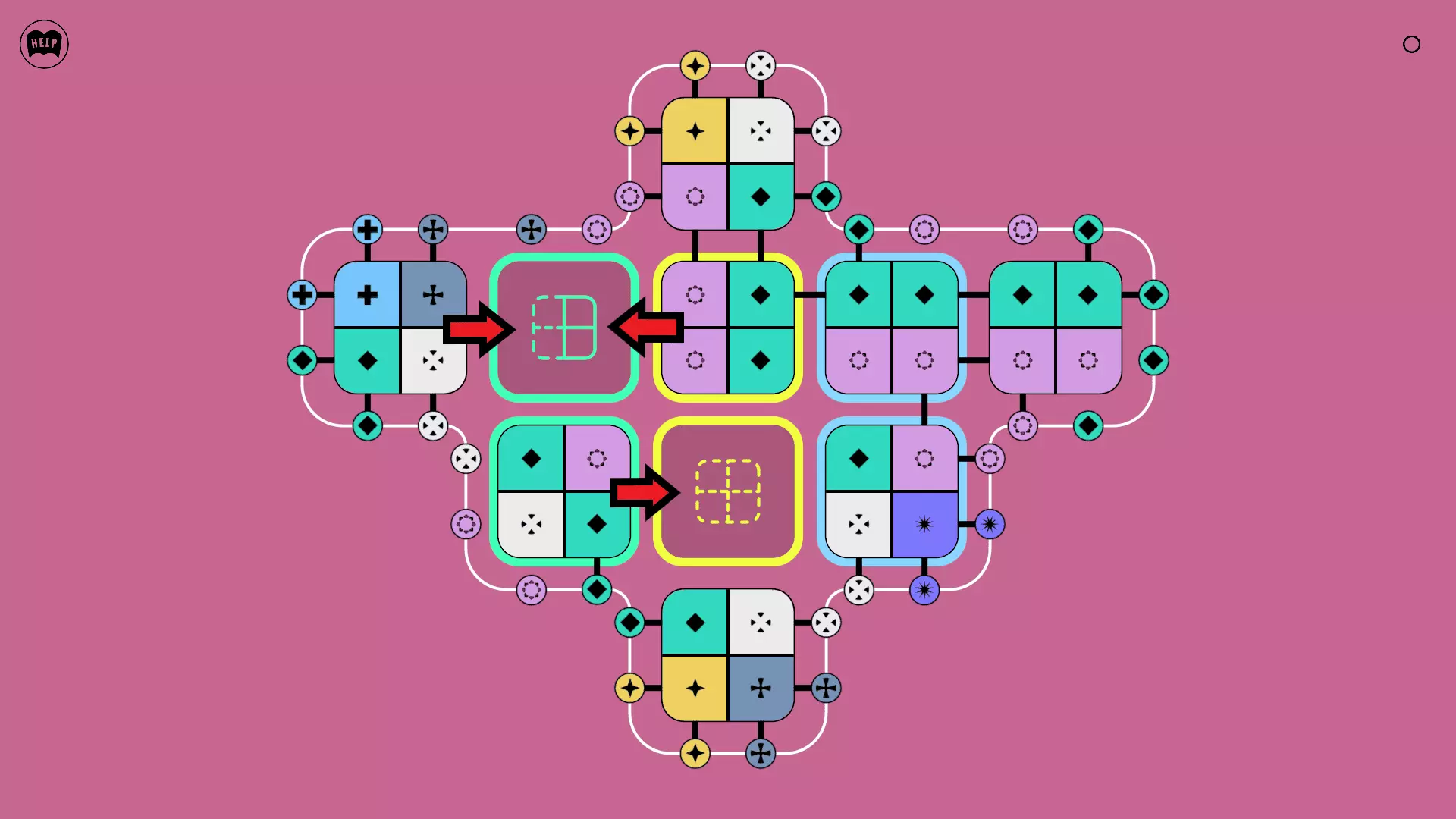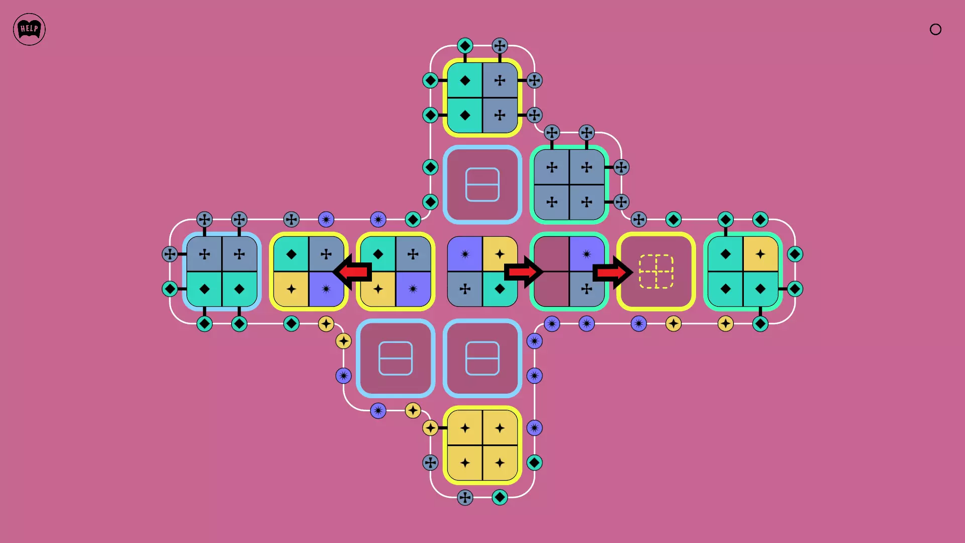 《Lines On Sides》关卡71-84图文攻略 简介 前18个关卡仅提供解决方案,因为解决这些关卡只需旋转或交换方块。 第19关及后续关卡包含步骤说明,解释如何分割、复制和转移方块。 由于Steam的限制,我不得不将本攻略分为两部分。 规则 旋转方块,直到方块上的图标与线条上或相邻方块上的符号匹配。当符号匹配时,它们之间会绘制一条线。 第7关引入了交换被绿线圈住的方块的功能。第14关新增了无法旋转或移动的方块,这类方块外有粗黑线环绕。 第19关新增了分裂平台,该平台外有蓝色线条环绕。此平台可将方块分裂为两个,或将两个方块合并为一个。
