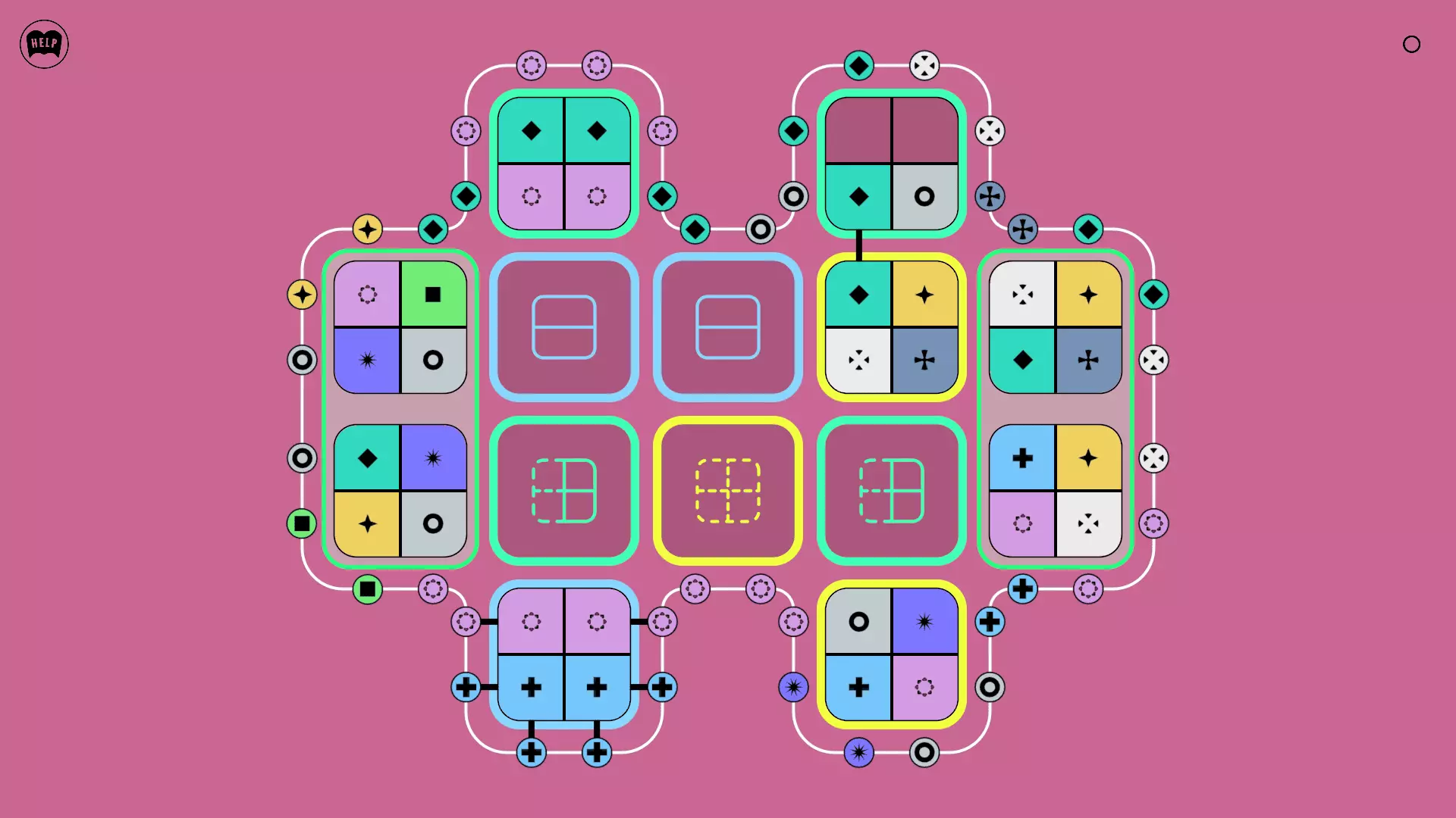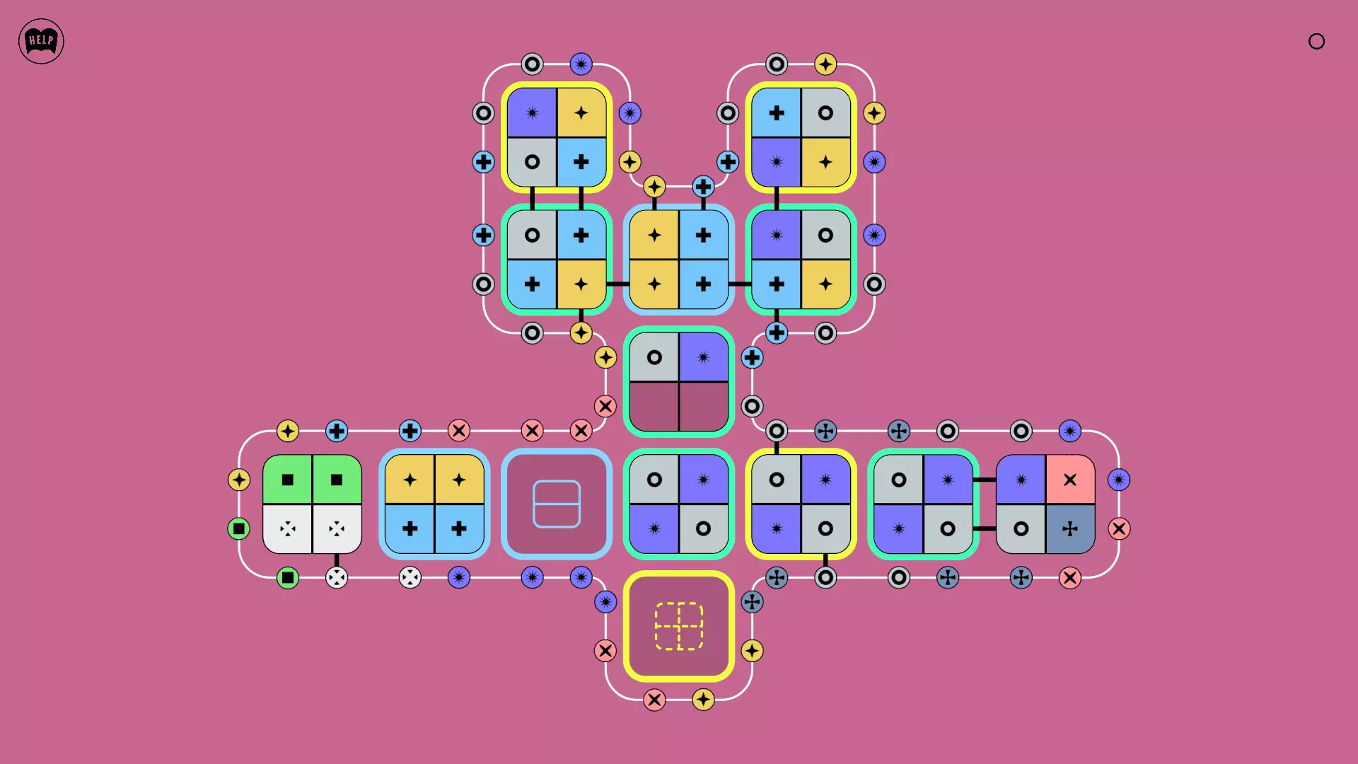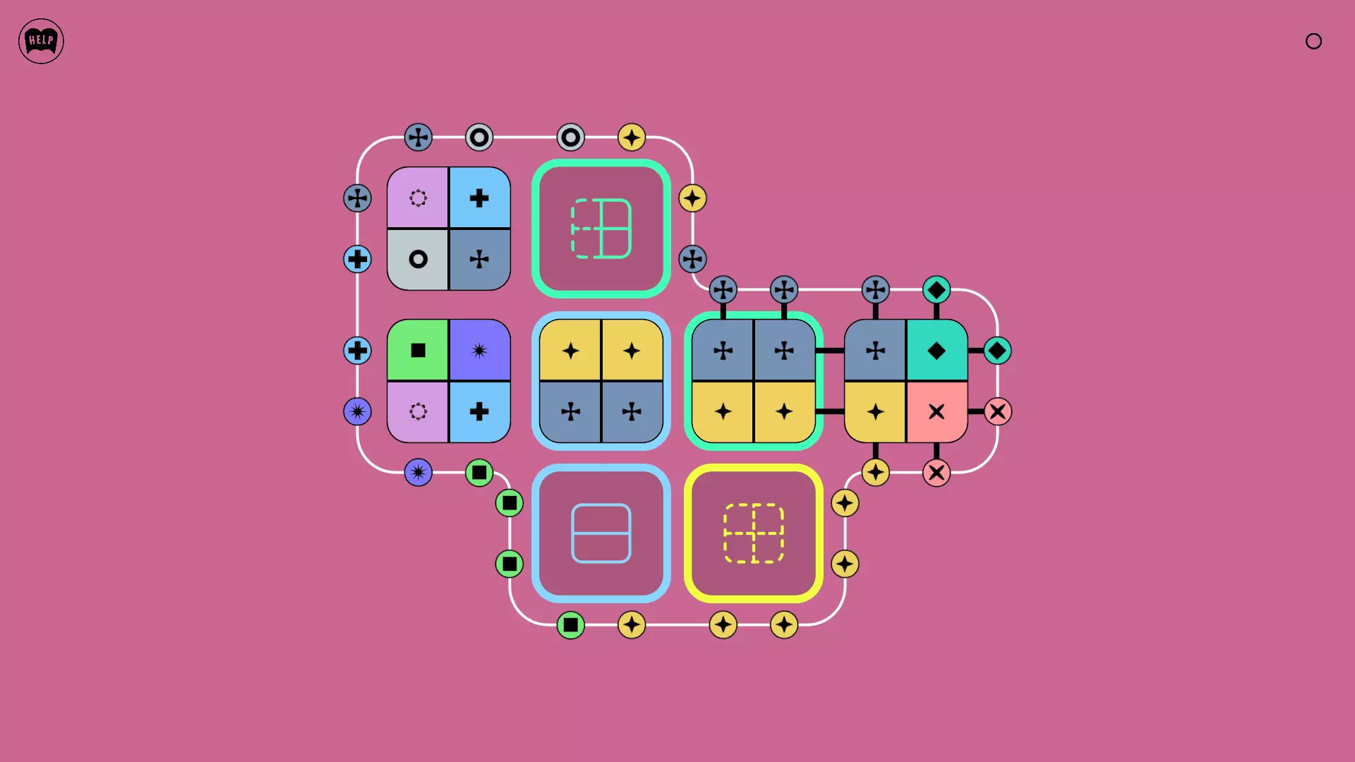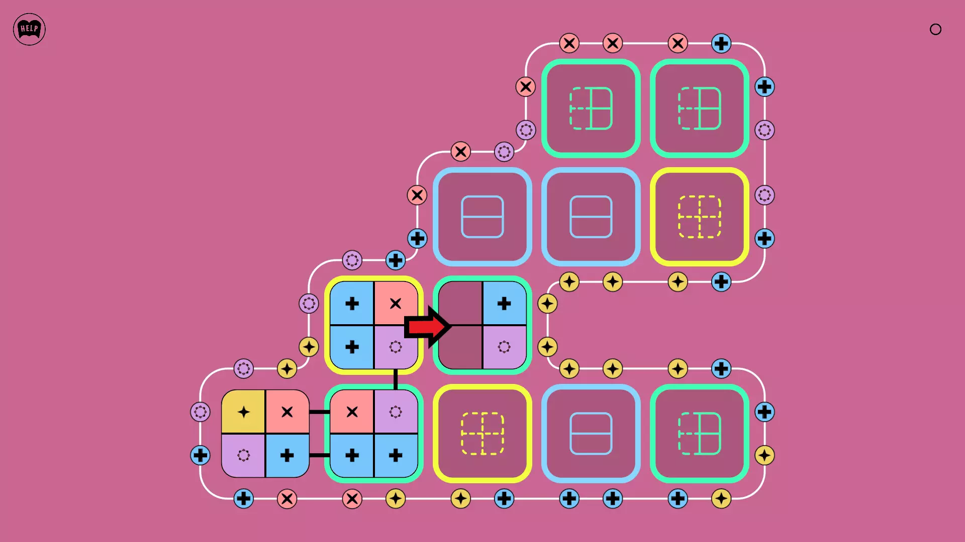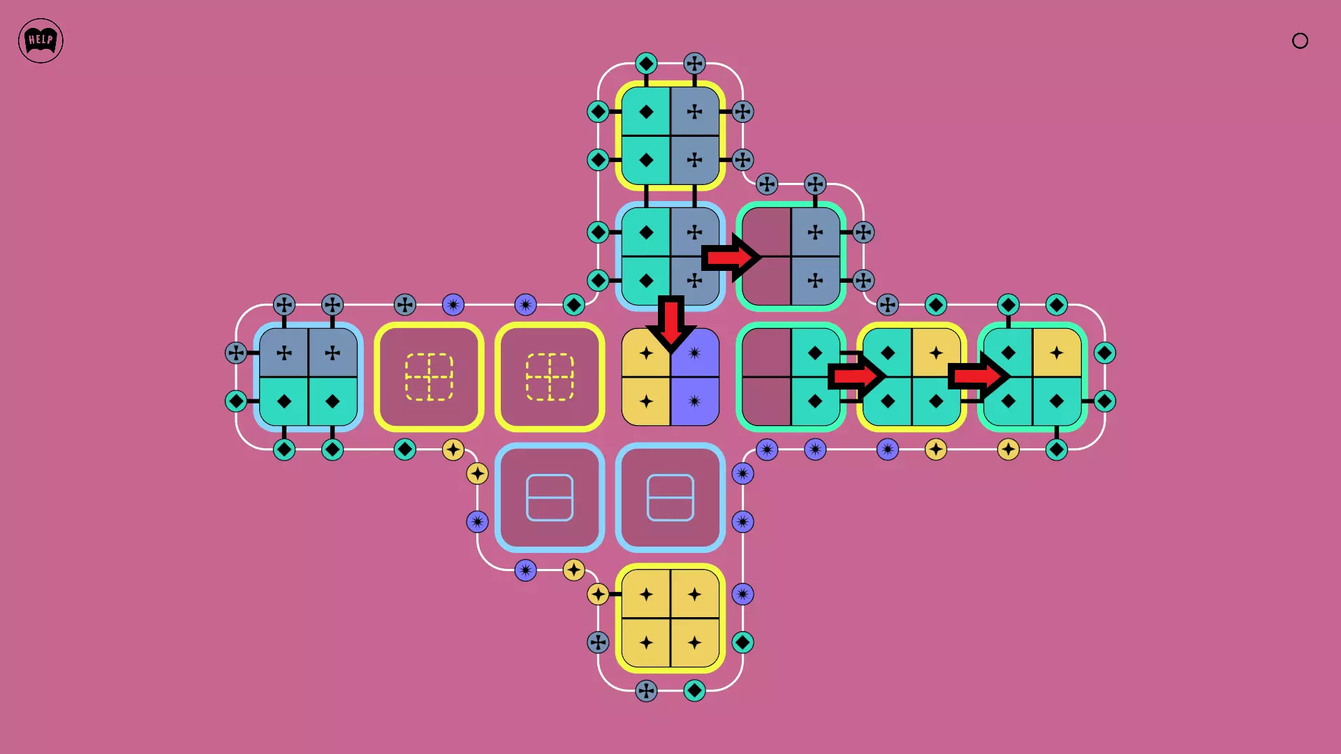 《Lines On Sides》关卡71-84图文攻略 简介 前18个关卡仅提供解决方案,因为解决这些关卡只需旋转或交换方块。 第19关及后续关卡包含步骤说明,解释如何分割、复制和转移方块。 由于Steam的限制,我不得不将本攻略分为两部分。 规则 旋转方块,直到方块上的图标与线条上或相邻方块上的符号匹配。当符号匹配时,它们之间会绘制一条线。 第7关引入了交换被绿线圈住的方块的功能。第14关新增了无法旋转或移动的方块,这类方块外有粗黑线环绕。 第19关新增了分裂平台,该平台外有蓝色线条环绕。此平台可将方块分裂为两个,或将两个方块合并为一个。