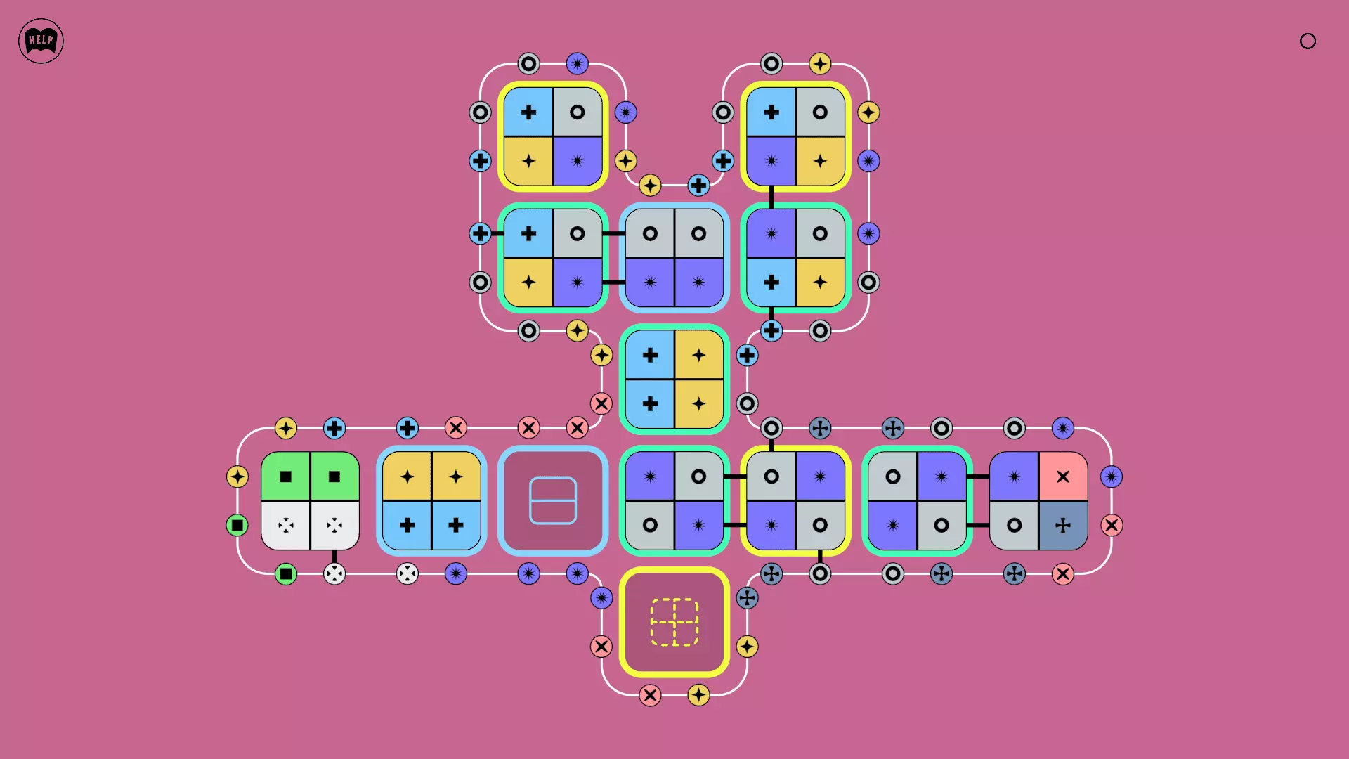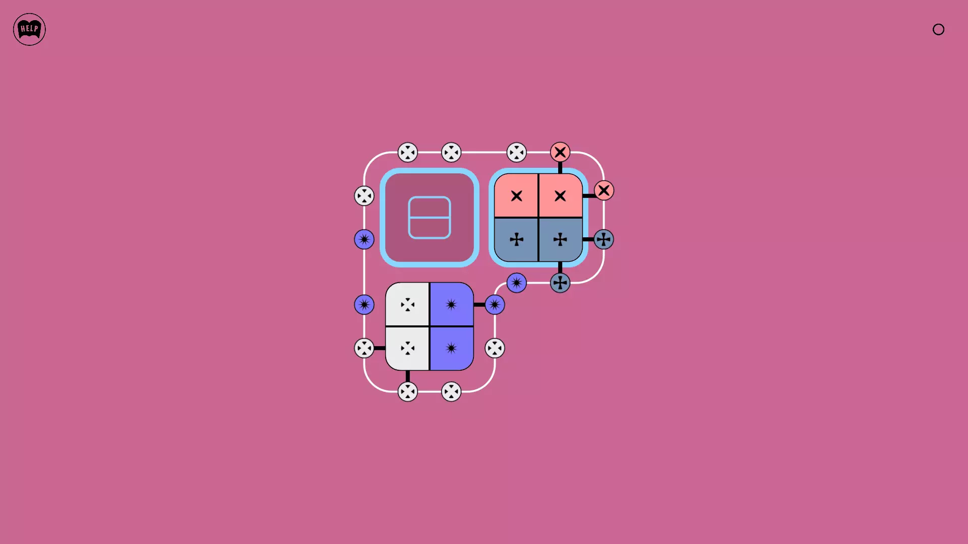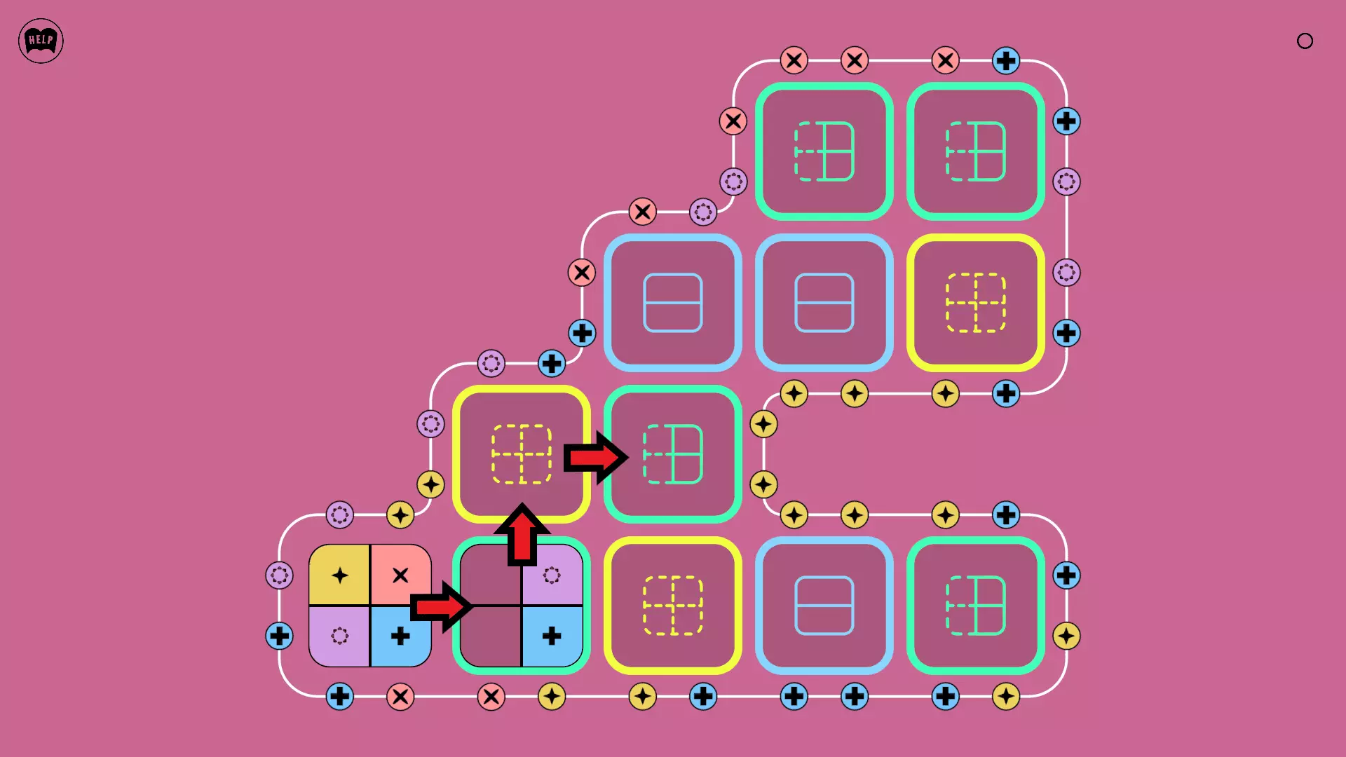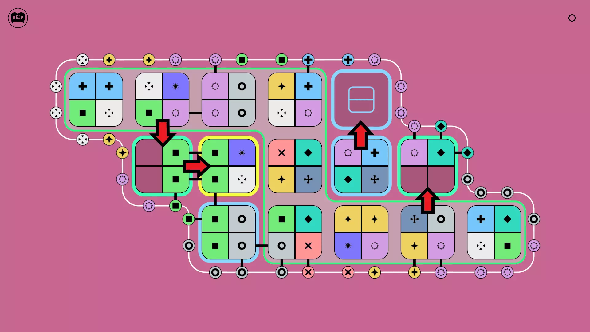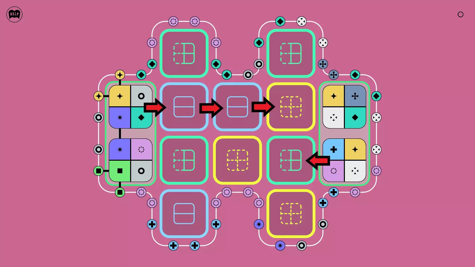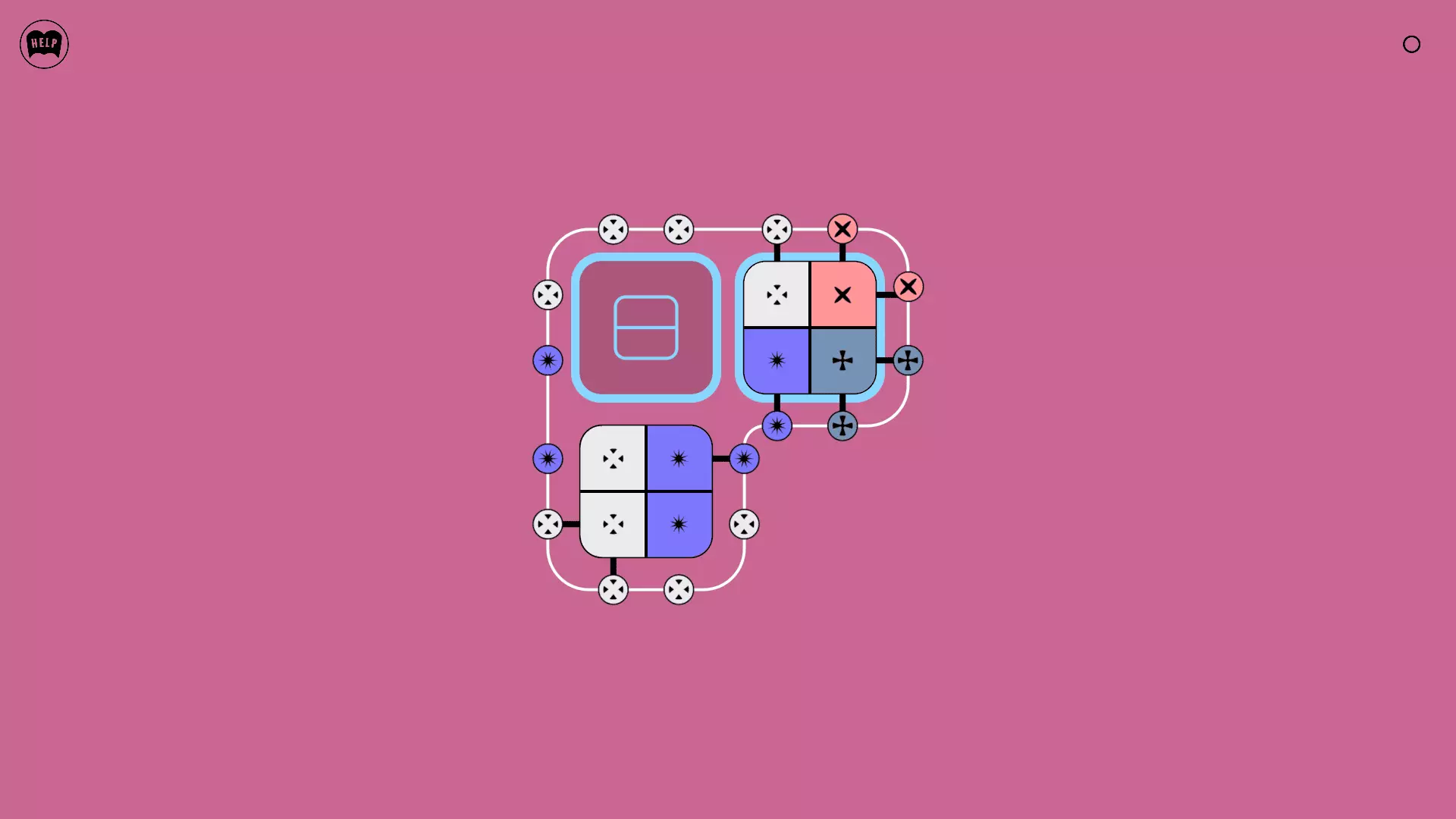 《Lines On Sides》关卡71-84图文攻略 简介 前18个关卡仅提供解决方案,因为解决这些关卡只需旋转或交换方块。 第19关及后续关卡包含步骤说明,解释如何分割、复制和转移方块。 由于Steam的限制,我不得不将本攻略分为两部分。 规则 旋转方块,直到方块上的图标与线条上或相邻方块上的符号匹配。当符号匹配时,它们之间会绘制一条线。 第7关引入了交换被绿线圈住的方块的功能。第14关新增了无法旋转或移动的方块,这类方块外有粗黑线环绕。 第19关新增了分裂平台,该平台外有蓝色线条环绕。此平台可将方块分裂为两个,或将两个方块合并为一个。